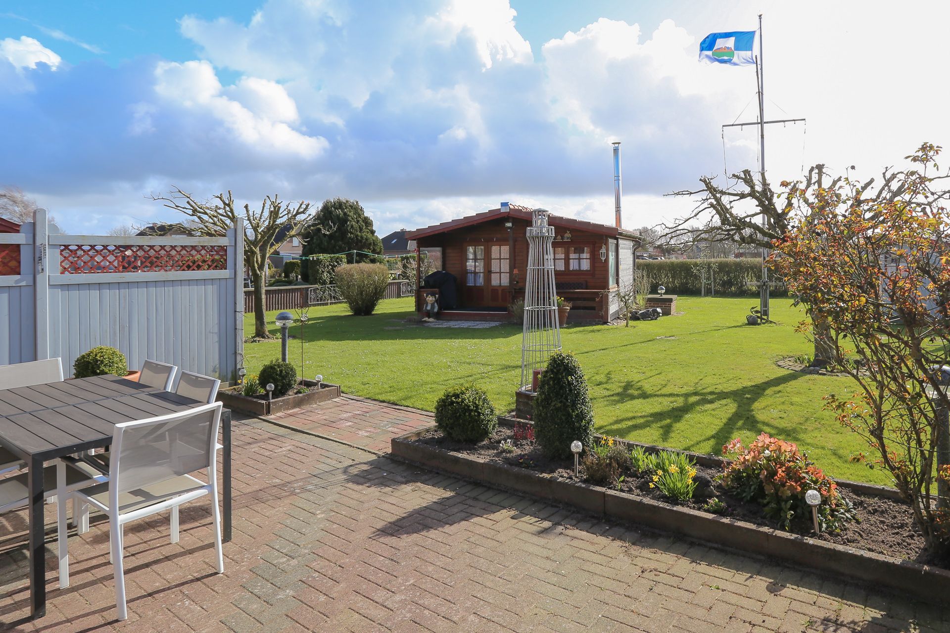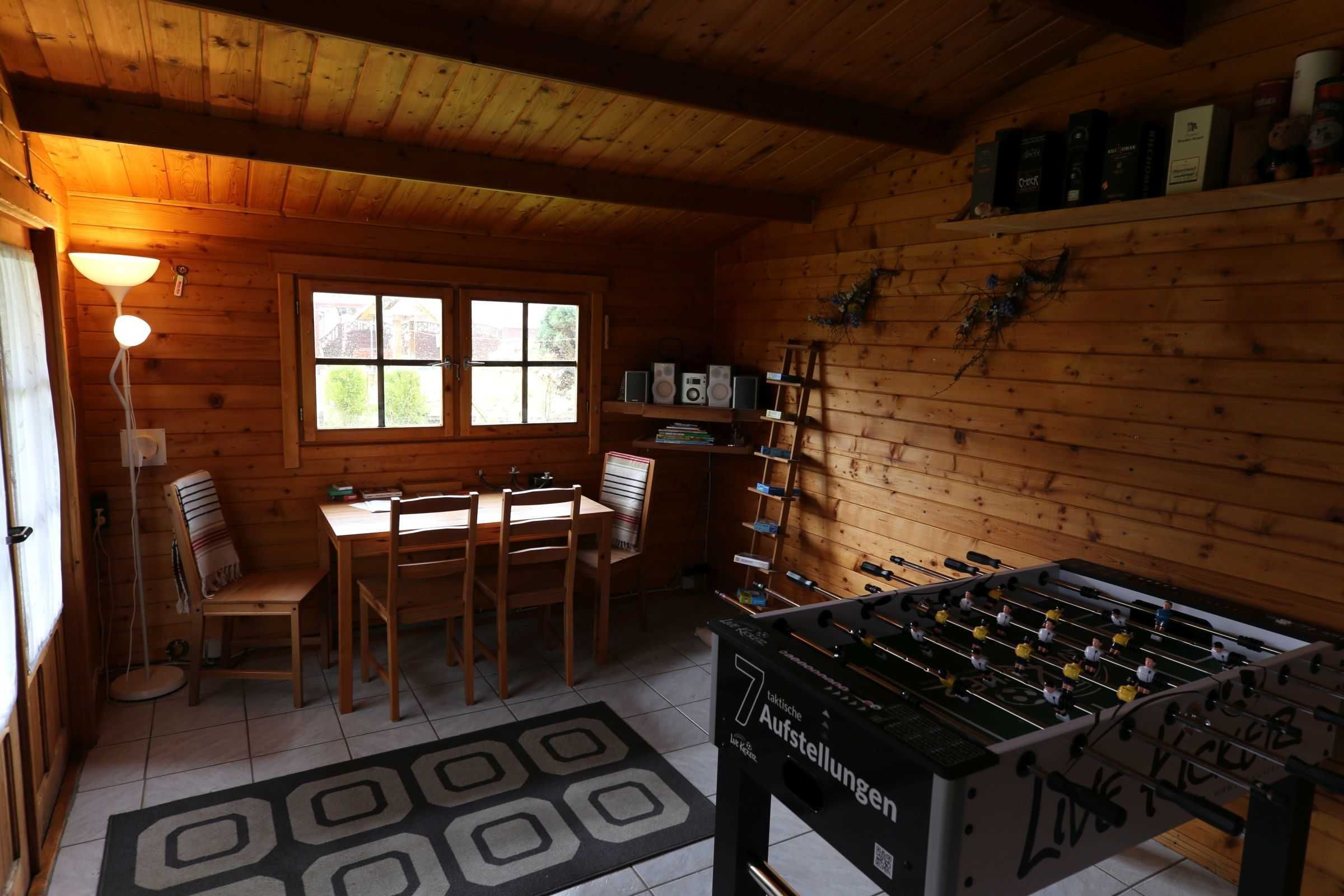 Im Garten steht ein Blockhaus. Hier befindet sich zur freien Verfügung ein Kicker-Tisch sowie eine Dartscheibe. Dort befinden sich auch diverse Outdoor-Spiele: Fußbälle, Boule, Federballspiel usw.
