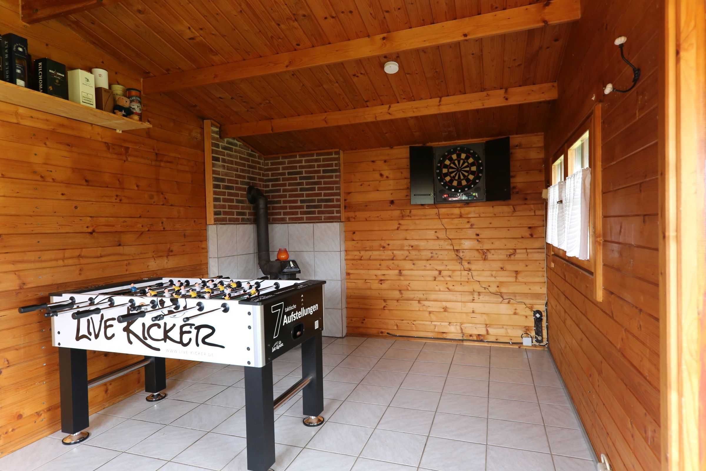 • Im Garten steht ein Blockhaus. Hier befindet sich zur freien Verfügung ein Kicker-Tisch sowie eine Dartscheibe. Dort befinden sich auch diverse Outdoor-Spiele: Fußbälle, Boule, Federballspiel usw.