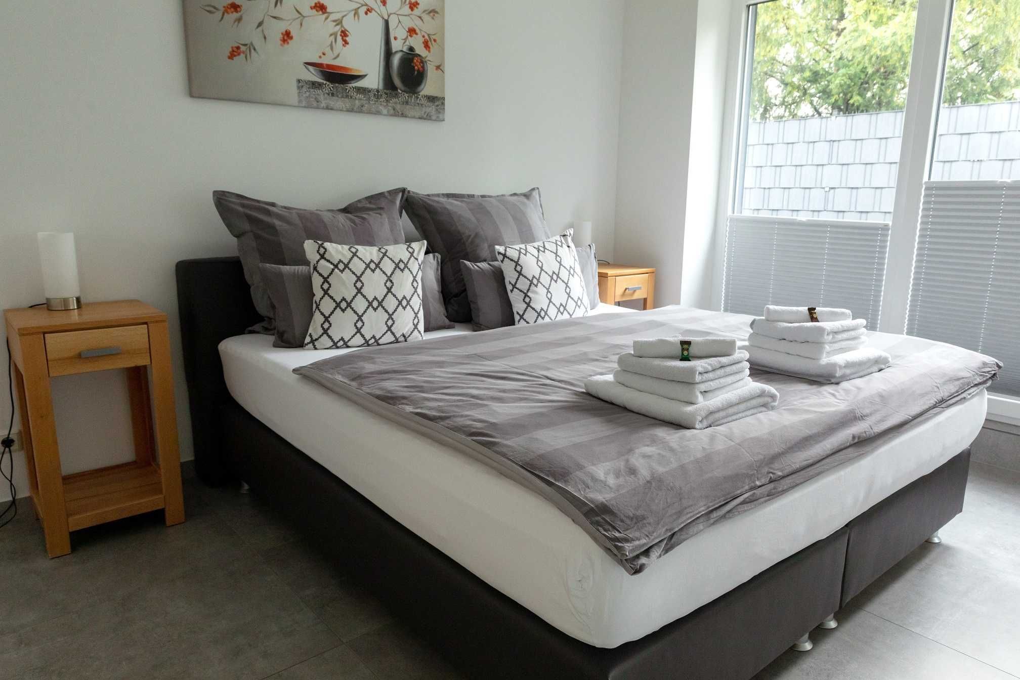 Diese Ferienwohnung verfügt über 2 Schlafzimmer jeweils mit Boxspringbetten der Größe 180x200 cm und ein weiteres separates Zimmer mit einem Boxspringbett der Größe 90x200 cm, einen großen Wohn/Küchenraum und ein Bad.