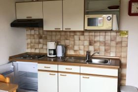 unsere kleinste Wohnung mit Küchenzeile und Wohnraum kombiniert. Gemütliches Schlafzimmer mit großem franz. Bett. Badezimmer mit Wannenbad. Geeignet für bis zu 2 Personen. Nicht für Haustiere geeignet.