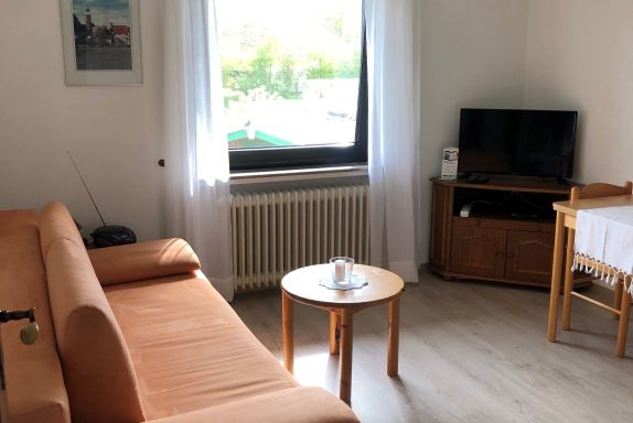 Ferienwohnung Ossistube: 35 qm große Obergeschosswohnung für 2 Personen. Wohnzimmer mit Küchenzeile und Mikrowelle, 1 Schlafzimmer, Bad mit Duschbadewanne und WC. Saunanutzung gegen Gebühr. Keine Haustiere.