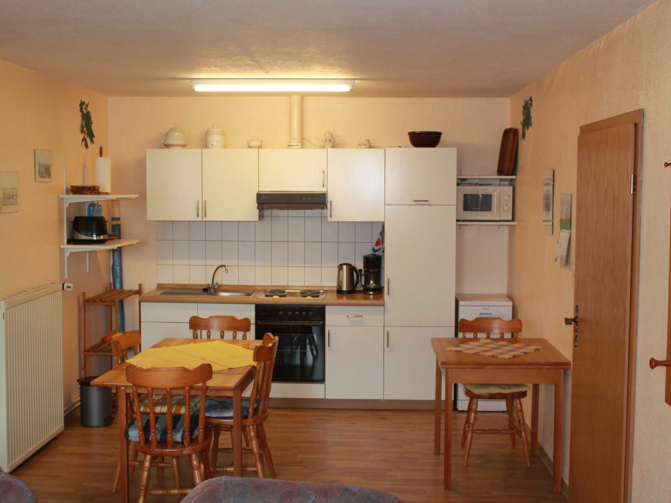 Die Ferienwohnung 1 hat eine Wohnfläche von ca. 65 m² mit zwei separaten Schlafzimmern, einem Doppelzimmer und einem weiterem Zimmer mit 3 Betten (ein Hochbett und ein normales Bett). Badezimmer mit Dusche und WC. Komplett eingerichtete Küchenzeile mit Kaffeemaschine, Wasserkocher, Mikrowelle, Mixer, Toaster, Eierkocher, Herd & Backofen, Kühlschrank und sonstigem Hausrat. Das Wohnzimmer ist mit einem Farbfernseher (Sat-Anlage) und Radiogerät ausgestattet. Für die kleinen Gäste steht ein Reisebettchen oder Kinderbett einschließlich Bettwäsche sowie ein Hochstuhl, Spielzeug und ein Spielplatz zur Verfügung. Hunde sind bei uns auch gern gesehene Gäste.