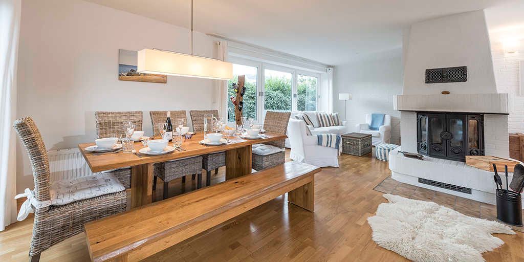 Im großen Wohnzimmer mit Kamin kann man sich treffen, Tee trinken mit Rhabarberkuchen vom Kurhaus oder zusammen essen am großen Tisch für 12 Personen. In der großen Küche mit Stehtisch lässt sich hervorragend zusammen kochen oder einfach schnacken. Auf der Terrasse, im Garten oder in der sog. Lounge geht am gemeinsamen Grillen fast kein Weg vorbei. Die Kinder können jederzeit raus in den großen, eingewachsenen Garten.