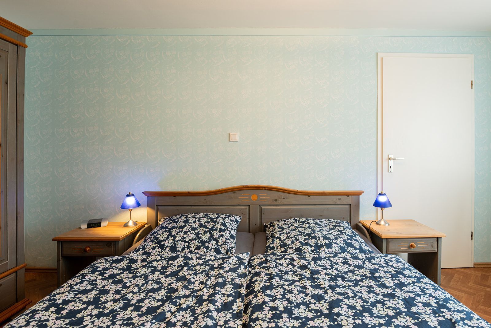 Im angrenzenden Schlafzimmer befindet sich ein Doppelbett (1,80 x 2,00 m). Ein Kleiderschrank mit Spiegeltür sowie ein Tisch mit 2 Stühlen sind ebenfalls vorhanden. Eine Kofferablage rundet den Bereich ab.