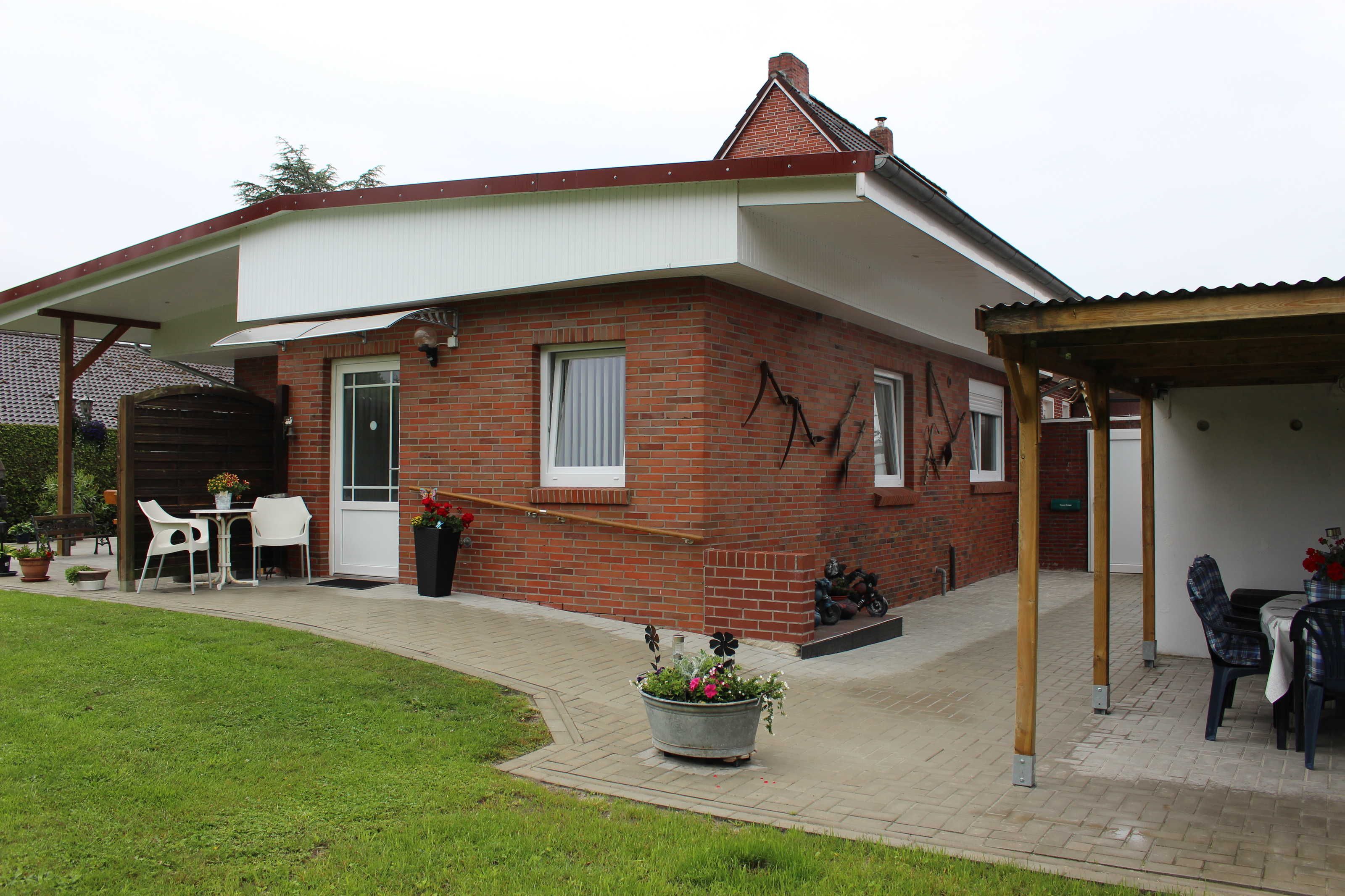 Gemütliche Ferienwohnung in Ostrhauderfehn, Erdgeschoss, Wohnraum mit Einbauküche und Essecke, Sitzecke, SAT-TV, Radio Recorder, 1 Doppelzimmer, 1 Zweibettzimmer, auf Anfrage ein Zustellbett möglich, Bad mit Dusche/Wanne/WC, Terrasse mit Gartenmöbeln, sehr schöner Garten, Grill, Parkplatz am Hause, Bushaltestelle in nächster Nähe, WLan-Anschluss