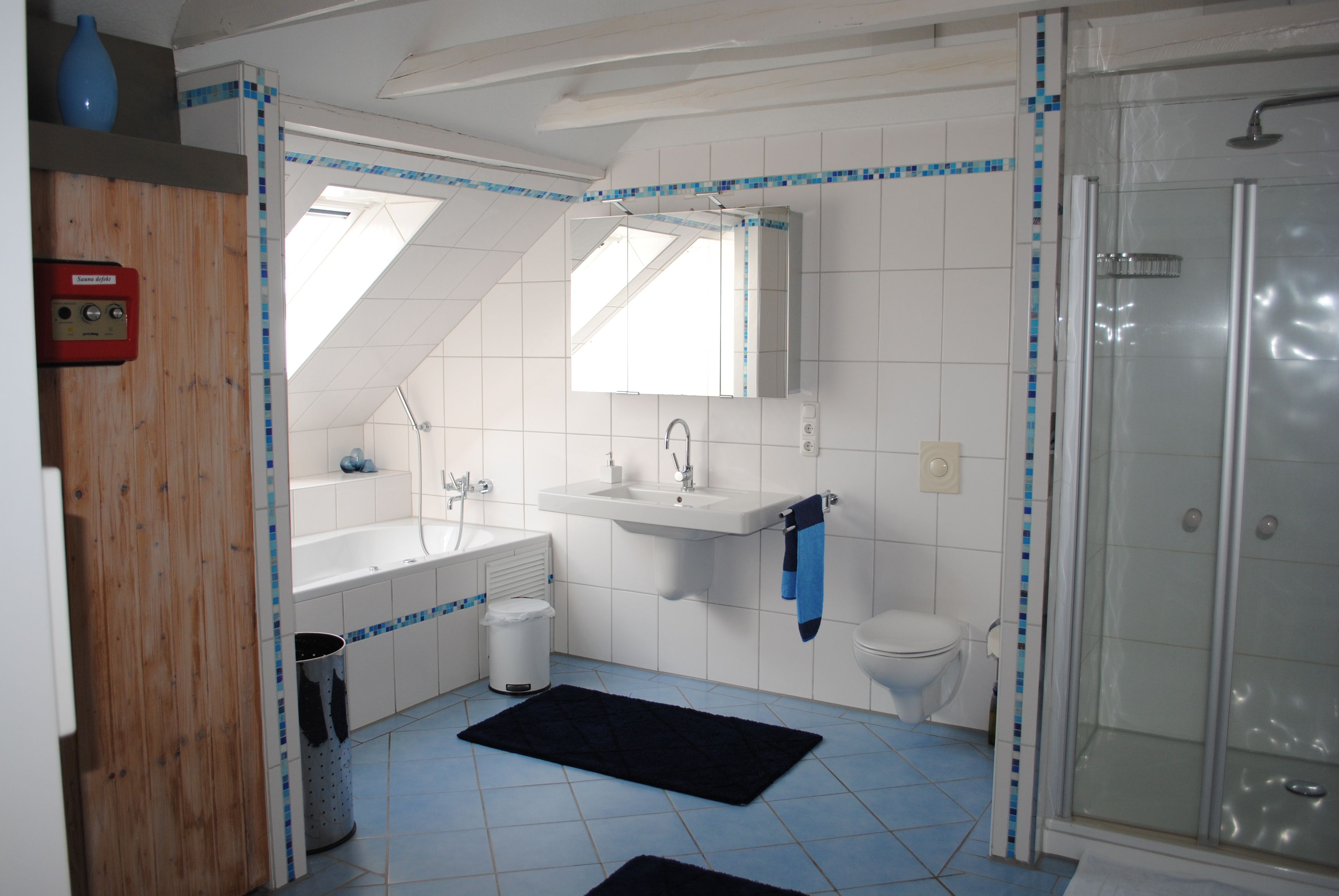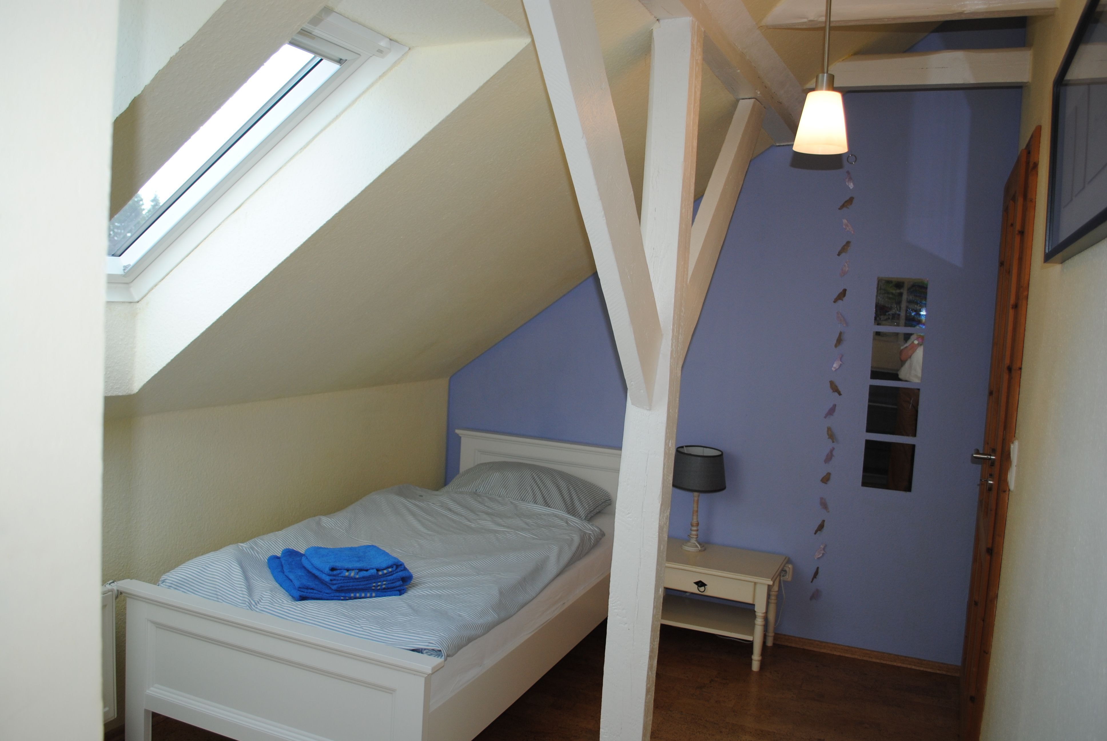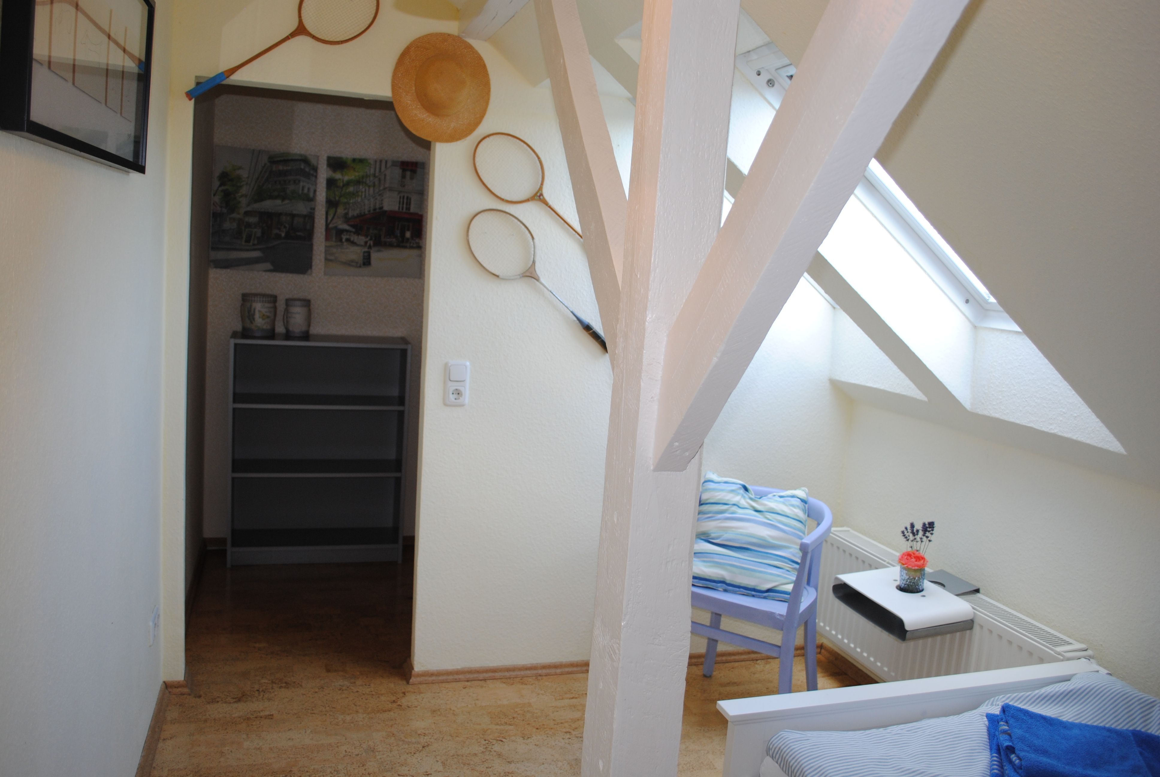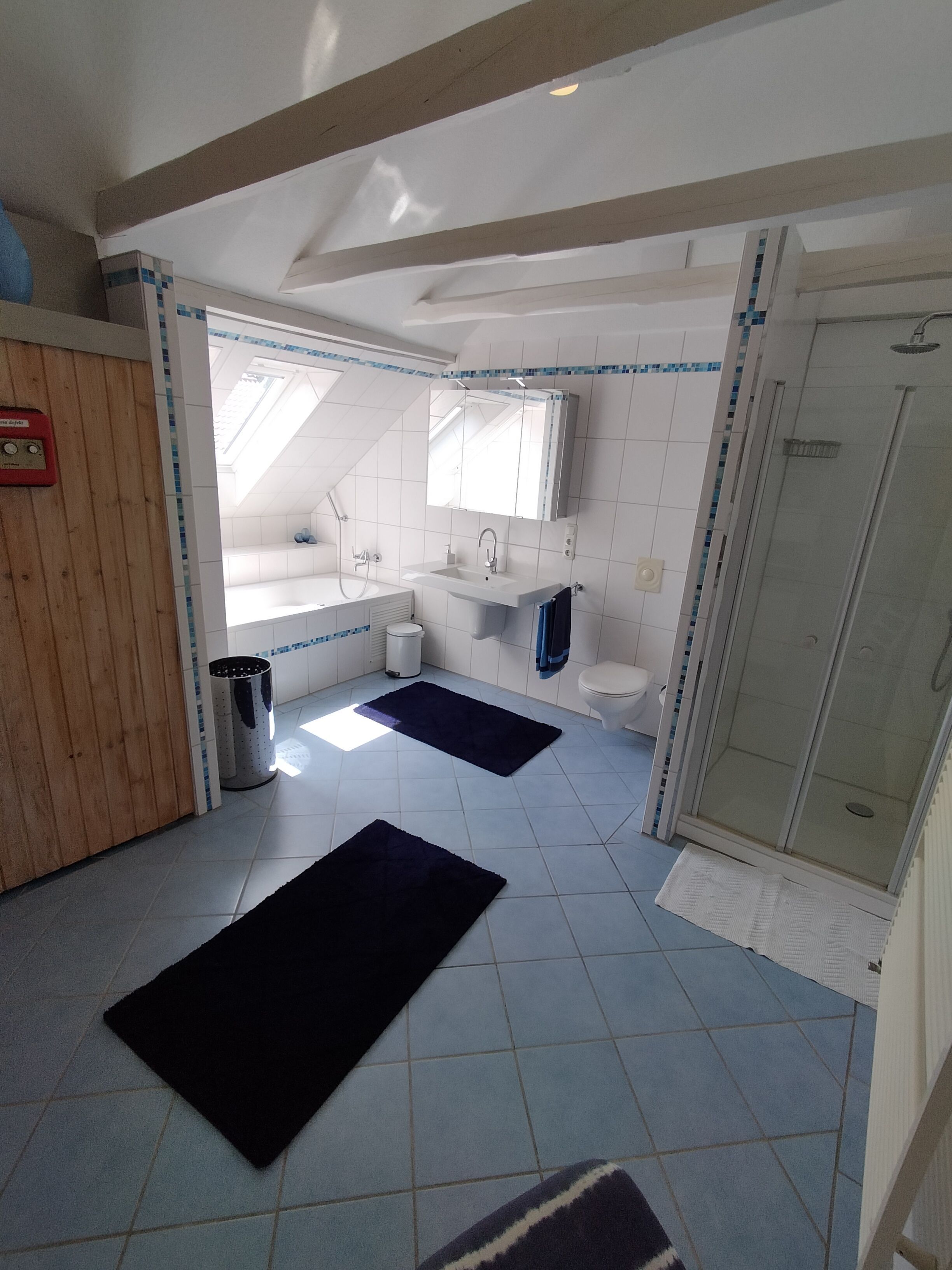 Die Wohnung erstreckt sich über 2 Etagen und verfügt über 2 Schlafzimmer mit Doppelbetten im Erdgeschoss. Im Dachgeschoss befinden sich 3 Schlafzimmer mit Einzelbetten. Das große Familienbad befindet sich im Dachgeschoss und verfügt über Badewanne, Dusche und WC. Im Erdgeschoss ist die Küche mit Essplatz und einem extra Wohnzimmer mit TV. Eine Spielesammlung für Spieleabende mit der ganzen Familie steht zur Verfügung.