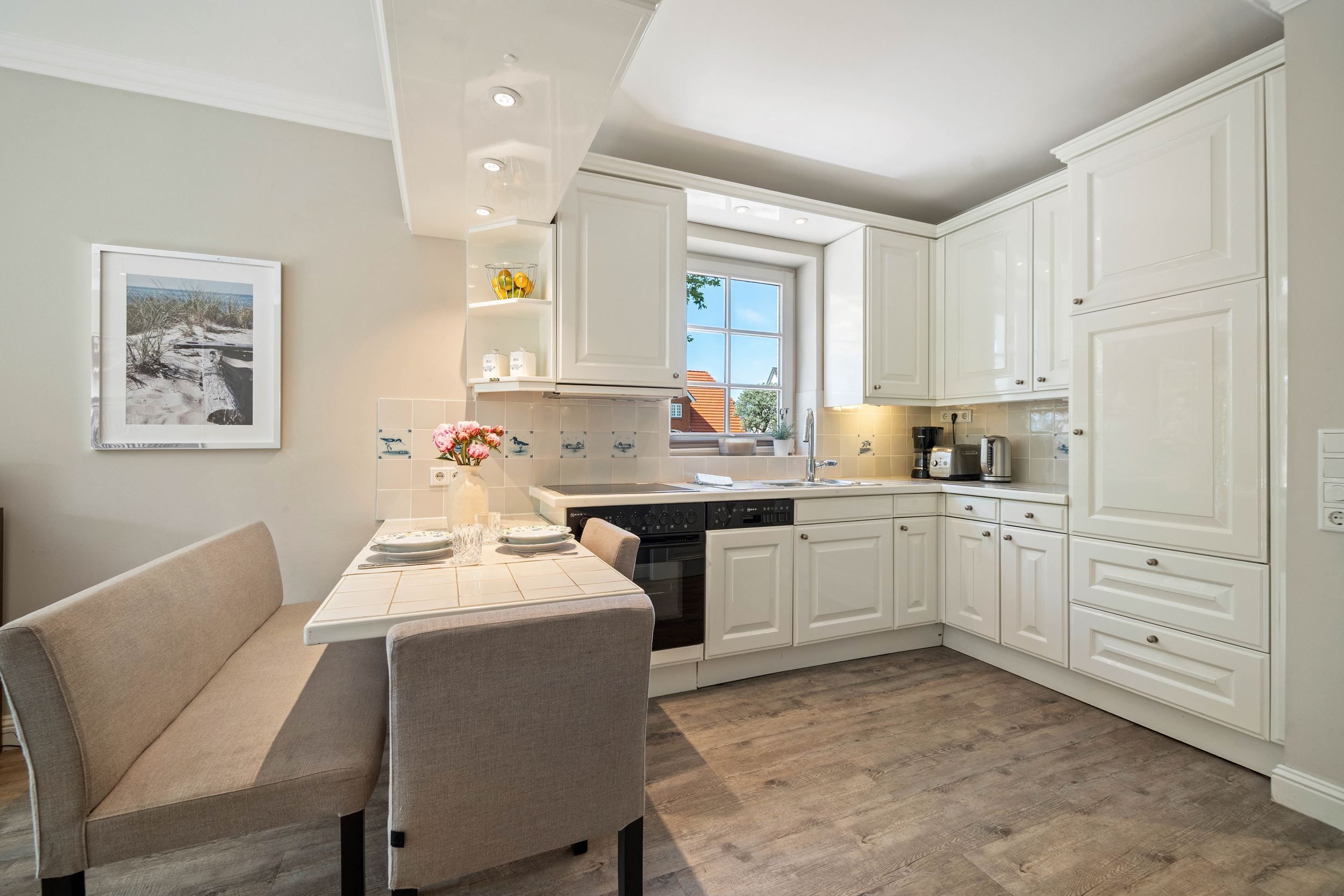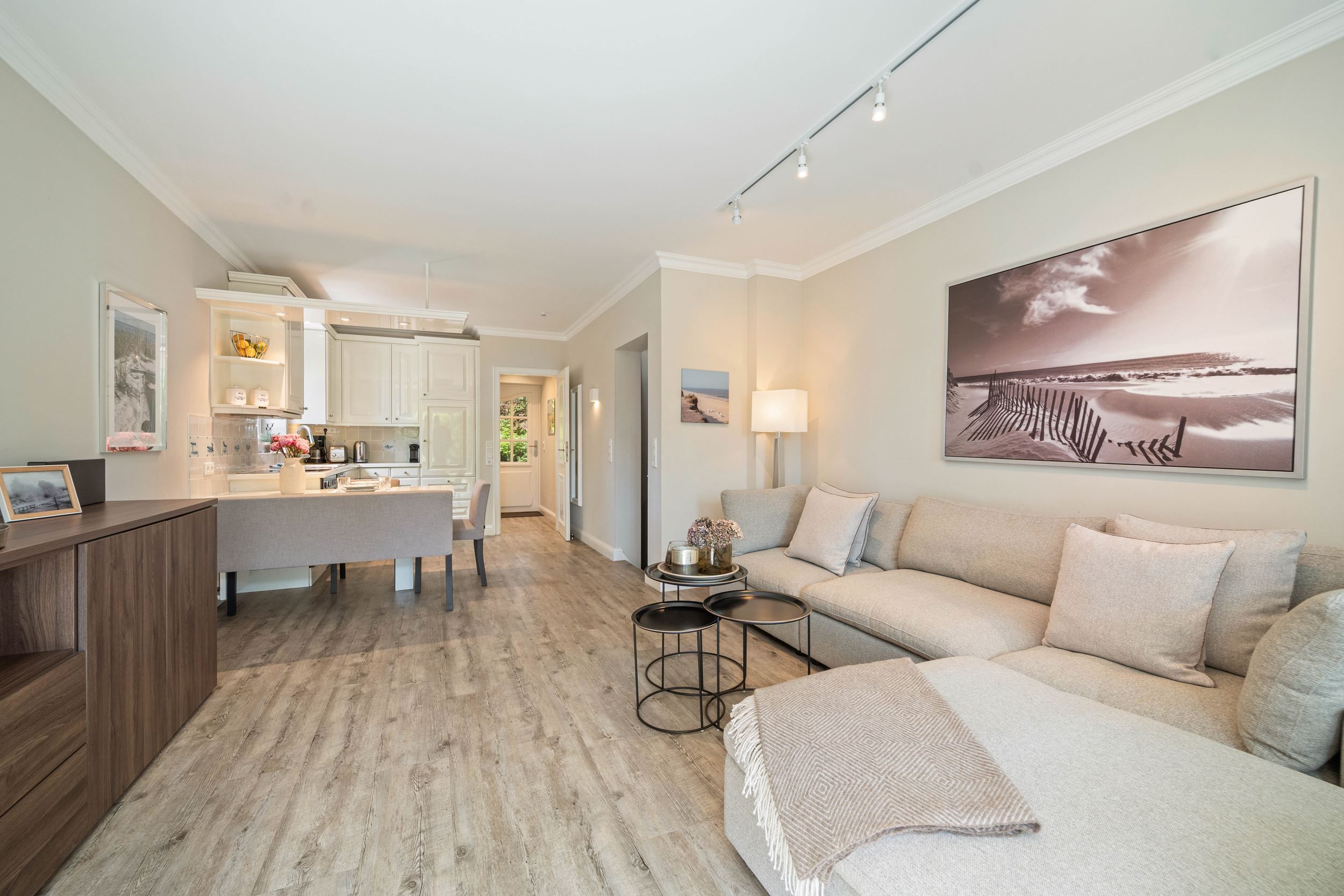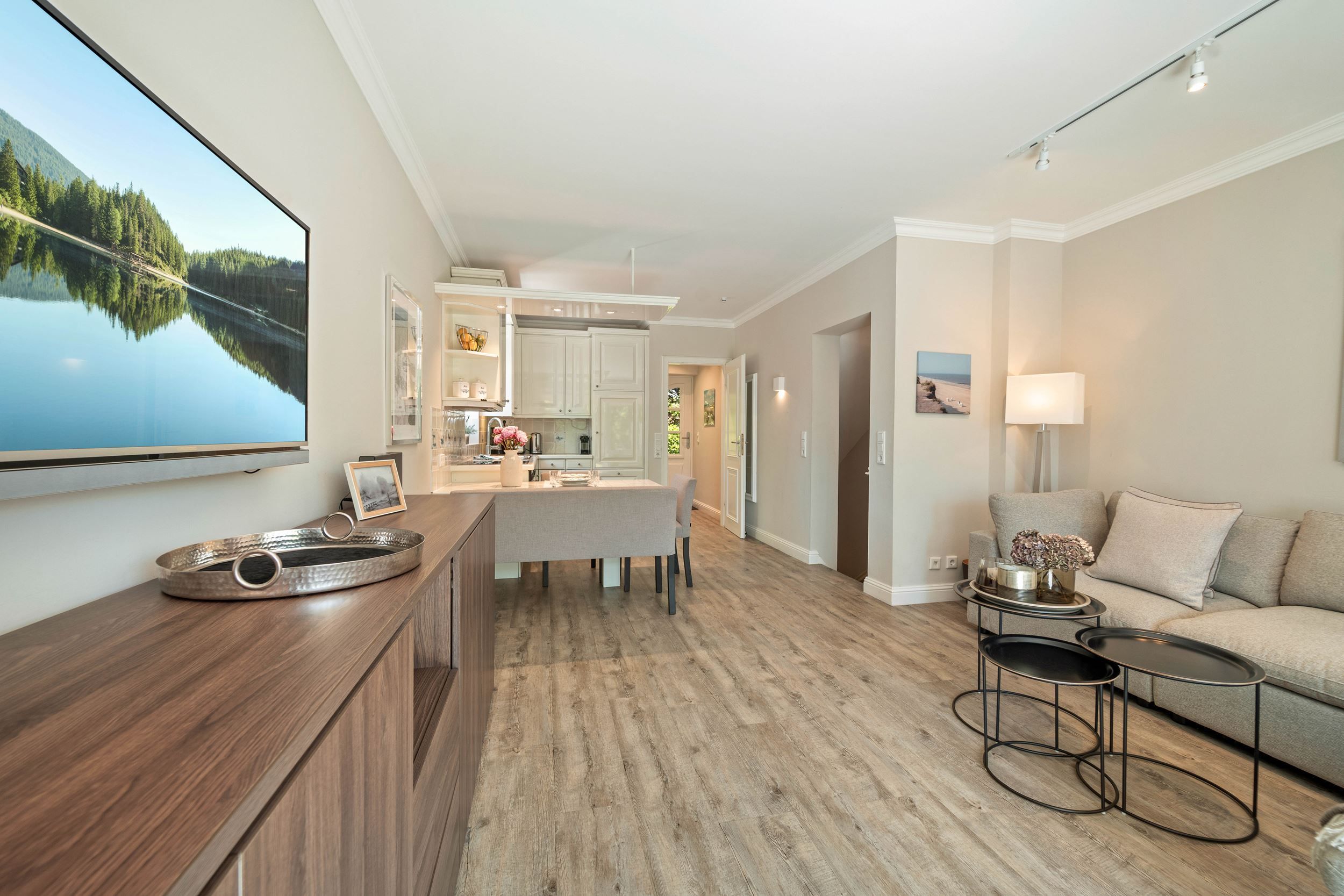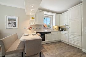 Diese Wohnung wurde komplett renoviert, saniert und neu möbliert. Die harmonische Farbgebung und die wirklich sehr gelungene Möblierung sorgt bei Ihnen für den absoluten Wohlfühleffekt. Die Wohnung ist wie folgt aufgeteilt: Erdgeschoss mit Wohnraum, Gäste WC, große offene Küche und Diele. Untergeschoss mit Badezimmer und den beiden Schlafzimmern.