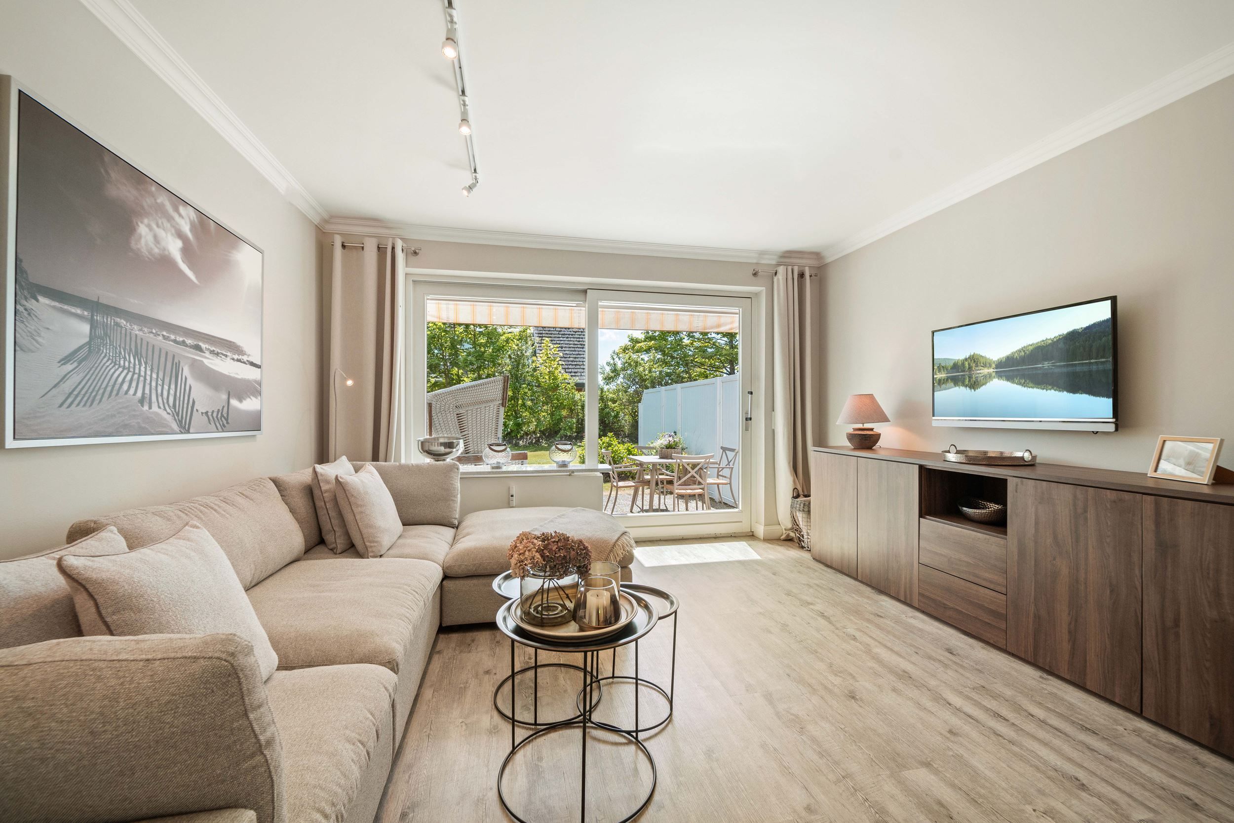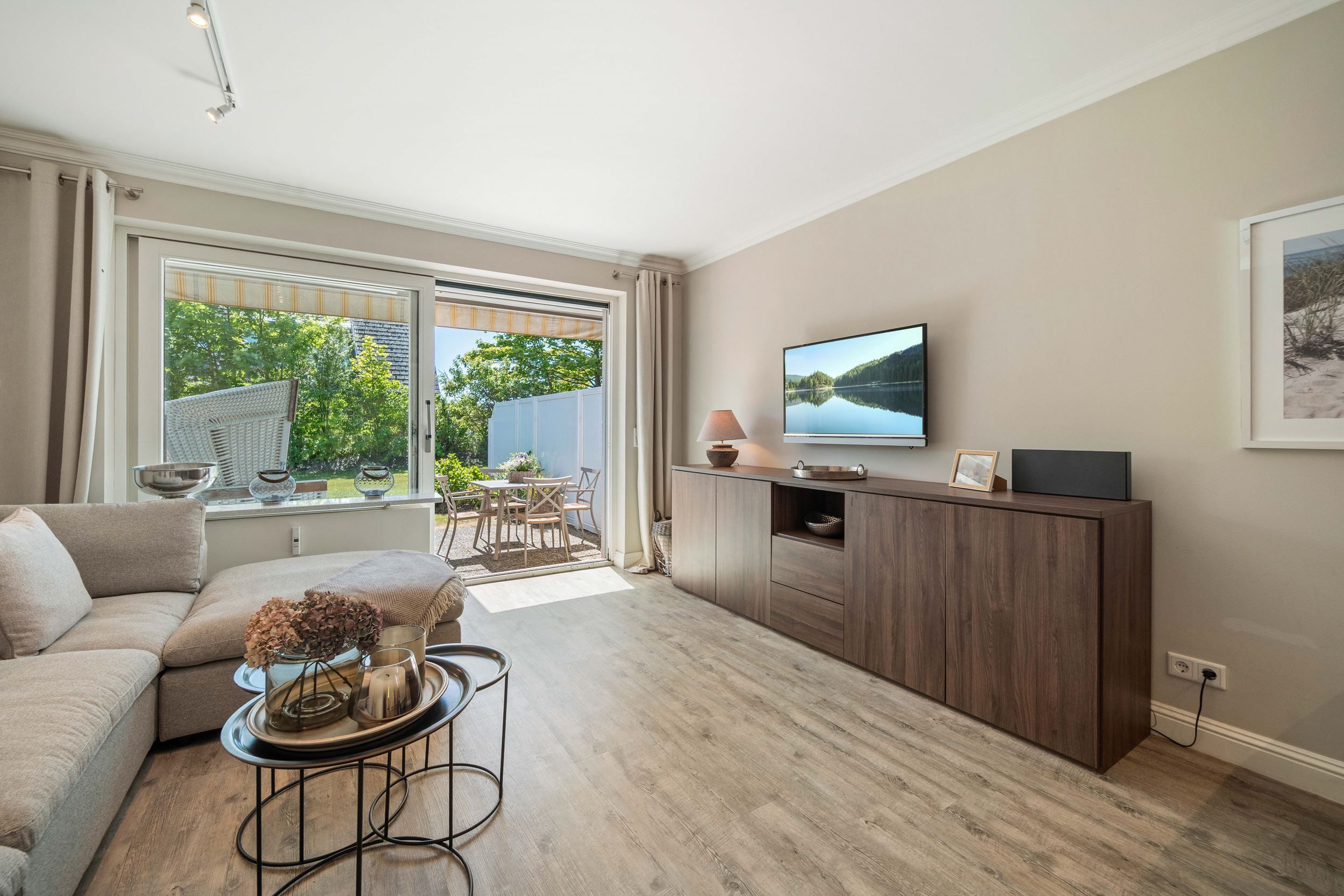 Die nach Süden ausgerichtete Terrasse mit dem sich anschließenden großen Garten lädt mit Strandkorb und Gartenmöbeln zum Verweilen ein.
