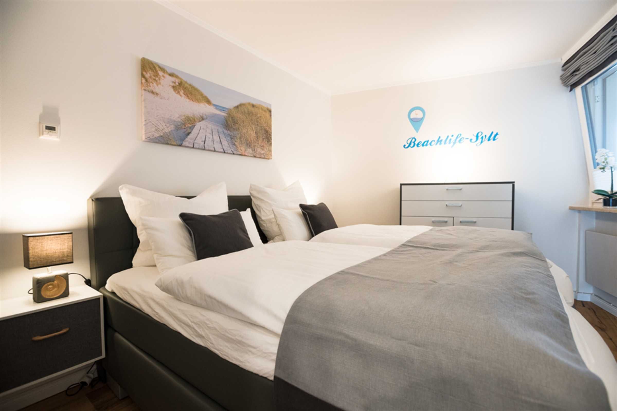 Das Schlafzimmer ist mit einem Boxspringbett ( 1,80m breit) , hellen Möbeln mit ausreichend Stauraum, und einem weiteren LED-Fernseher ausgestattet.