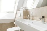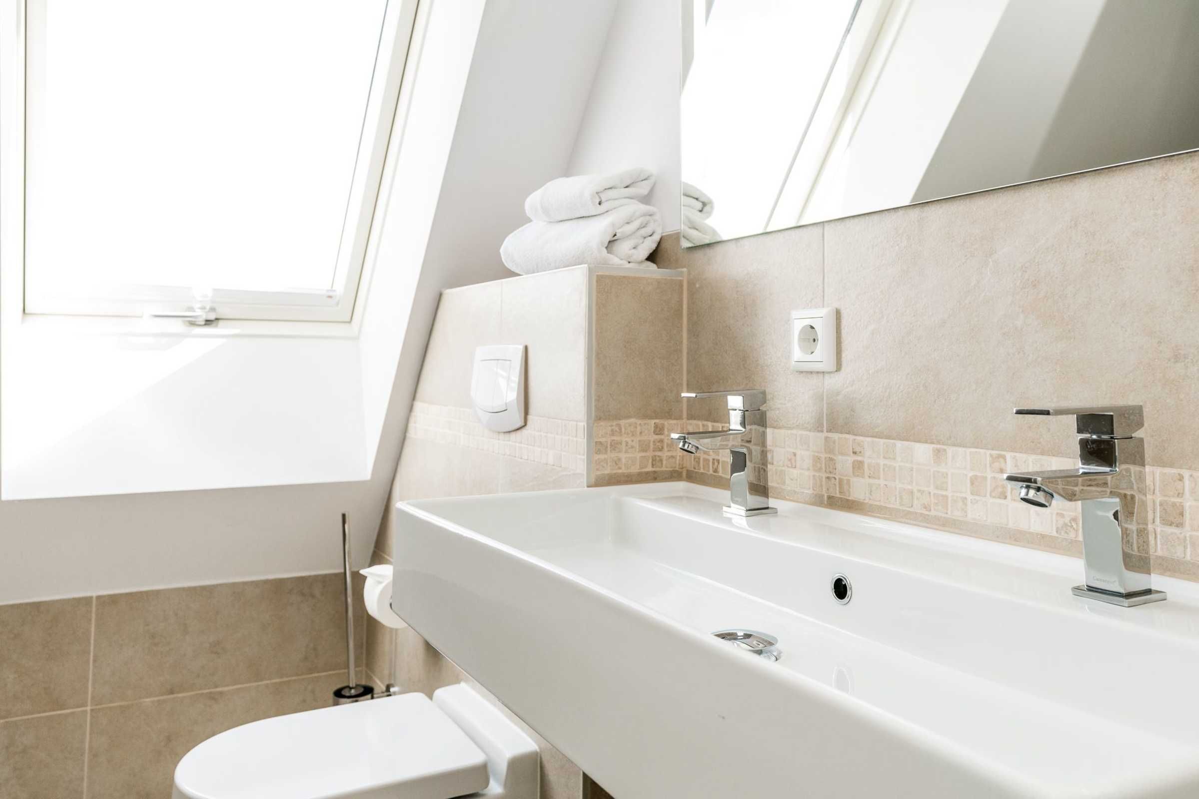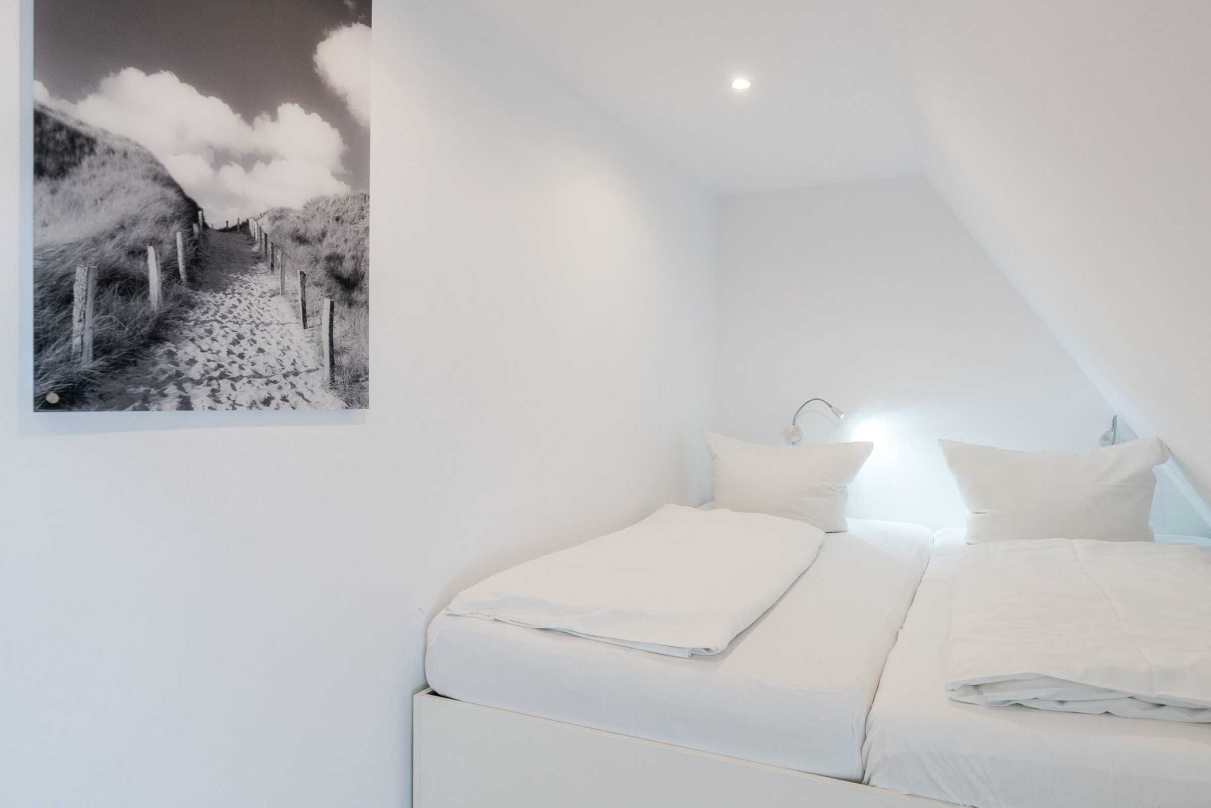 Die Schlafzimmer sind jeweils mit einem Doppelbett ausgestattet, wobei es sich bei einem Bett um ein Kojenbett handelt. Zudem befindet sich im 1. OG das Badezimmer mit ebenerdiger Dusche, Doppelwaschbecken, einem WC und einer Waschmaschine.