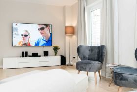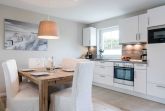 Das Hausteil verfügt über 115 qm und bietet Platz für bis zu 4 Personen. Das Haus ist in einem hellen, modernen Design eingerichtet. Sie erwartet ein modernes Wohlfühl-Ambiente mit hellen Landhausdielenparkett, Flachbildfernsehern im Wohnzimmer und in den Schlafzimmern, einem Bad aus Naturstein, einem Gäste-WC und Fußbodenheizung.