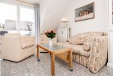 Das Wohnzimmer mit Küchenzeile ist ebenfalls mit Natursteinboden und sonstigen Natursteinbelegen (Tisch und Küchenarbeitsplatte)) versehen. Die Einrichtung im Friesenstil bietet ein behagliches Ambiente, eine kleine Bibliothek sorgt für Abwechslung an Regentagen. Der Balkon mit Sichtschutz zur Nachbarwohnung ist nach Süden ausgerichtet.