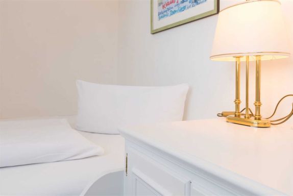 Die Unterkunft verteilt sich über 1. OG und DG. Im 1. OG. finden Sie das lichtdurchflutete Badezimmer, einen Schlafraum mit eingebautem großen Bett und einem Einbauschrank. Der Blick aus diesem Zimmer zeigt am Horizont den Kampener Leuchtturm.