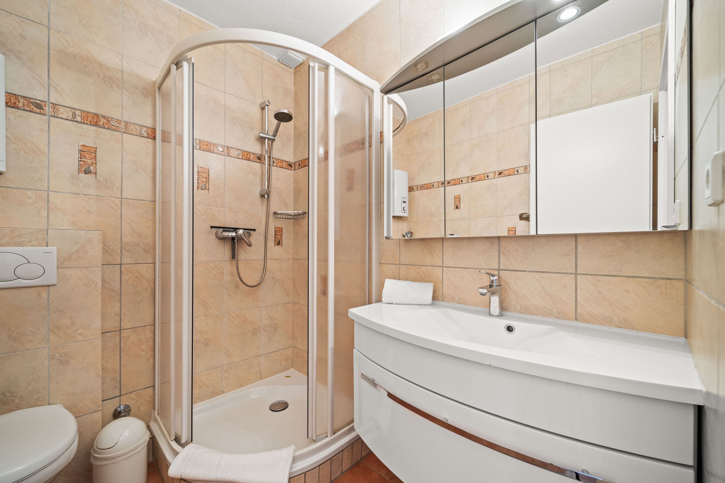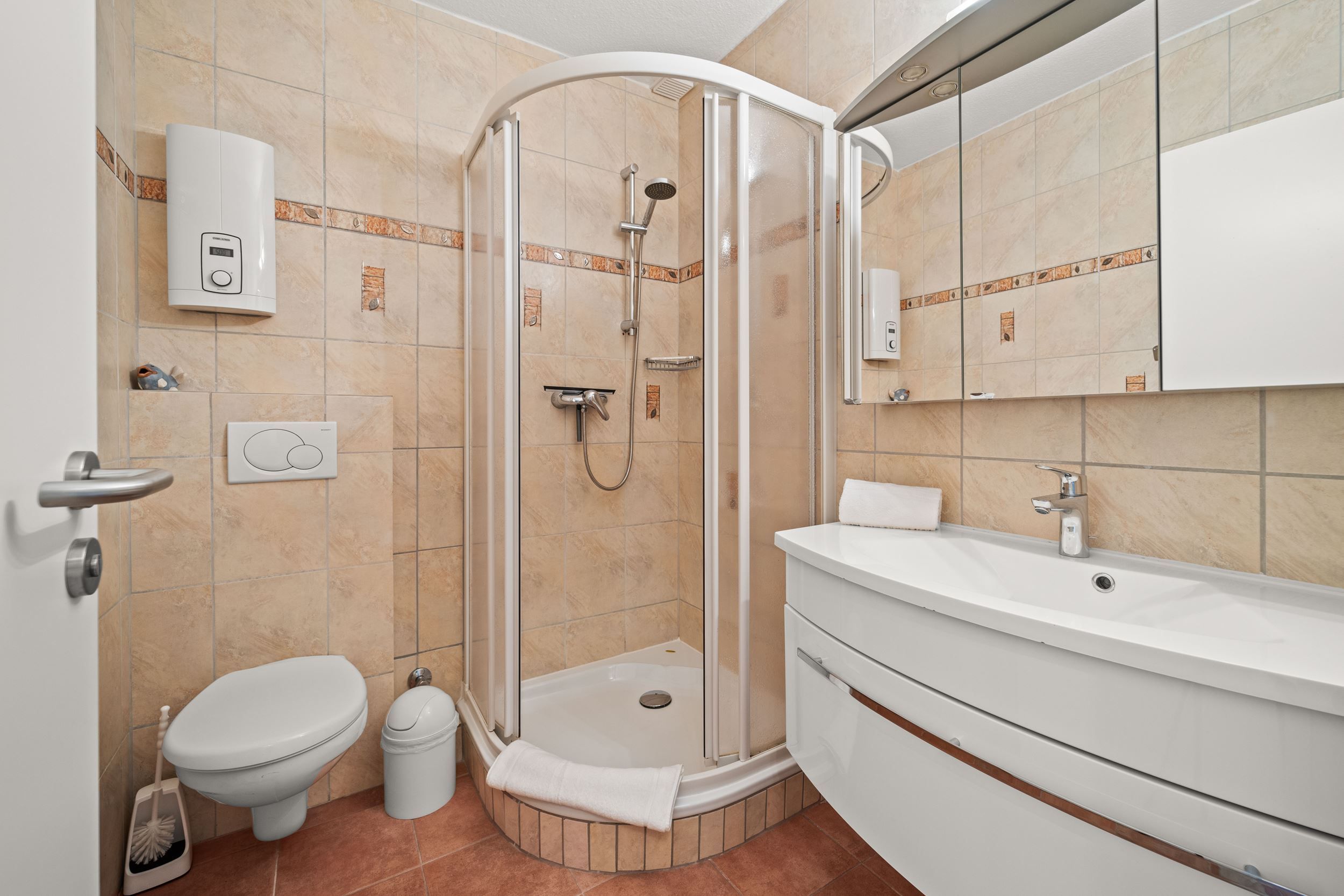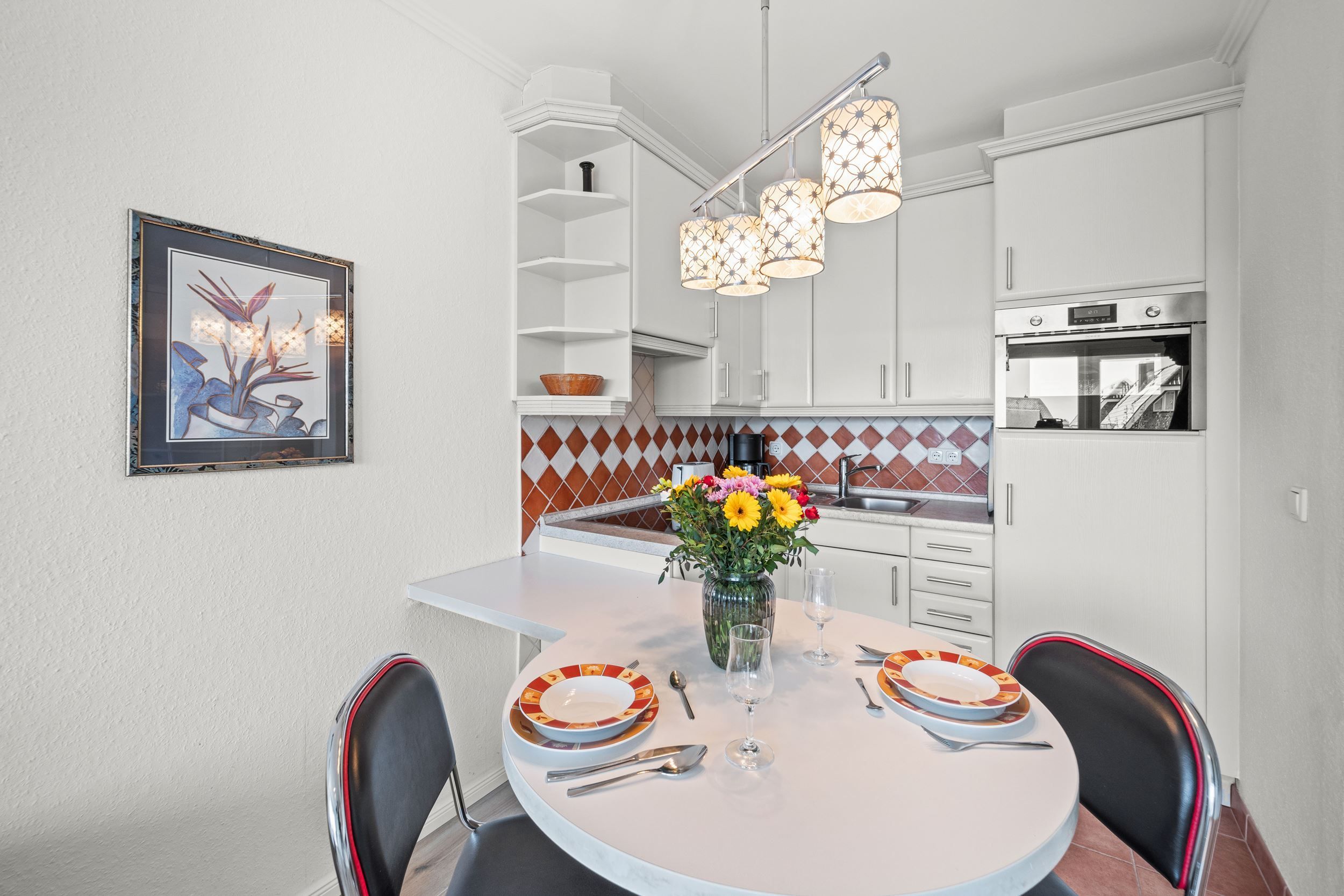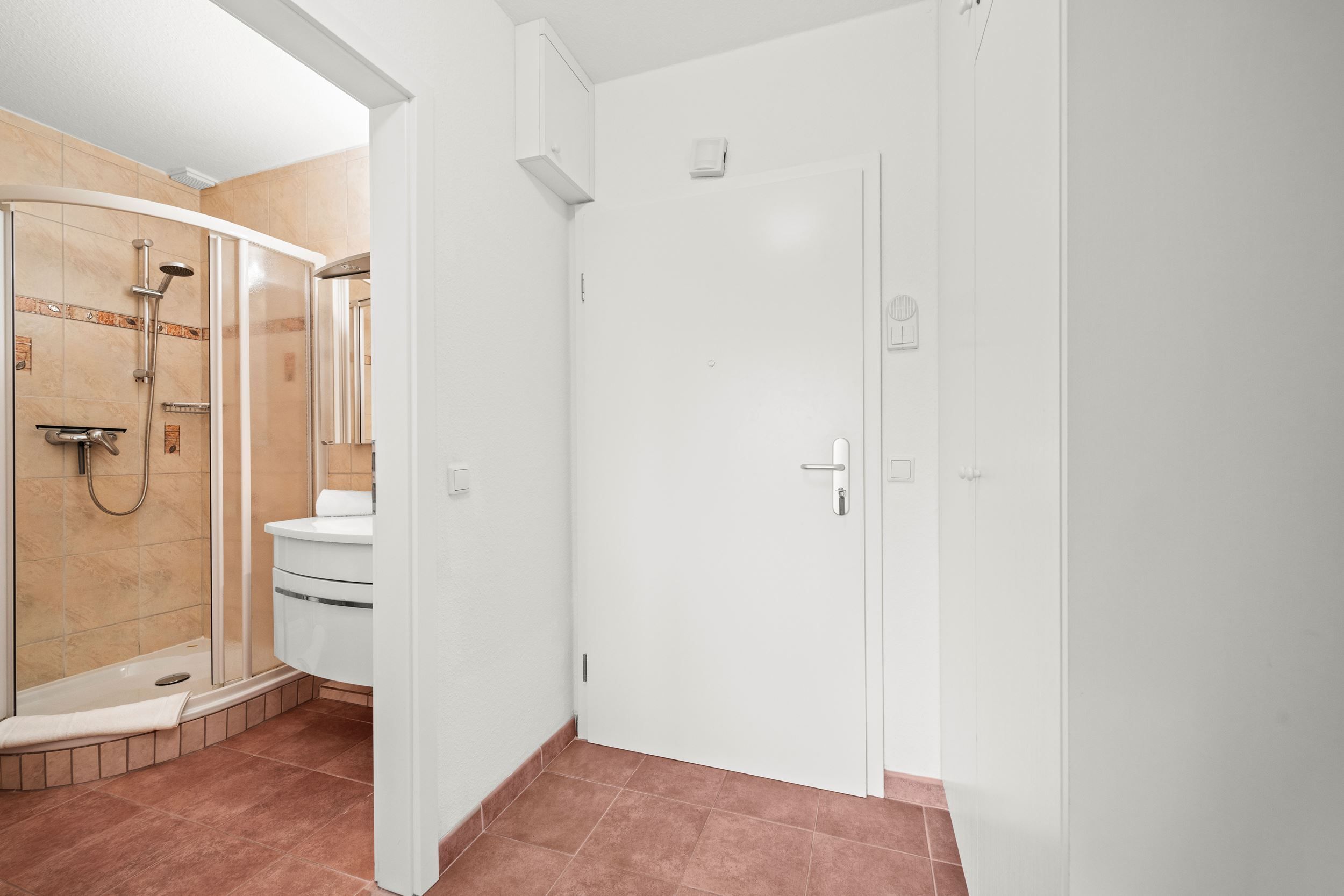 Die Unterkunft liegt im 1. Obergeschoss und hat einen großen, möblierten Balkon nach Osten. Ausgestattet mit Flachbildschirm und Radio im Wohnzimmer. Die Einbau-Küche ist mit Ceran-Kochfeld und Mikrowelle. Die Wohnung ist außerdem mit einem Internetzugang ausgestattet (gebührenfrei). Zudem steht Ihnen ein Telefon zur Verfügung, die Anrufe in das Deutsche Festnetz sind gebührenfrei für Sie. Zu der Wohnung gehört der Garagenstellplatz Nr. 11 auf der Palette (Bis 1,70 Meter Höhe). Die maximale Fahrzeugbreite beträgt 1,90 Meter, die maximale Fahrzeuglänge 5,00 Meter und die maximale Spurweite beträgt 1,85 Meter.
