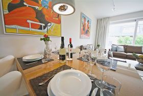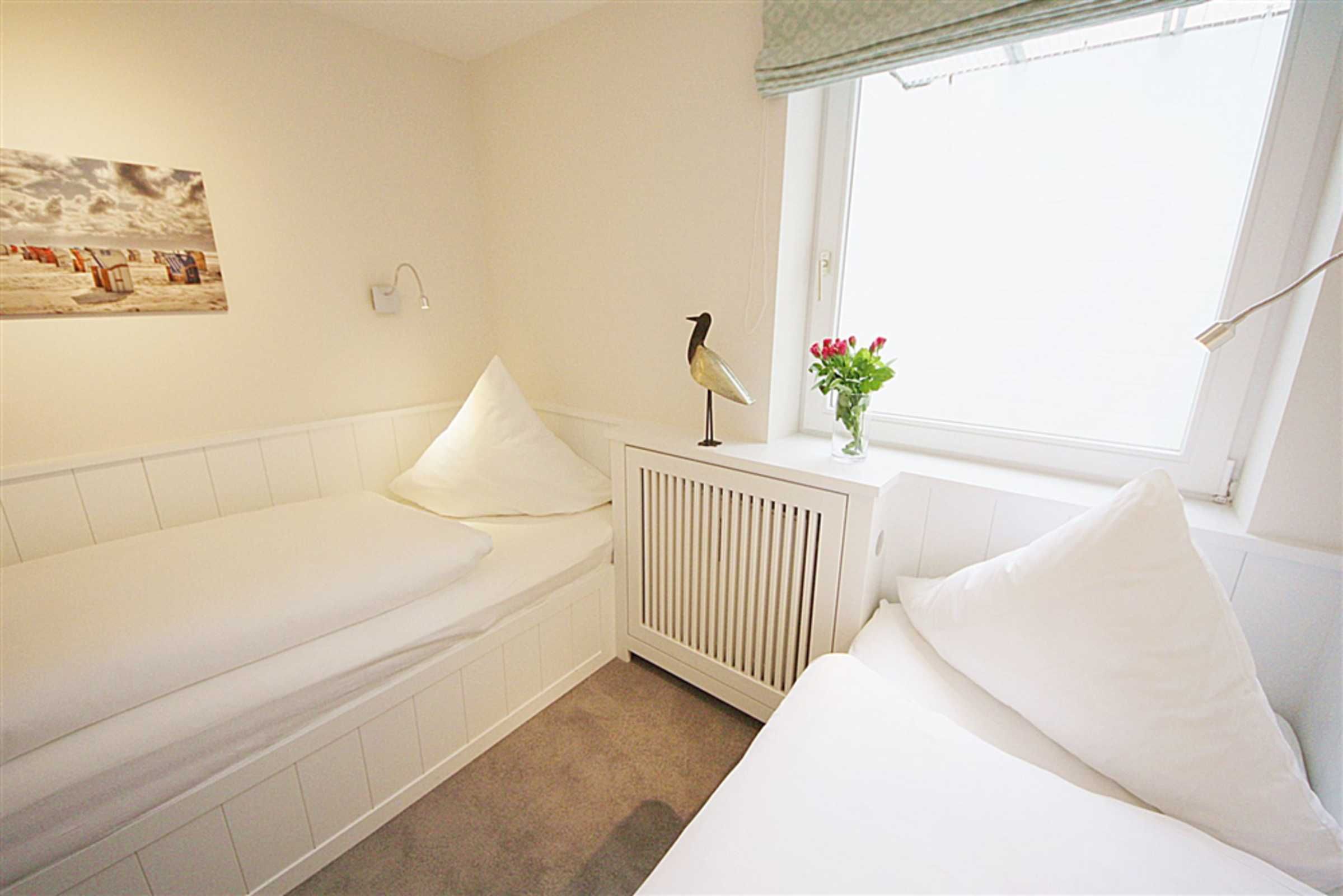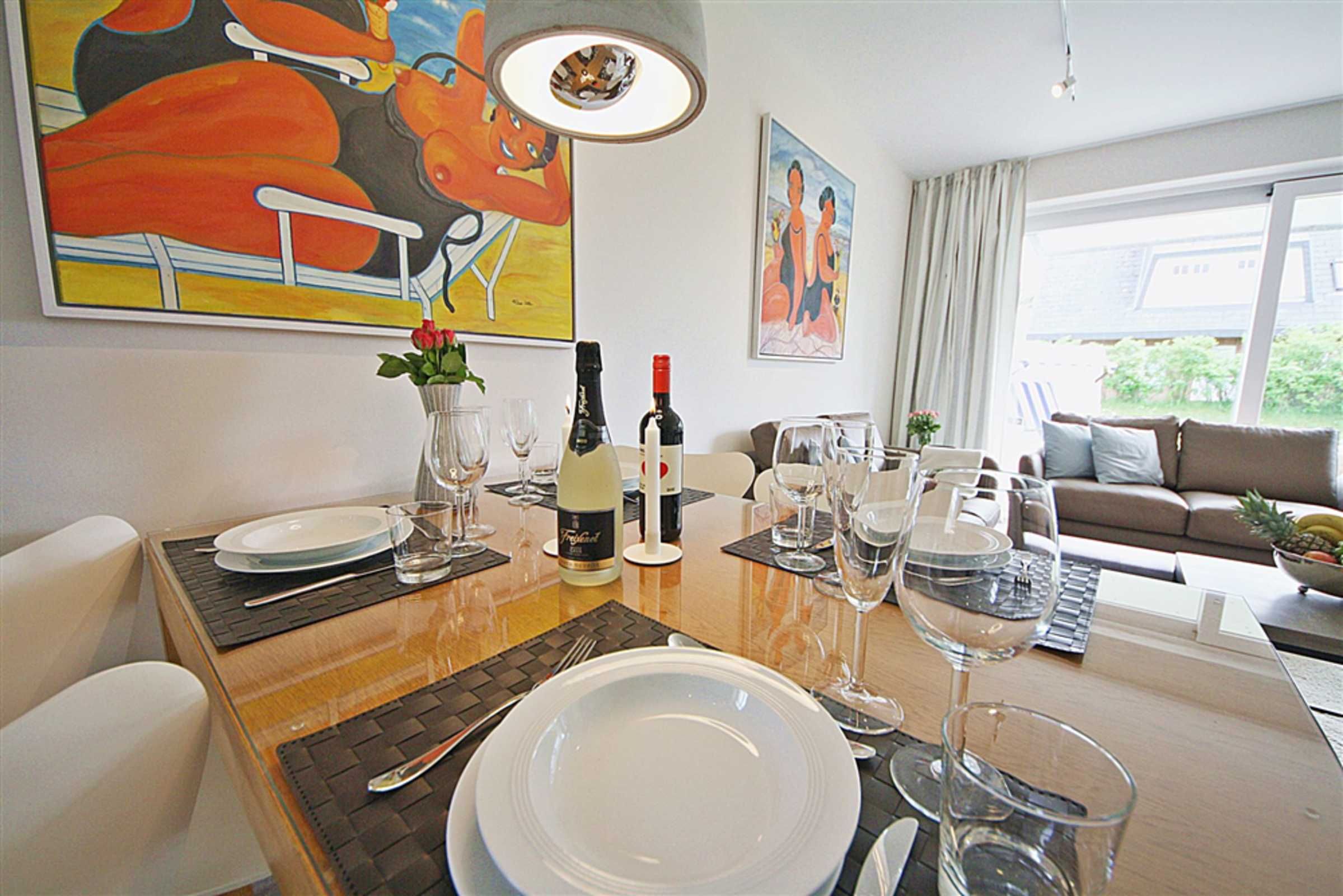 Diese wunderschöne, sonnendurchflutete Wohnung verteilt sich über 2 Etagen und lädt zum entspannten Urlauben ein. Im großzügigen und freundlich gestalteten Wohnraum werden Sie sich wohlfühlen. Die offene Küche lässt das Herz der Hobbyköche unter Ihnen höher schlagen. Behaglich relaxen können Sie in den zwei gemütlichen Schlafzimmern im Untergeschoss. Im EG befindet sich ein Gäste WC, im Untergeschoss erwartet Sie Ihr neues Duschbad. Die nach Süden ausgerichtete Terrasse mit anschließendem großen Garten lädt mit Strandkorb und Gartenmöbeln zum Verweilen ein.