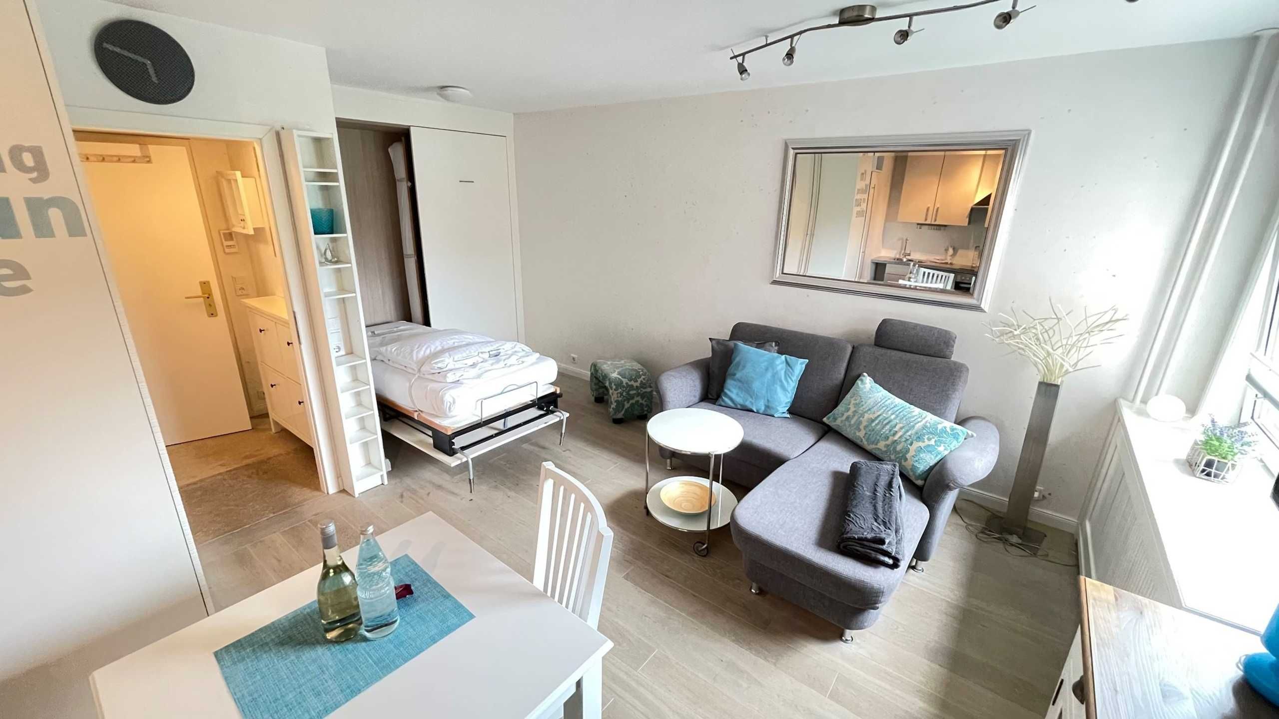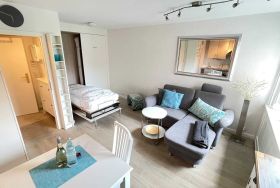 Sehr schöne und liebevoll eingerichtete Ferienwohnung für 2 Personen befindet sich im Hochpaterre und wurde komplett renoviert. Das Appartement verteilt sich über ca. 30 qm und verfügt über einen stylischen kombinierten Wohn/-Schlafbereich mit einem hochwertigen Schrankbett. Die moderne Küchenzeile verfügt über einen Geschirrspüler, Backofen, Toaster , Wasserkocher und einer Filter-Kaffeemaschine. Zudem verfügt die Wohnung über ein kleines, aber sehr feines Badezimmer mit Dusche/WC.