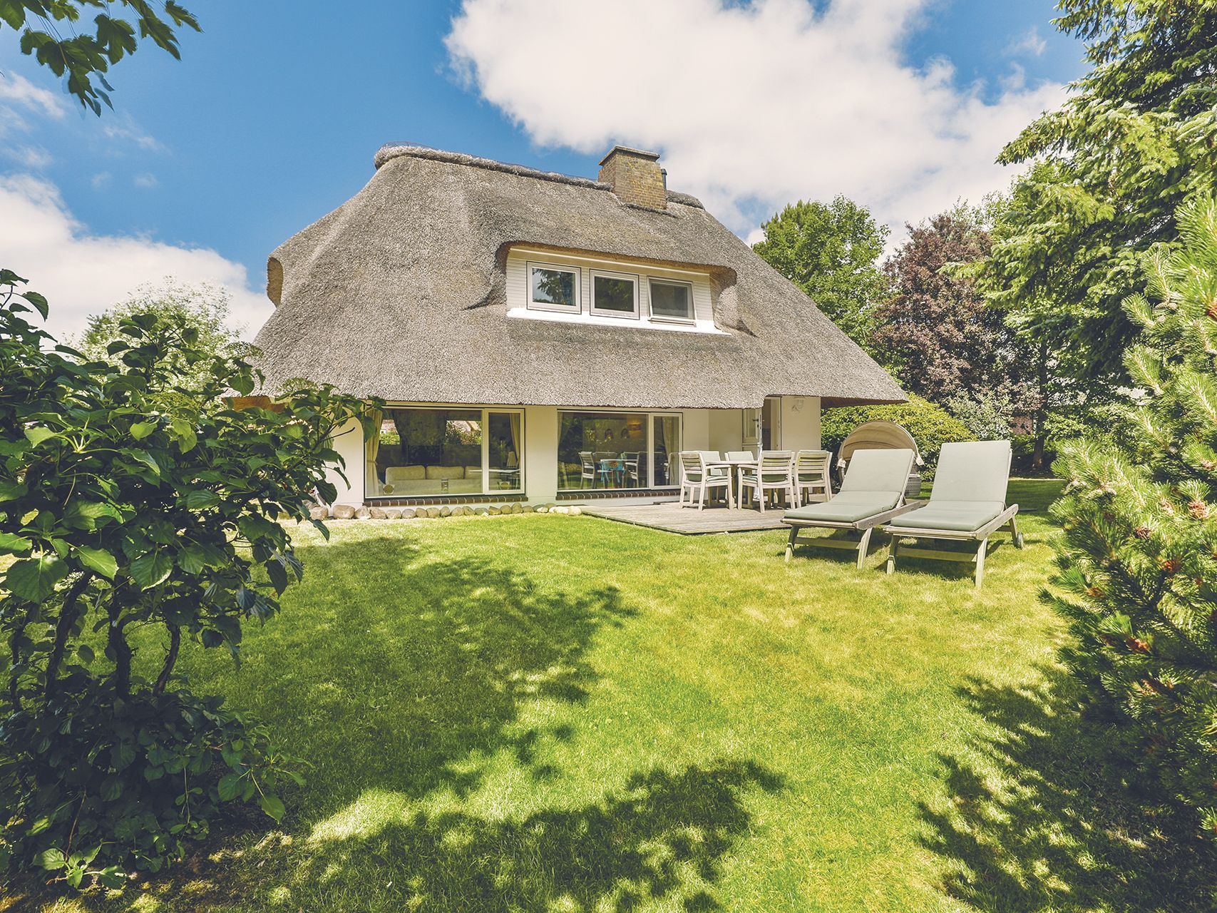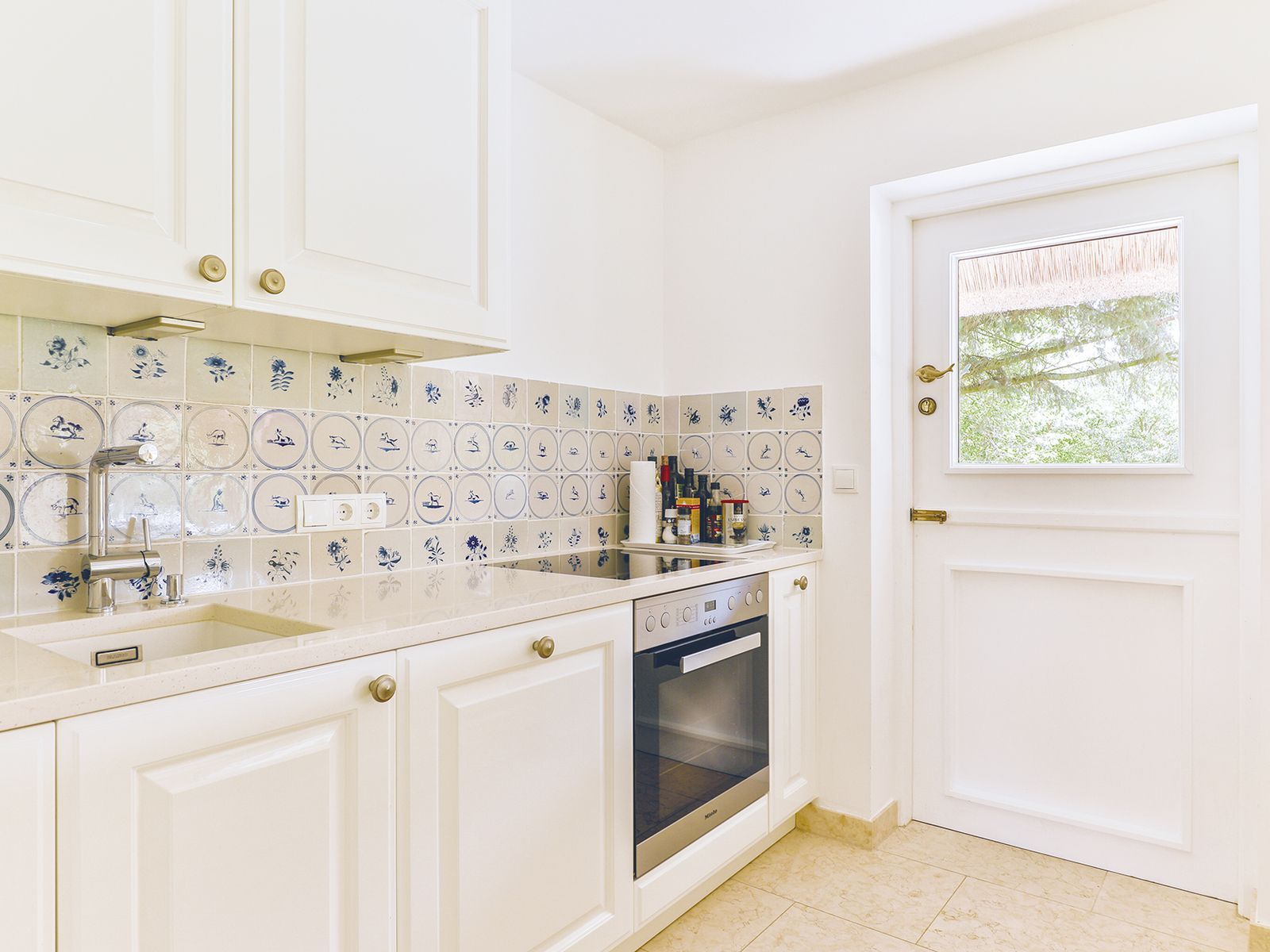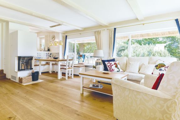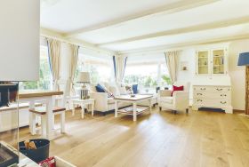 Dieses Einzelhaus unter Reet in exklusiver Lage ist ein echtes Schmuckstück. Der wunderbar, eingewachsene Garten strahlt Ruhe und Erholung aus. Das Erdgeschoss bietet ein zauberhaftes Wohnzimmer mit gemütlichem Essbereich am Kamin und TV, sowie eine offene Küche, von der aus Sie auf Ihre SüdOstterasse gelangen. Ein Gäste-WC finden Sie ebenfalls auf dieser Ebene. Im Obergeschoss erwarten Sie zwei Einzelschlafzimmer und ein Doppelzimmer, alle mit gemütlichen Kojenbetten, sowie ein kompaktes Duschbad mit Doppelwaschtisch. Im Untergeschoss gibt es ein weiteres Doppelschlafzimmer, samt modernem Duschbad mit Doppelwaschtisch und eine eigene Sauna für bis zu vier Personen. Das gesamte Haus ist mit hochwertigem Holzfußboden und hellen Fliesen ausgelegt.