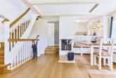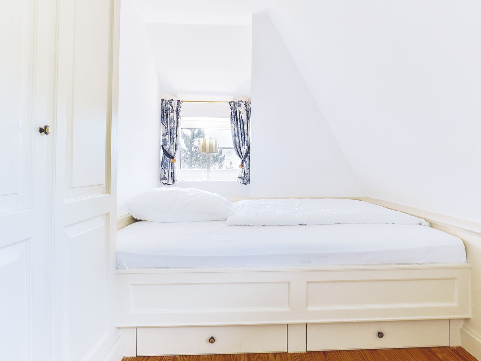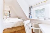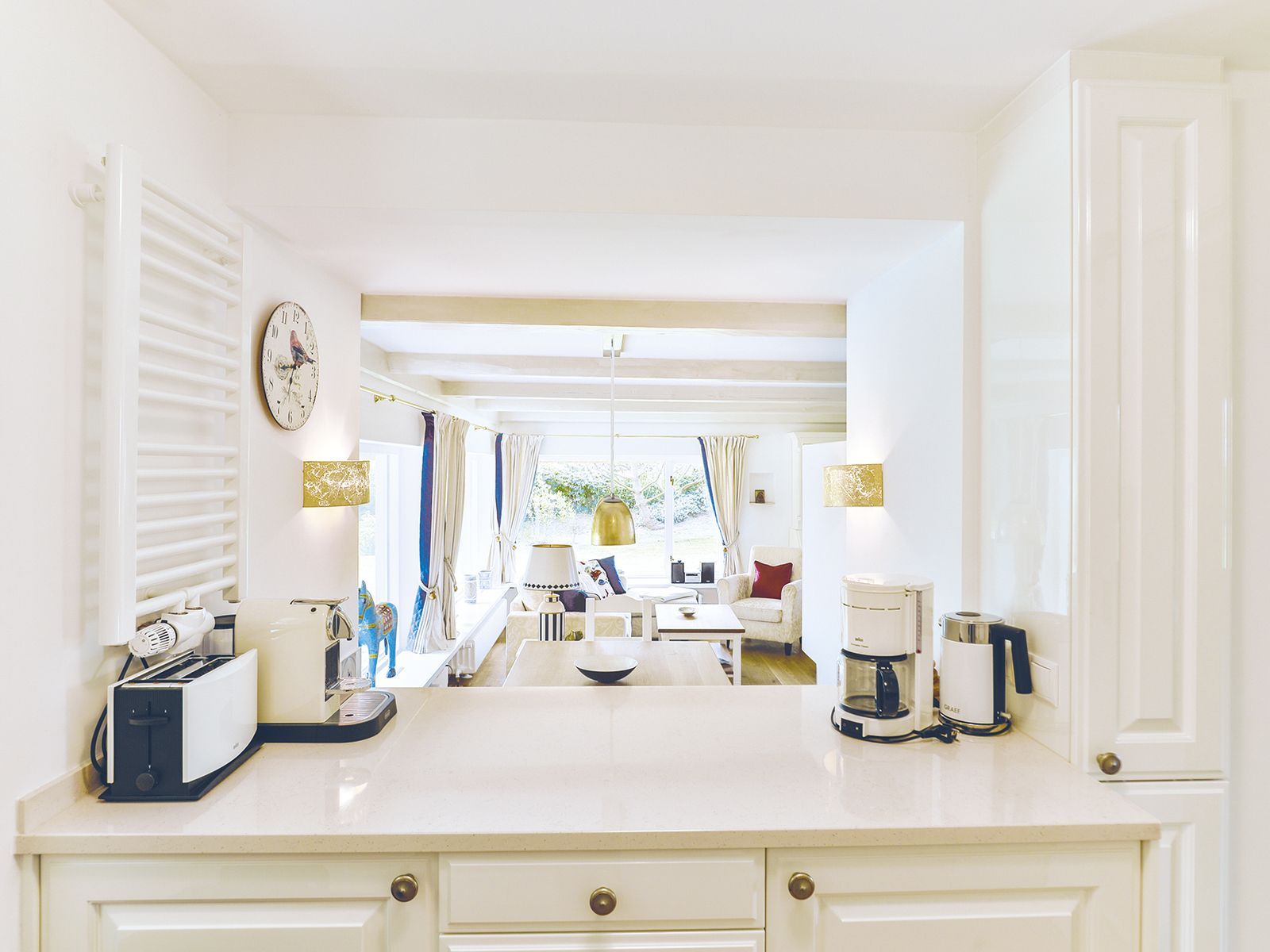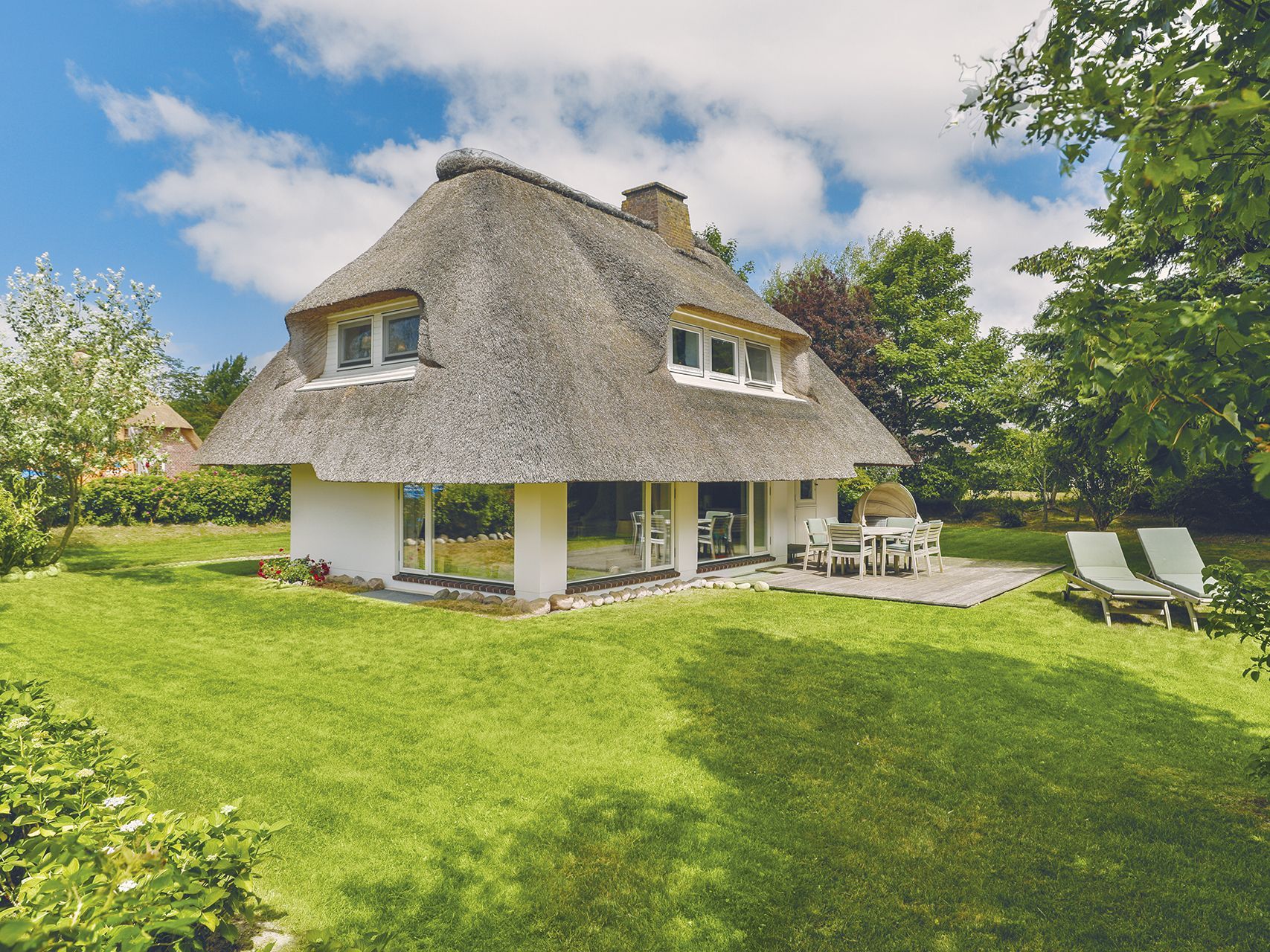 Dieses Einzelhaus unter Reet in exklusiver Lage ist ein echtes Schmuckstück. Der wunderbar, eingewachsene Garten strahlt Ruhe und Erholung aus. Das Erdgeschoss bietet ein zauberhaftes Wohnzimmer mit gemütlichem Essbereich am Kamin und TV, sowie eine offene Küche, von der aus Sie auf Ihre SüdOstterasse gelangen. Ein Gäste-WC finden Sie ebenfalls auf dieser Ebene. Im Obergeschoss erwarten Sie zwei Einzelschlafzimmer und ein Doppelzimmer, alle mit gemütlichen Kojenbetten, sowie ein kompaktes Duschbad mit Doppelwaschtisch. Im Untergeschoss gibt es ein weiteres Doppelschlafzimmer, samt modernem Duschbad mit Doppelwaschtisch und eine eigene Sauna für bis zu vier Personen. Das gesamte Haus ist mit hochwertigem Holzfußboden und hellen Fliesen ausgelegt.