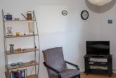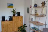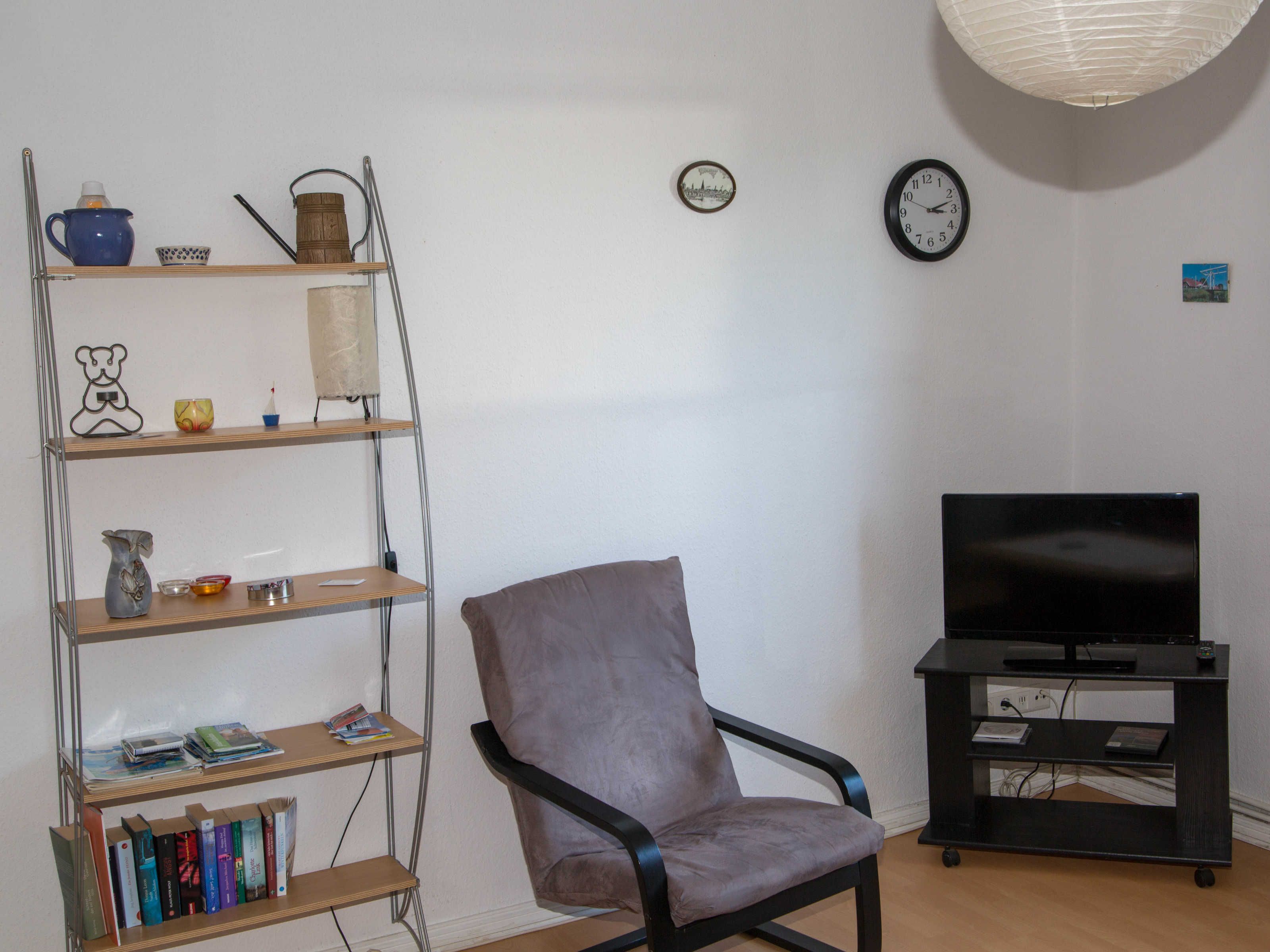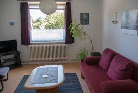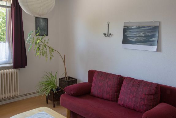 Das helle Wohnzimmer hat eine Schlafcouch mit einer Liegefläche von 1,40 m x 2,00 m, auf der zwei Personen übernachten können. Ein Fernseher mit Satellitenempfang und eine Musikanlage sind vorhanden.
