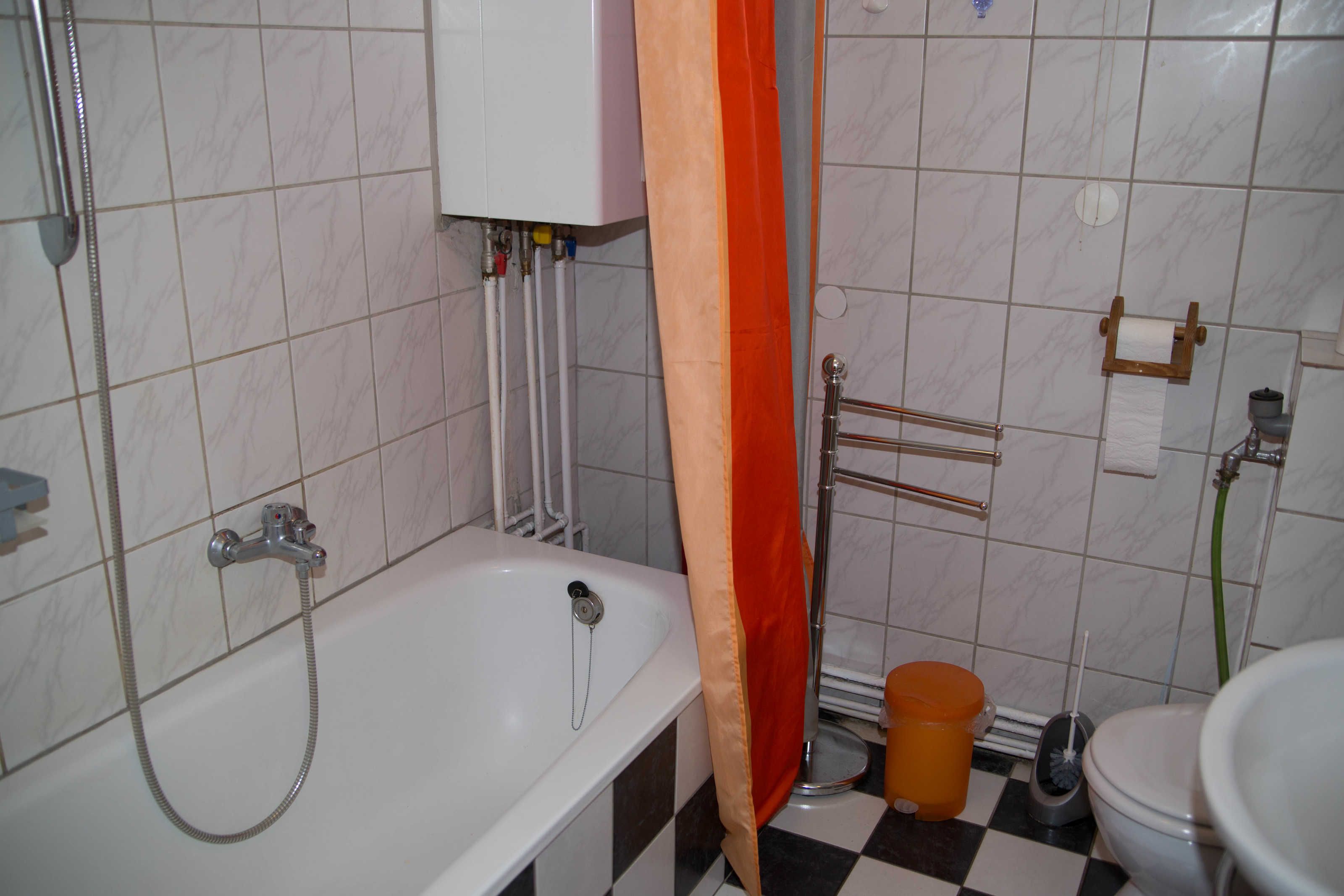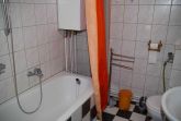 Das Badezimmer ist mit einer Wanne versehen. Ein Schrank unter dem Waschbecken, Spiegelschrank und Handtuchhalter statten das Badezimmer aus.