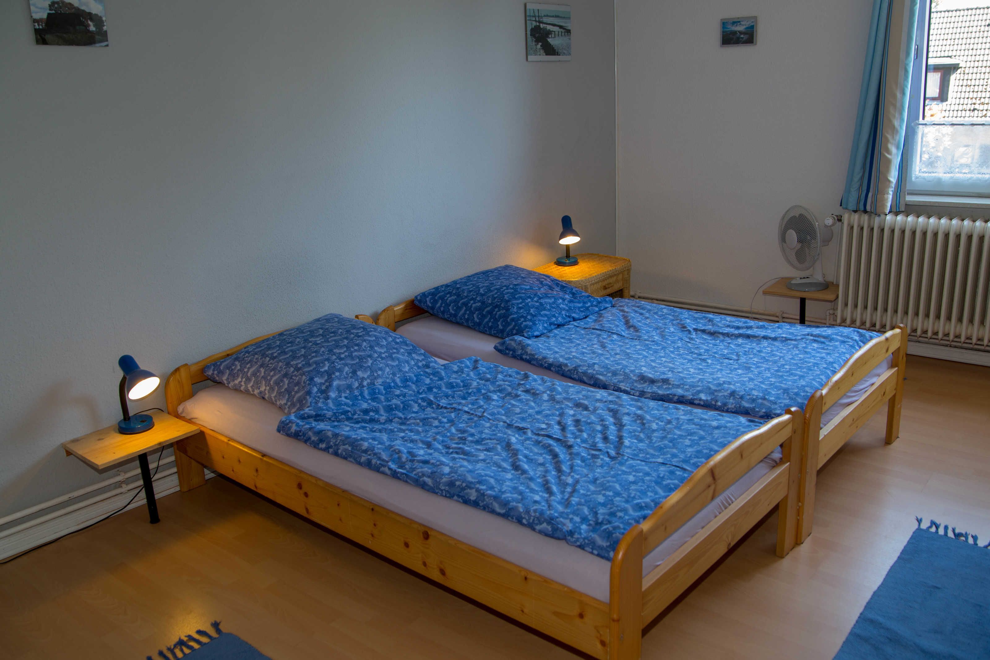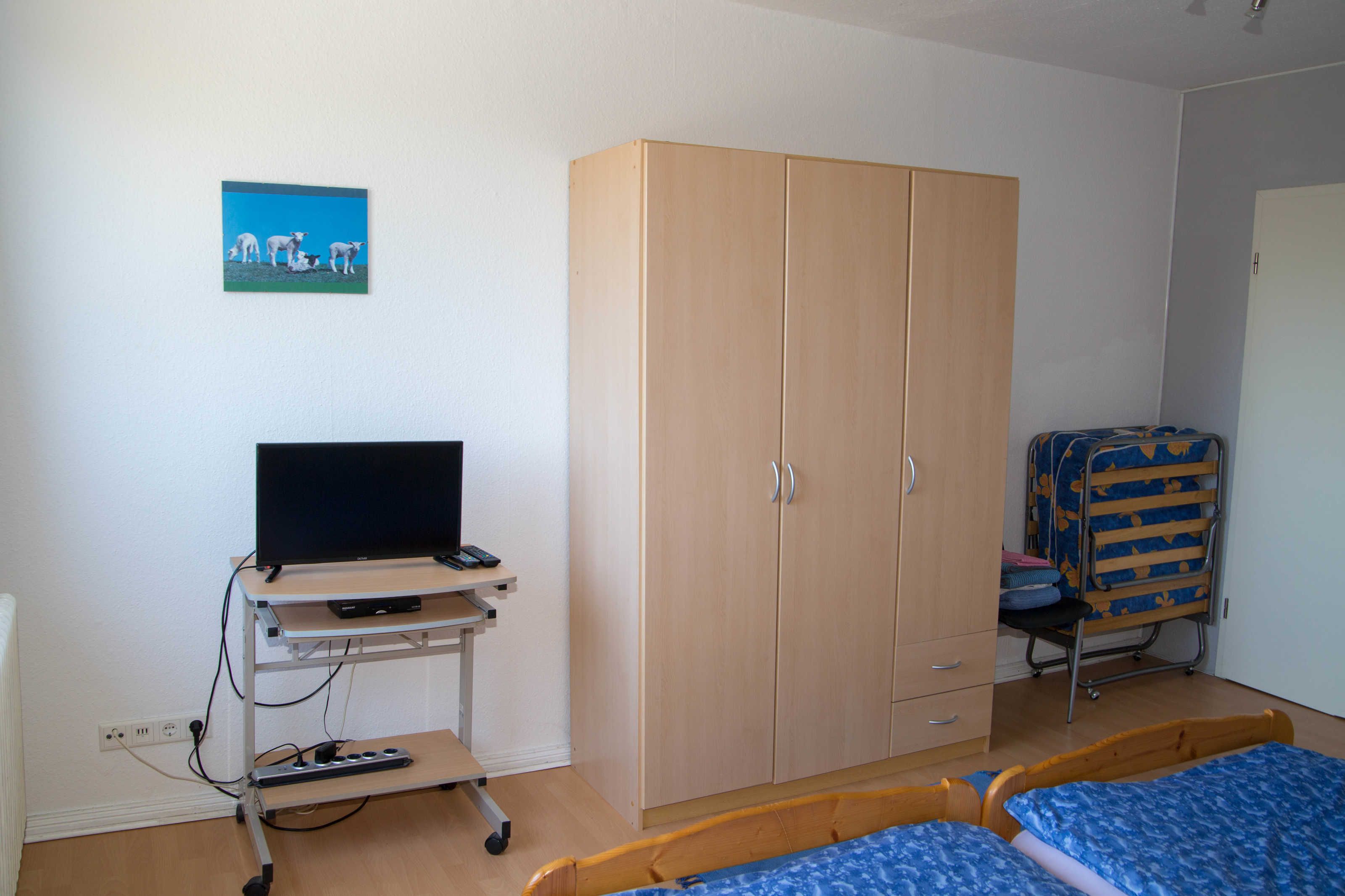 Das Schlafzimmer ist mit zwei Einzelbetten ausgestattet, die bei Bedarf zusammengestellt werden können. Der dreitürige Kleiderschrank bietet viel Platz. Auch in diesem Raum steht ein kleiner Fernseher.