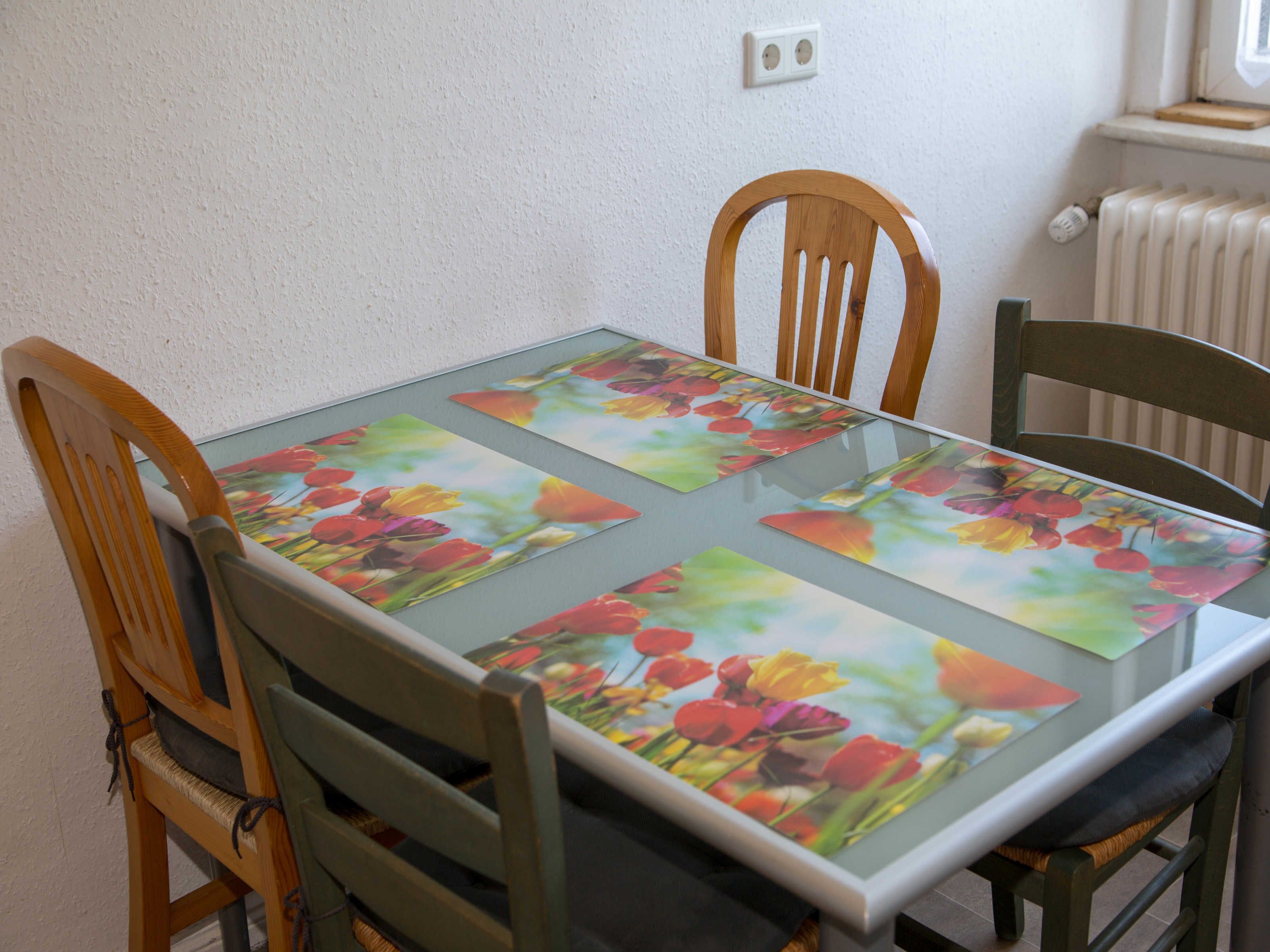 In der Küche steht ein Esstisch, der Platz für bis zu fünf Personen bietet. Spüle, Waschmaschine, Kombikühlschrank und lange Arbeitsplatte statten die Küche aus. Ein Ceranfeldherd und Backofen bietet Gelegenheit zu kochen. Toaster, Kaffeemaschine, Wasserkocher und ausreichend Geschirr sind vorhanden. Wäscheständer, Bügelbrett und Bügeleisen stehen zur Verfügung.
