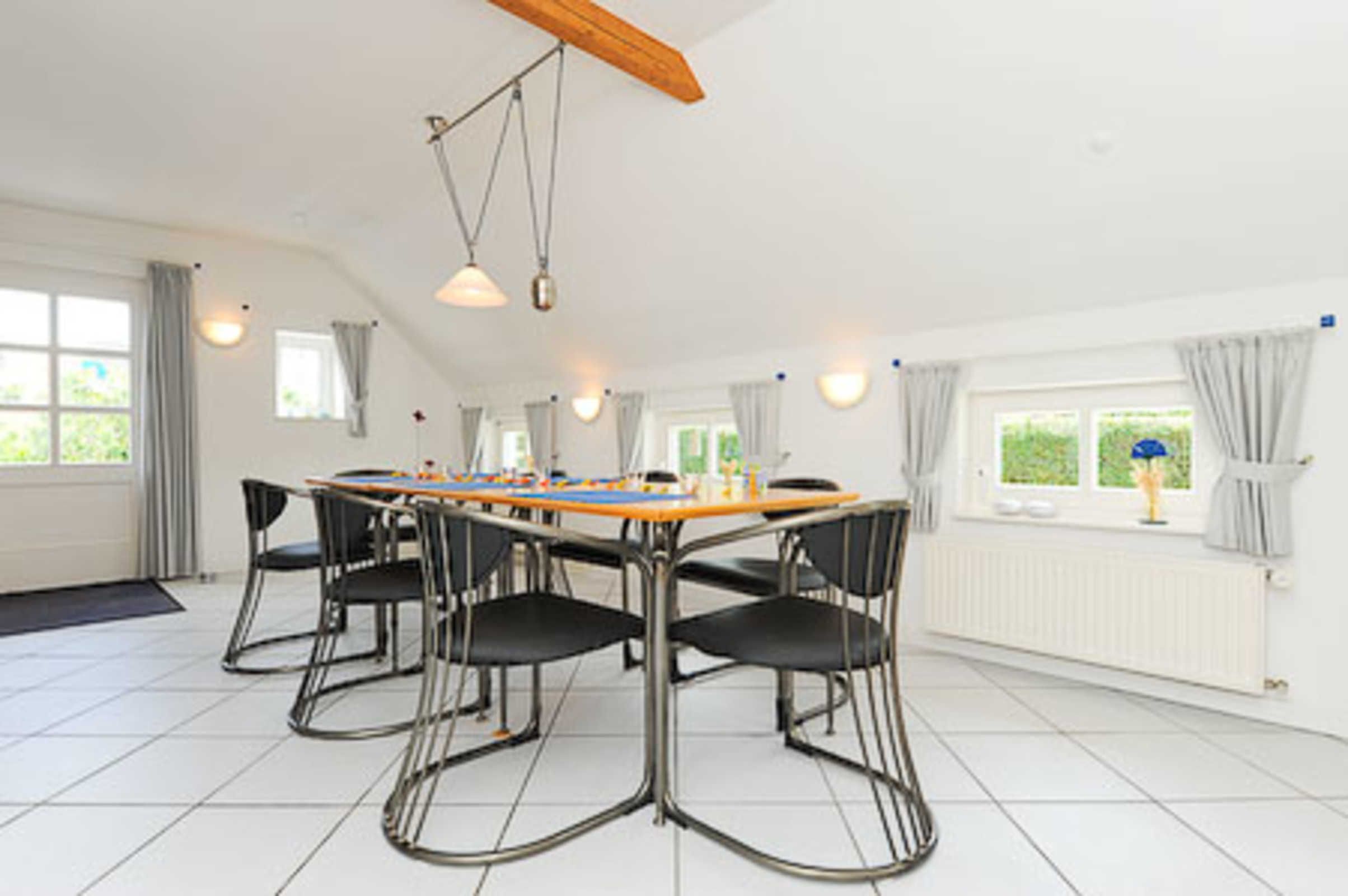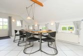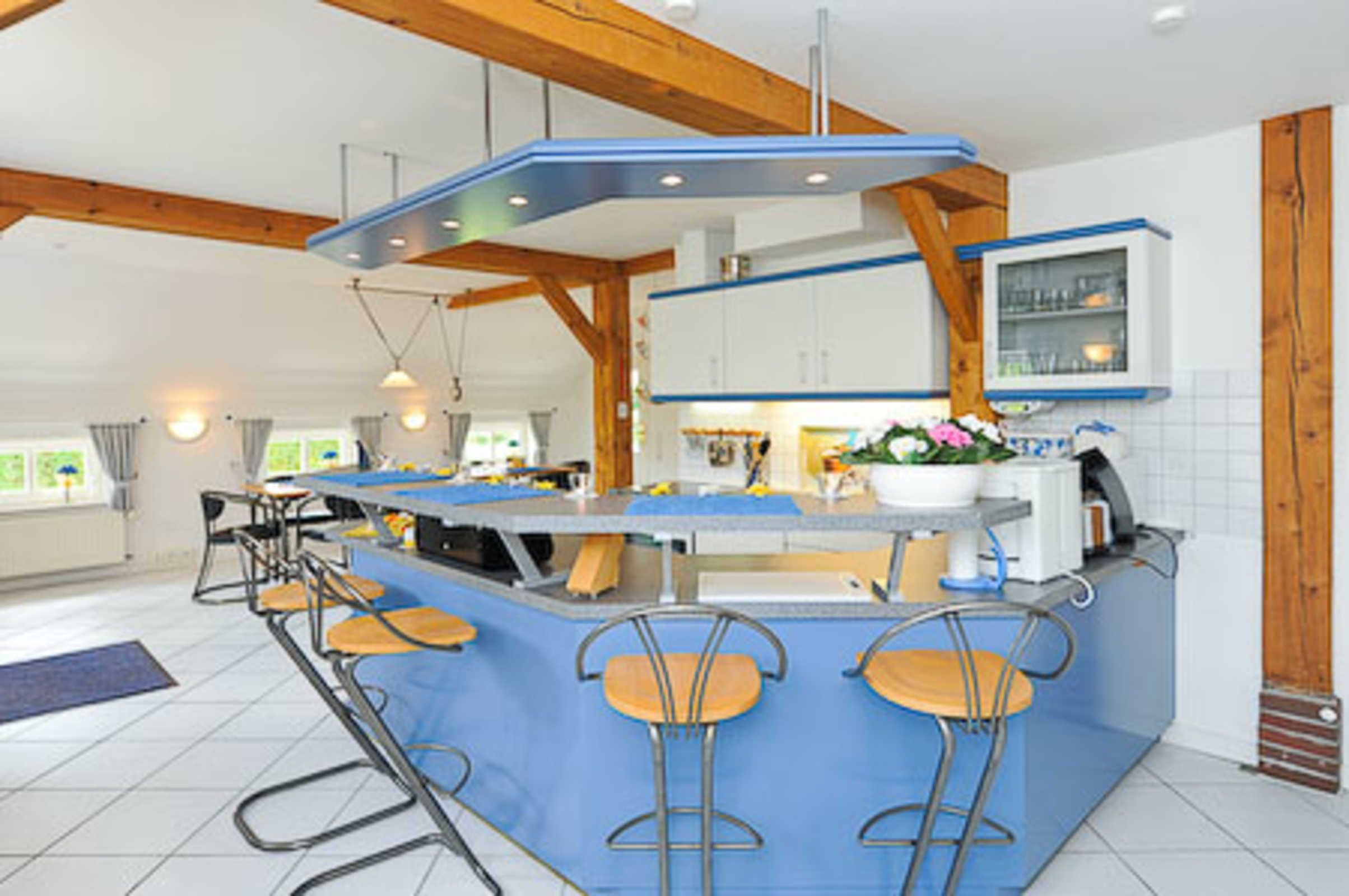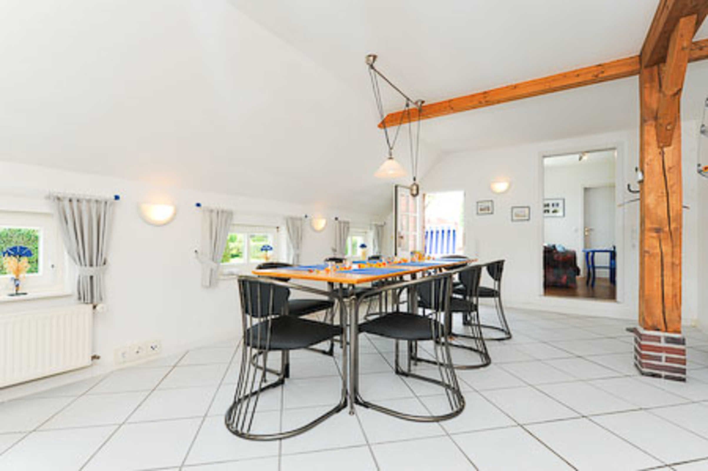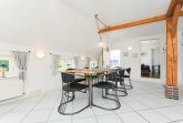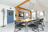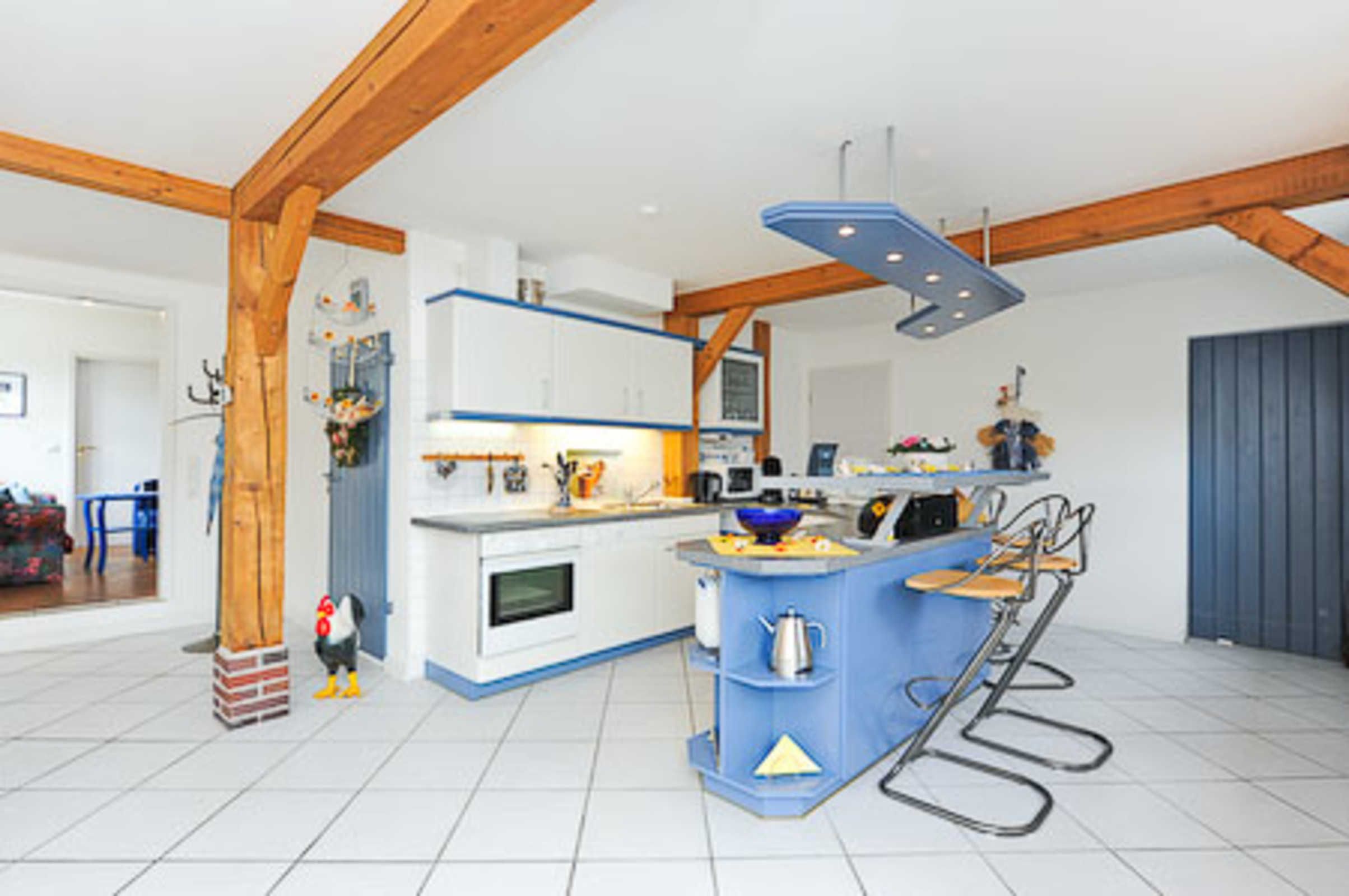 Sehr gemütlich ist die Wohnung besonders durch die offene Balkenlage des ostfriesischen Landhauses. Es gibt viel Holz und die Räume sind dennoch lichtdurchflutet und dadurch und durch die Einrichtung und Gestaltung freundlich-hell. Die Holzfußböden, die Holz-Decken und das Holz-Ständerwerk wurden baubiologisch behandelt, also ohne chemischen Schnickschnack.