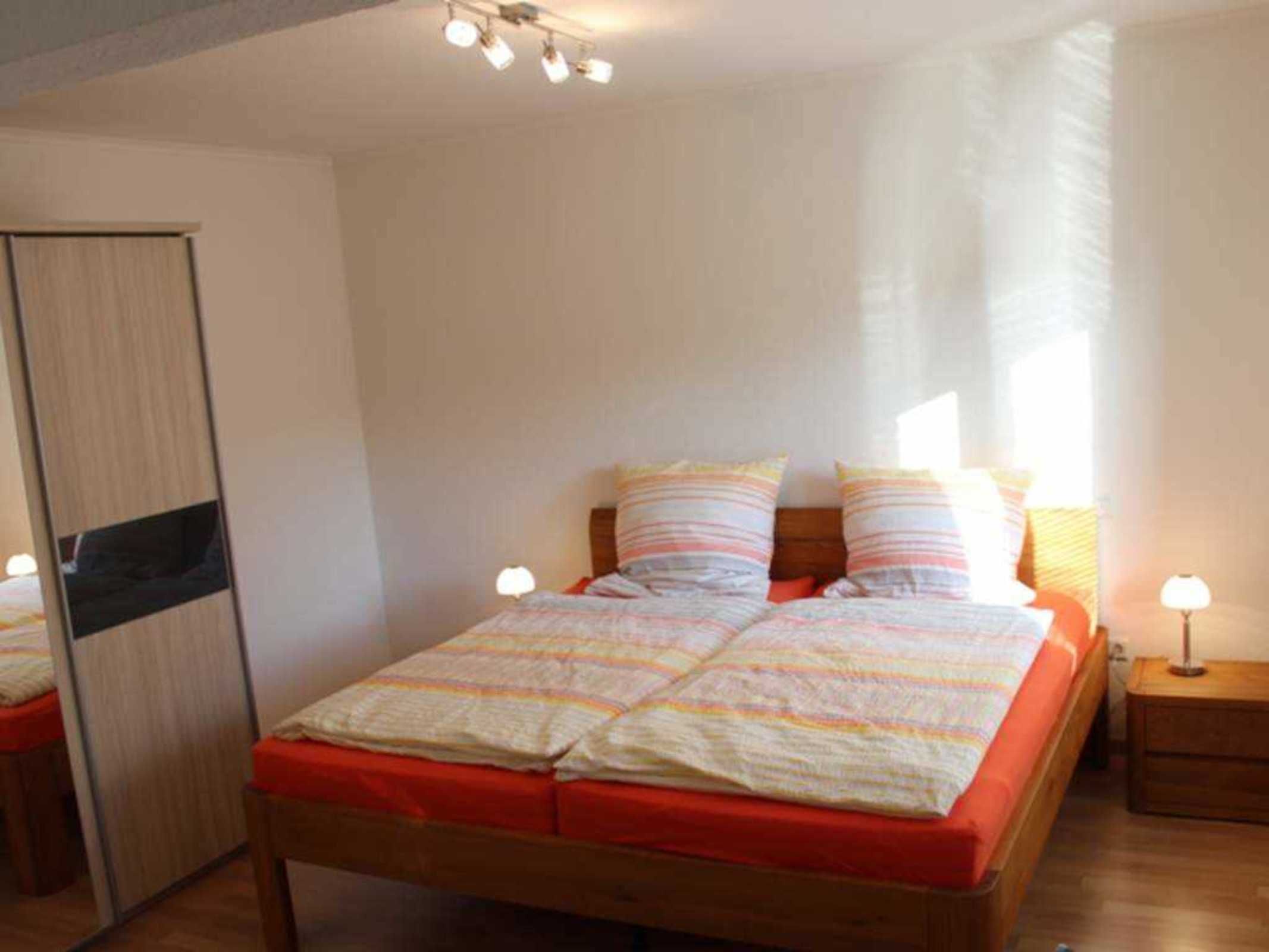 Ein Doppelzimmer im Erdgeschoss mit Doppelbett und einem Badezimmer mit Dusche und WC.