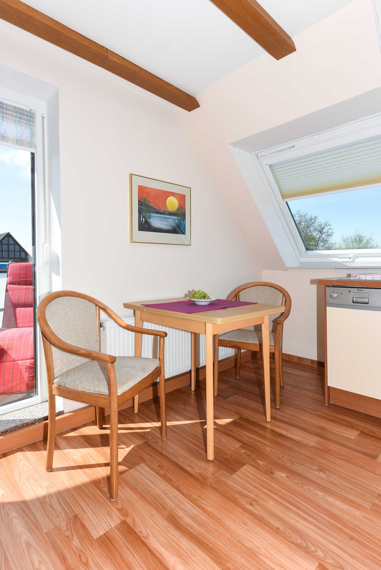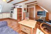 Größe ca. 50 Quadratmeter, Wohnraum mit integrierter Küche, Schlafzimmer, Badezimmer mit Dusche, Waschtisch und WC, Obergeschoss, Balkon, optimal für 1 bis 2 Personen