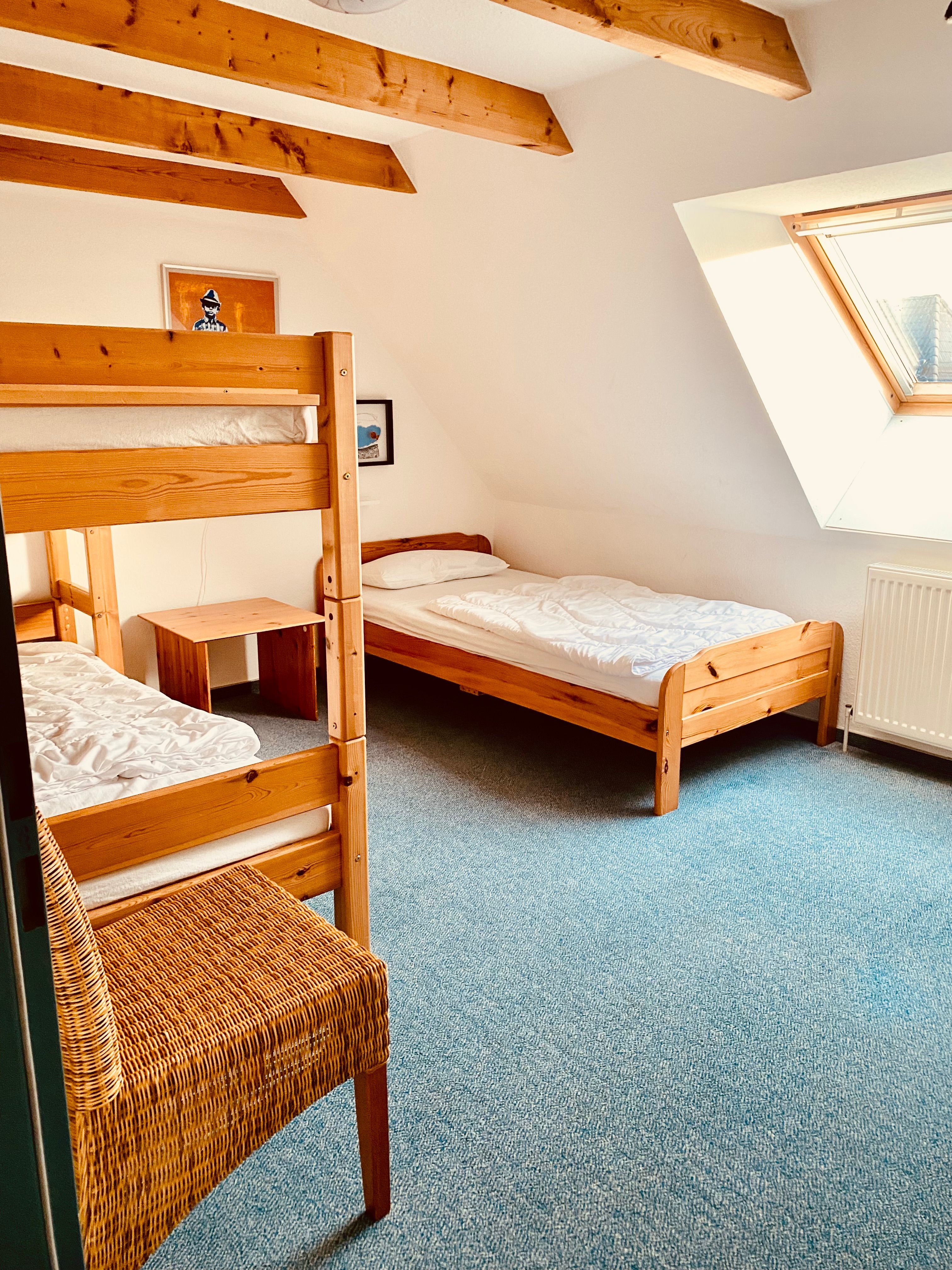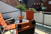 Unsere Ferienwohnung ist im Obergeschoss. Sie ist nach Süden ausgerichtet und immer hell. Es gibt einen großen Wohnraum mit gemütlicher Sitzecke, Essecke und Küchenzeile. Der Wohnraum führt auf den schönen, großen Sonnenbalkon. Auf gleicher Ebene finden Sie ein Schlafzimmer (2 Betten), Toilette und Eingangsflur. Eine Treppe höher finden Sie ein weiteres Schlafzimmer (Kinderzimmer) mit einem Etagenbett und einem Kinderbett. Gleich daneben ist die Dusche mit WC.