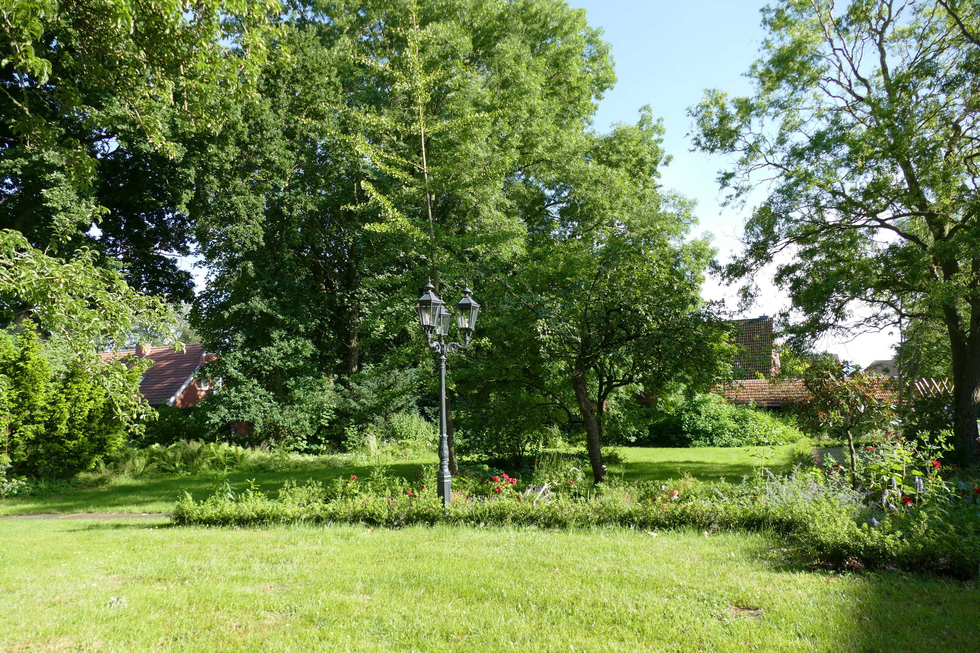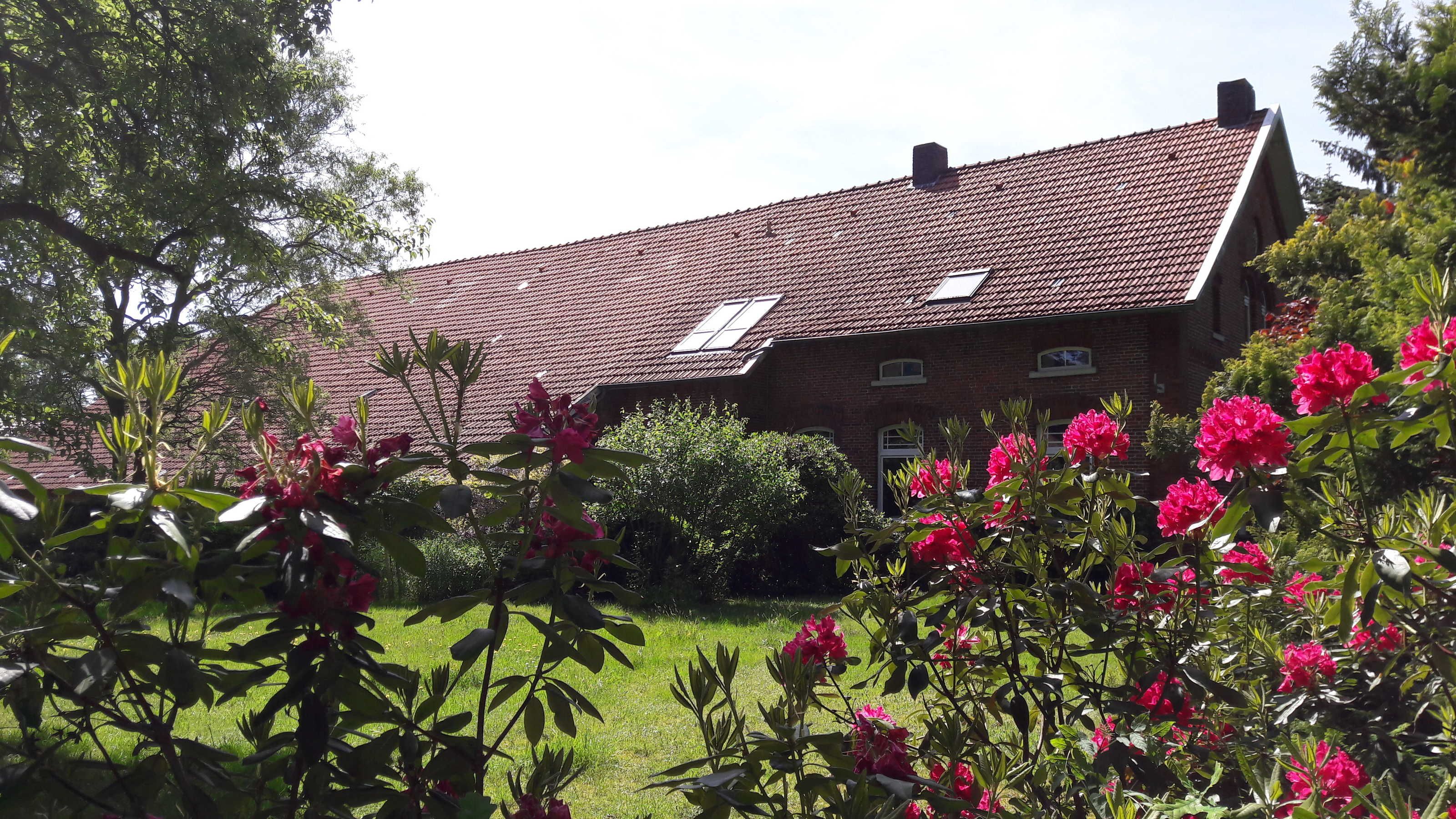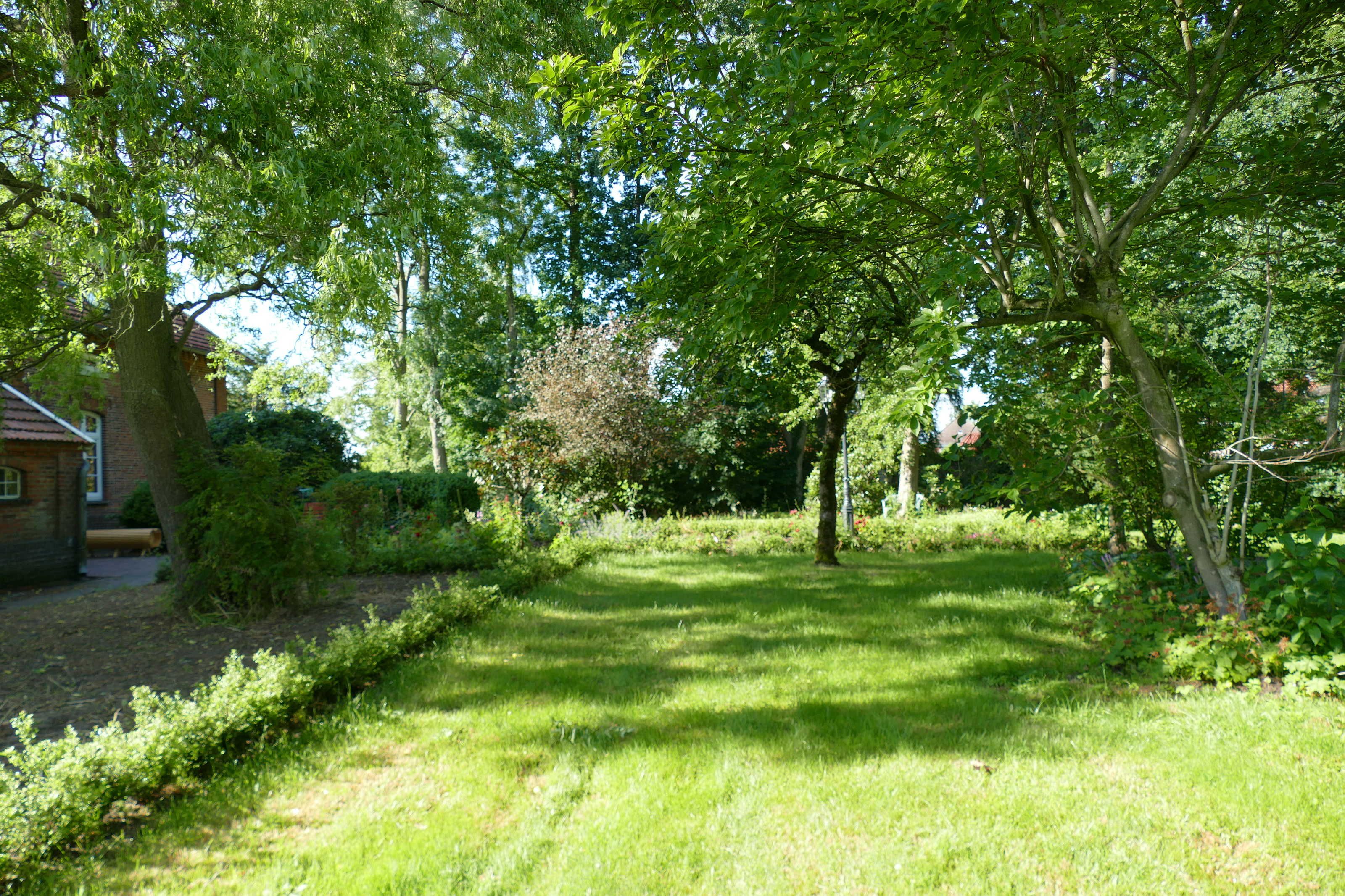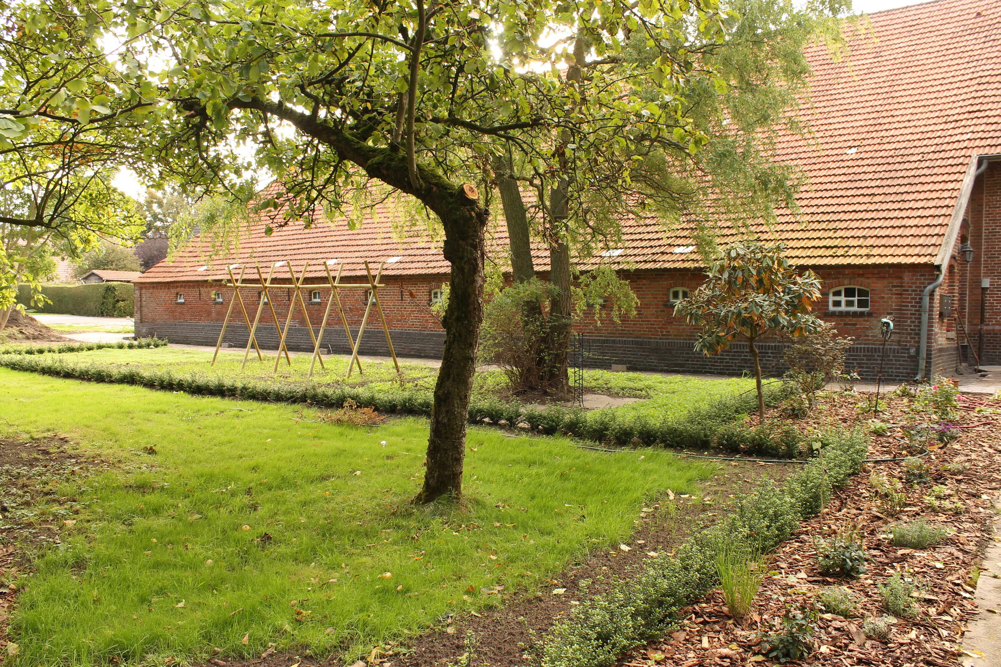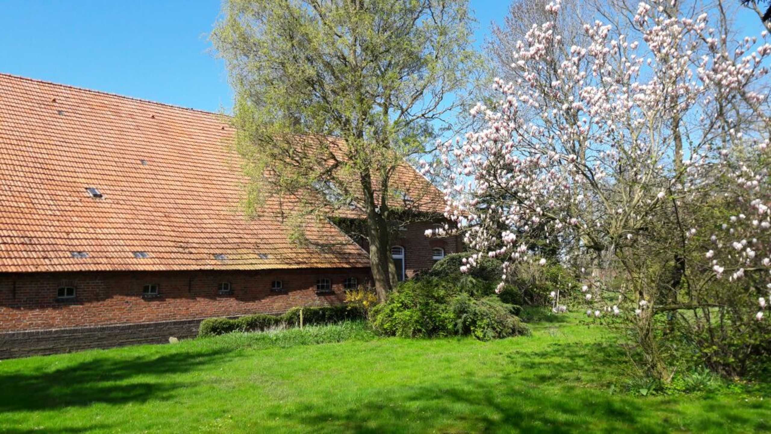 Ein herrlicher großer Bauerngarten umgibt das historische Gebäude, begrenzt durch einen breiten Graben - auch Gracht genannt - sowie einen reichen, alten Baumbestand z. T. über 100 Jahre alt. Mittendrin haben wir eine Schaukel für Kinder eingerichtet, auf der es sich in jedem Alter bis in luftige Höhe schwingen lässt. Der Garten besticht weiterhin je nach Jahreszeit durch Obstbäume, herrlich blühende Rhododendronbüsche in prächtigen Farben, einer Magnolie, einem Meer von Buschwindröschen, Osterblumen, Schneeglöckchen, Krokussen, Gänseblümchen und Löwenzahn. Rosenbeete zieren den Eingangsbereich. Gerne dürfen sich unsere Gäste an den Schnittblumen und Obstbäume frei von Schadstoffen bedienen. Der Garten lädt ein zum Spielen und zum Lauschen der Vogelstimmen, die sich in nächster Nähe in unterschiedlichem Tonlagen „unterhalten“.ein. Abends fasziniert bei klarem Himmel der Sonnenuntergang am Himmel inmitten des beeindruckenden ostfriesischen Wolkenhimmels. Das alles können sie beim Grillen auf der Terrasse beobachten und hören. Tagsüber lässt sich die Friesische Freiheit hautnah auf Radwandertouren erleben, wenn Sie Ihren Blick streifen lassen über die grünen Wiesen bis zum Horizont.