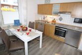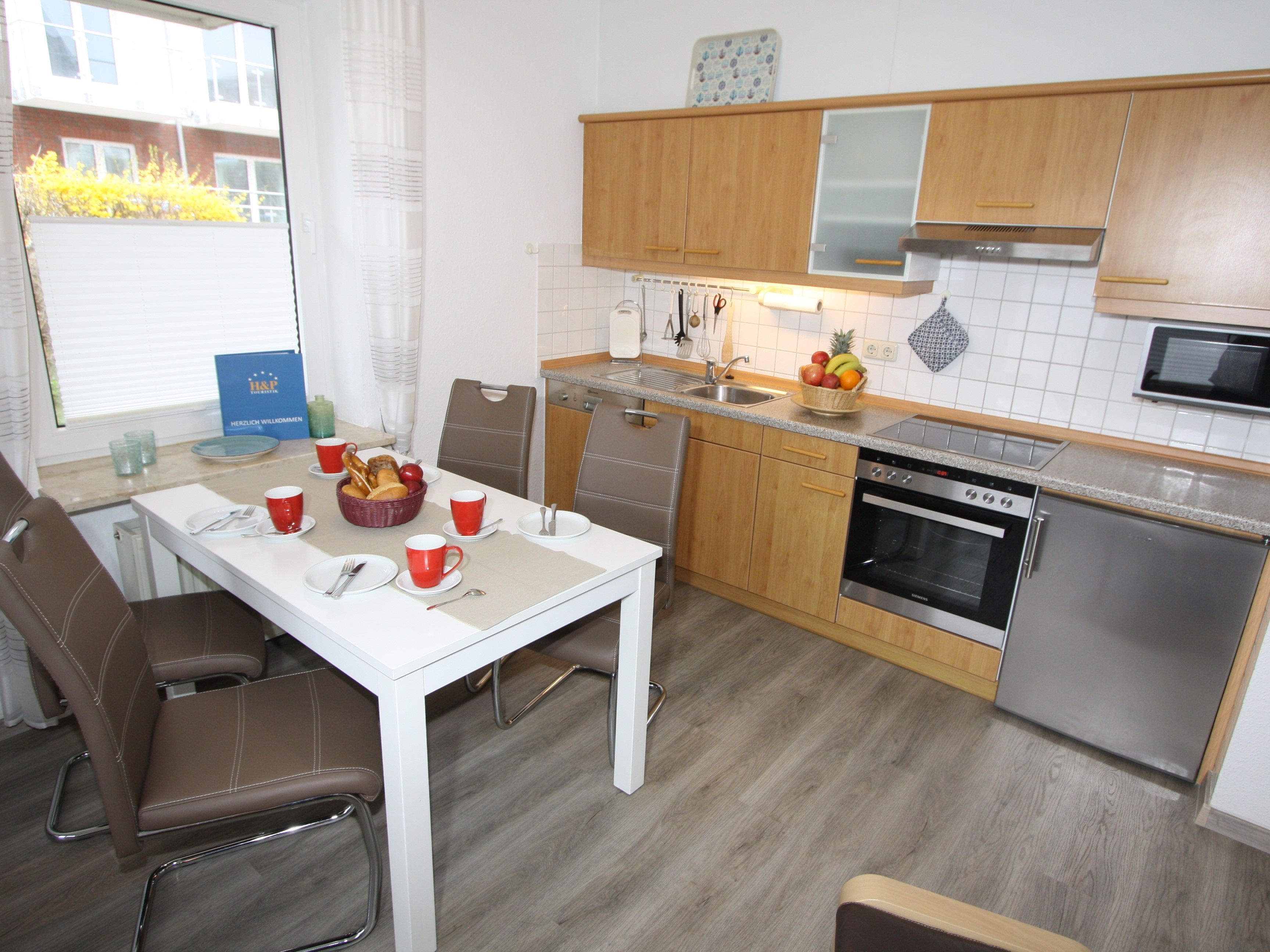 Die Ferienwohnung verfügt über einen Schlafraum mit Doppelbett und einen Wohnraum mit gemütlicher Sitzecke, Essecke und integrierter Küchenzeile (Geschirrspüler, Mikrowelle).
