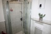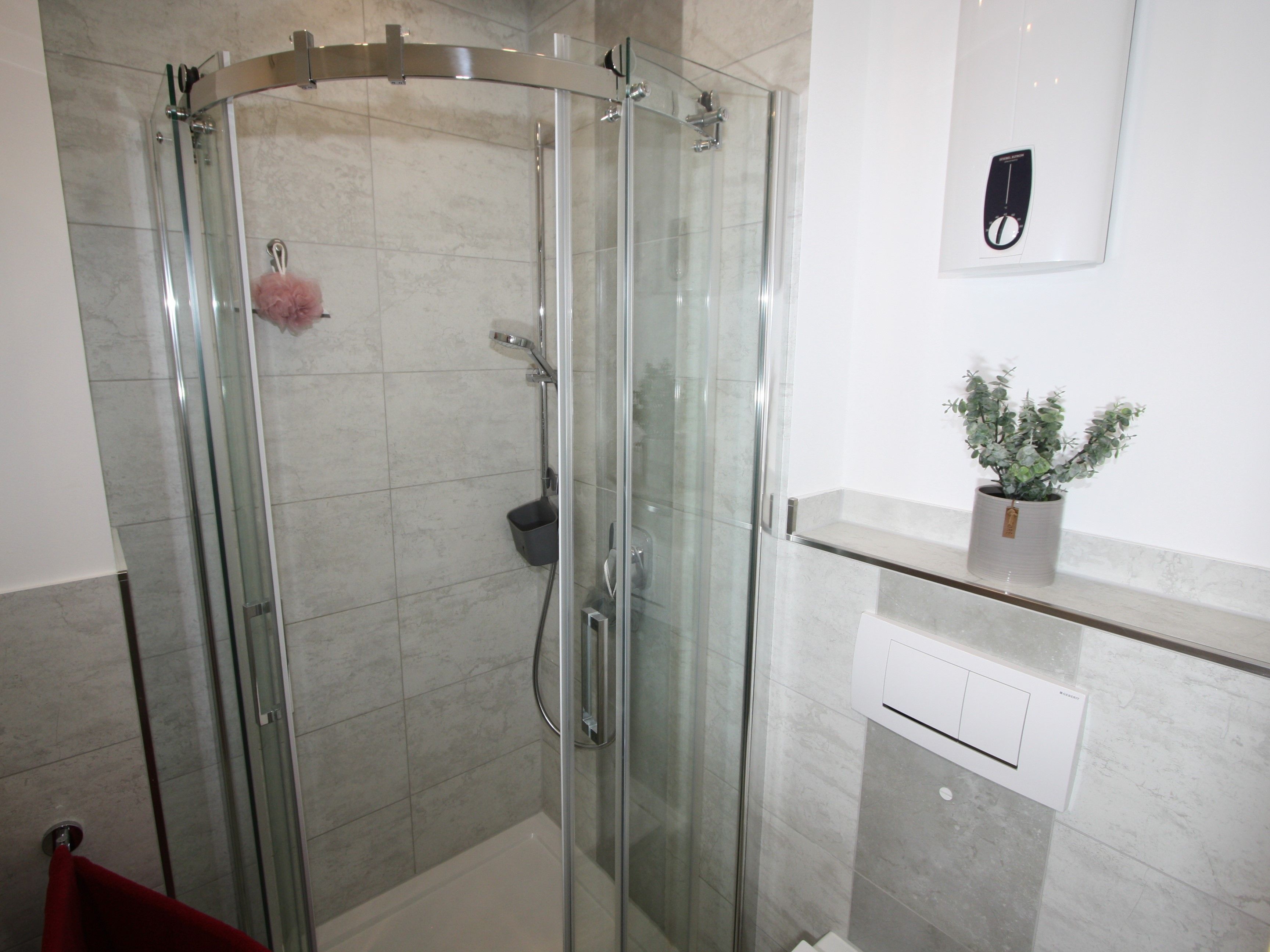 Das Bad ist mit bodenebener Dusche und WC ausgestattet.