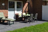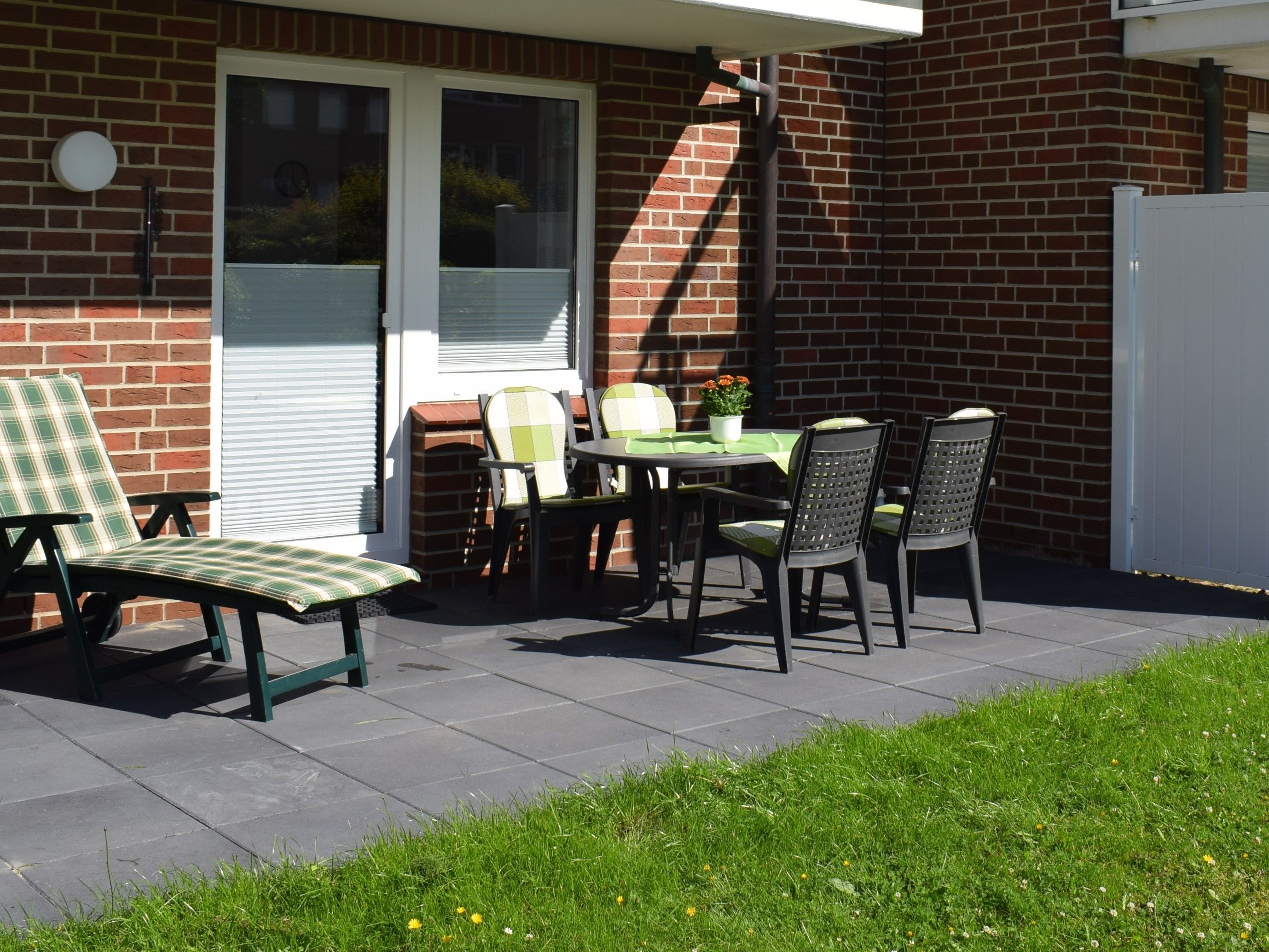 Sie haben eine großzügige Terrasse mit Gartenmöbeln und Sonnenliege zur Westseite.