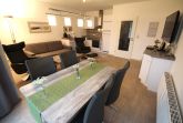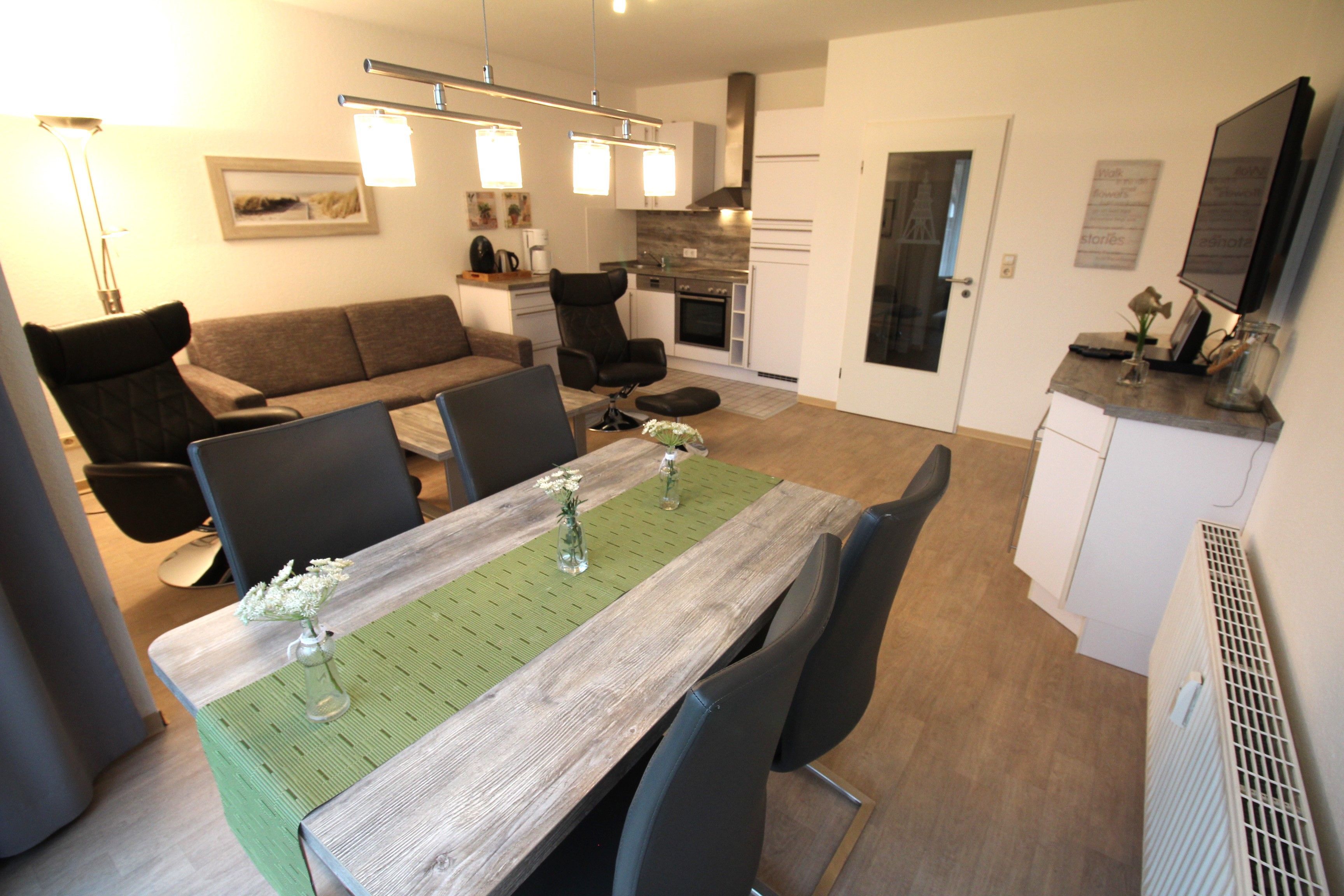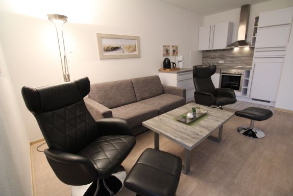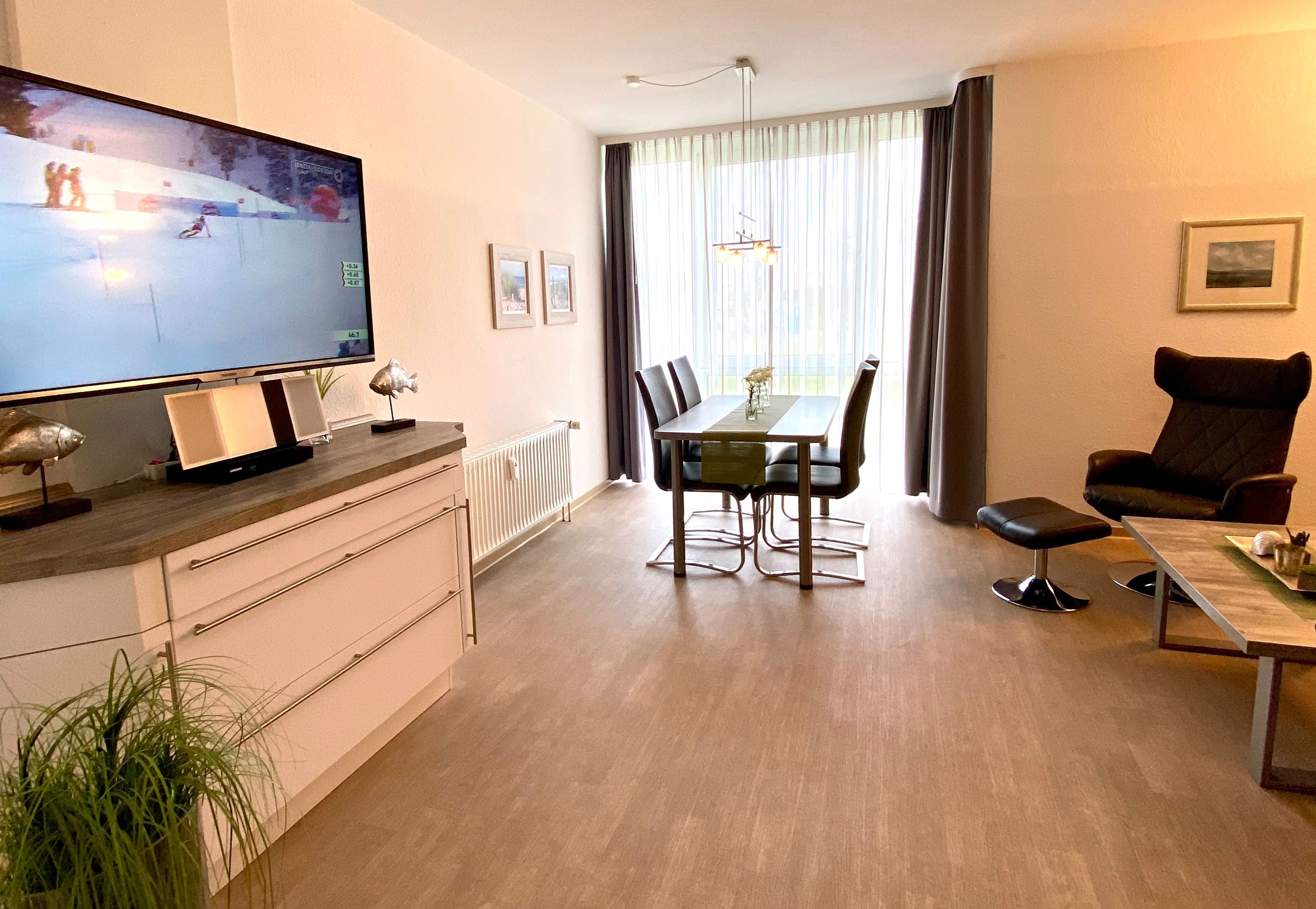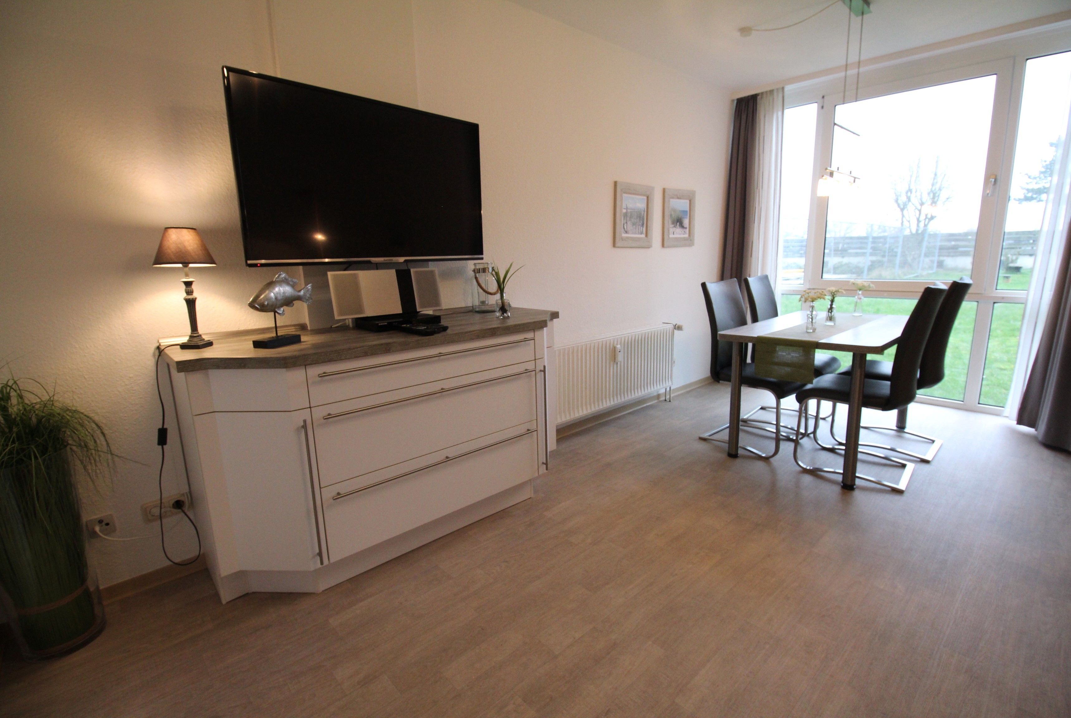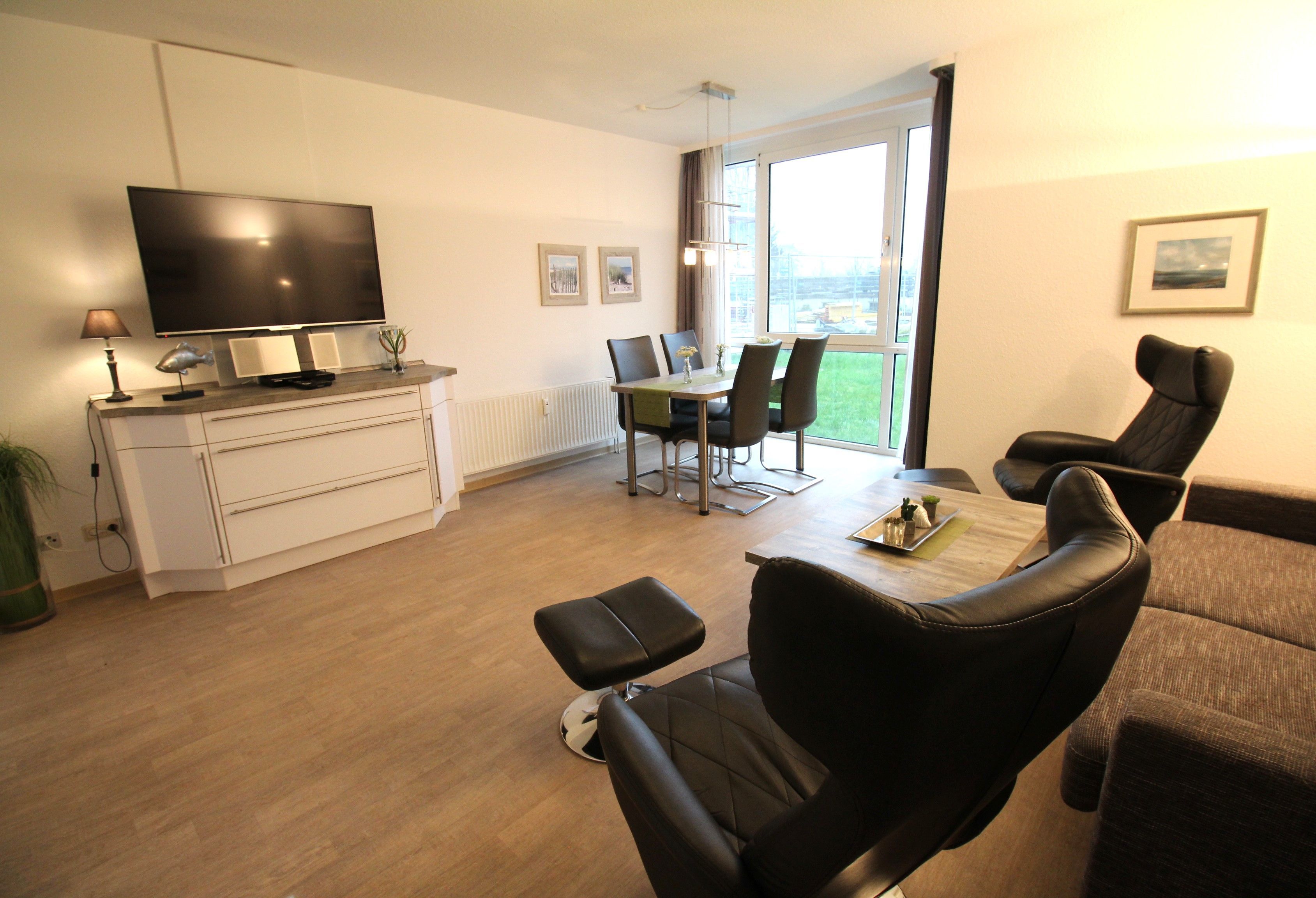Im gemütlichen Wohnraum, mit bequemer Doppelbettcouch (150 cm x 200 cm) und den modernen Relaxsesseln genießen Sie entspannte Fernsehmomente mit Blick auf das komfortable TV (49 Zoll). Vom Essplatz aus, durch die große Fensterfront, haben Sie Blick auf Garten und Deich