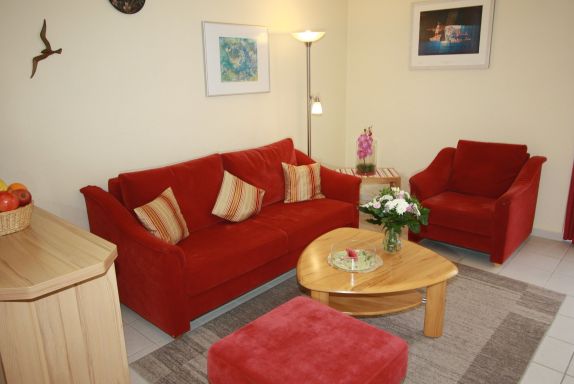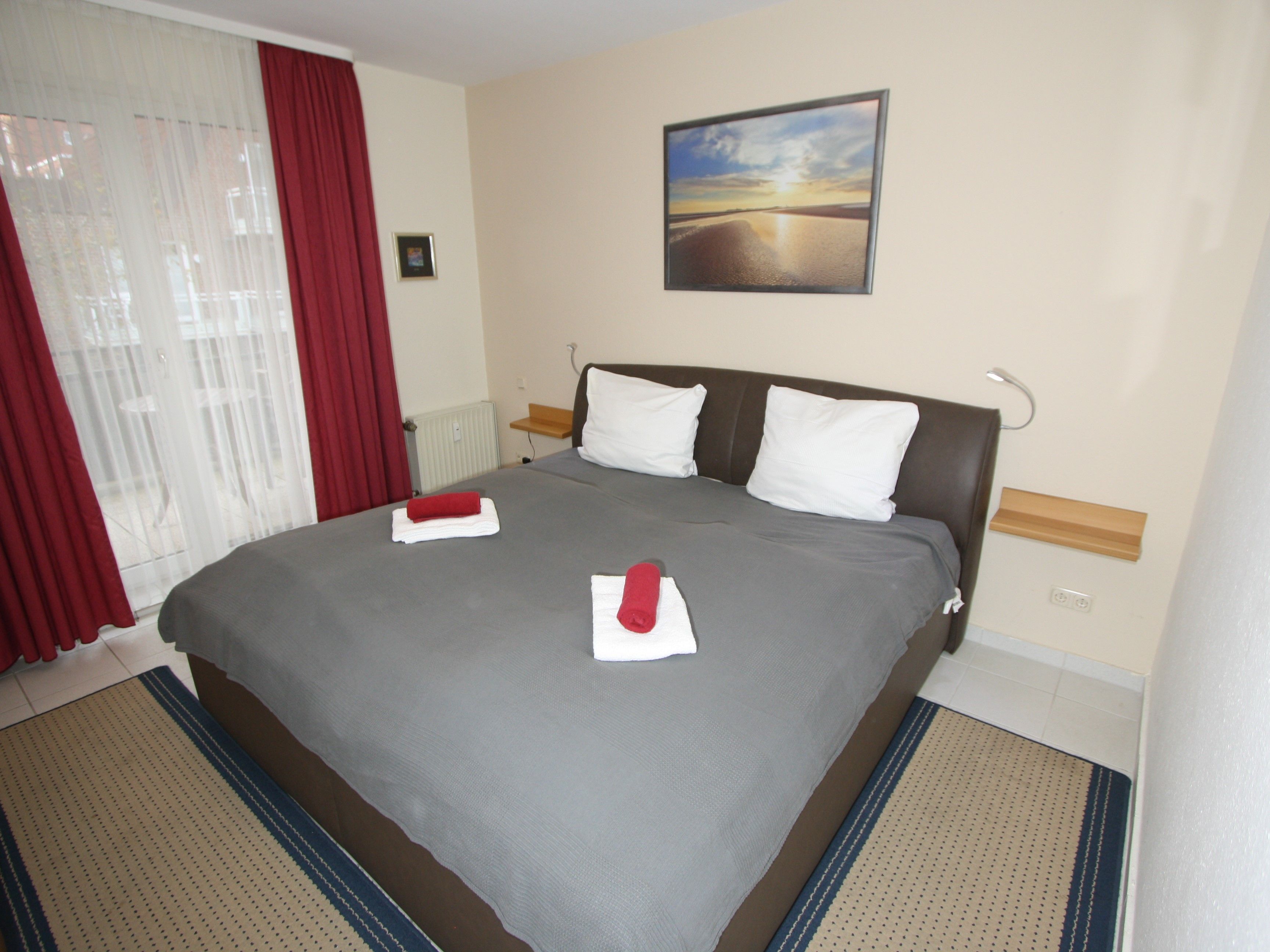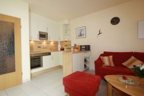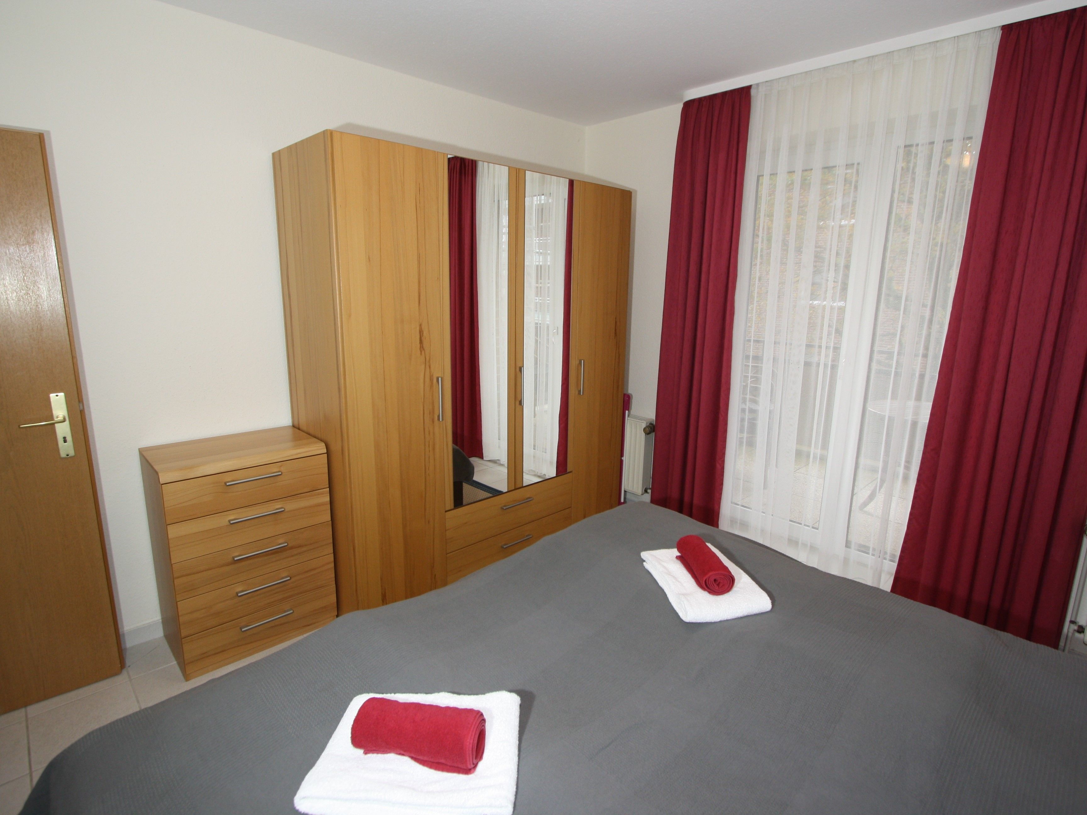 Sie wohnen in einem großzügigen 2-Zimmer-Appartement für bis zu 2 Personen auf 46 m² Wohnfläche im 1. Obergeschoss. Ein Schlafzimmer mit Doppelbett, Wohnraum mit Couch, separater Essplatz, voll ausgestatteter Küchenbereich, Dusche/WC, Balkon, SAT-TV und Telefon. PKW-Stellplatz in der Tiefgarage.