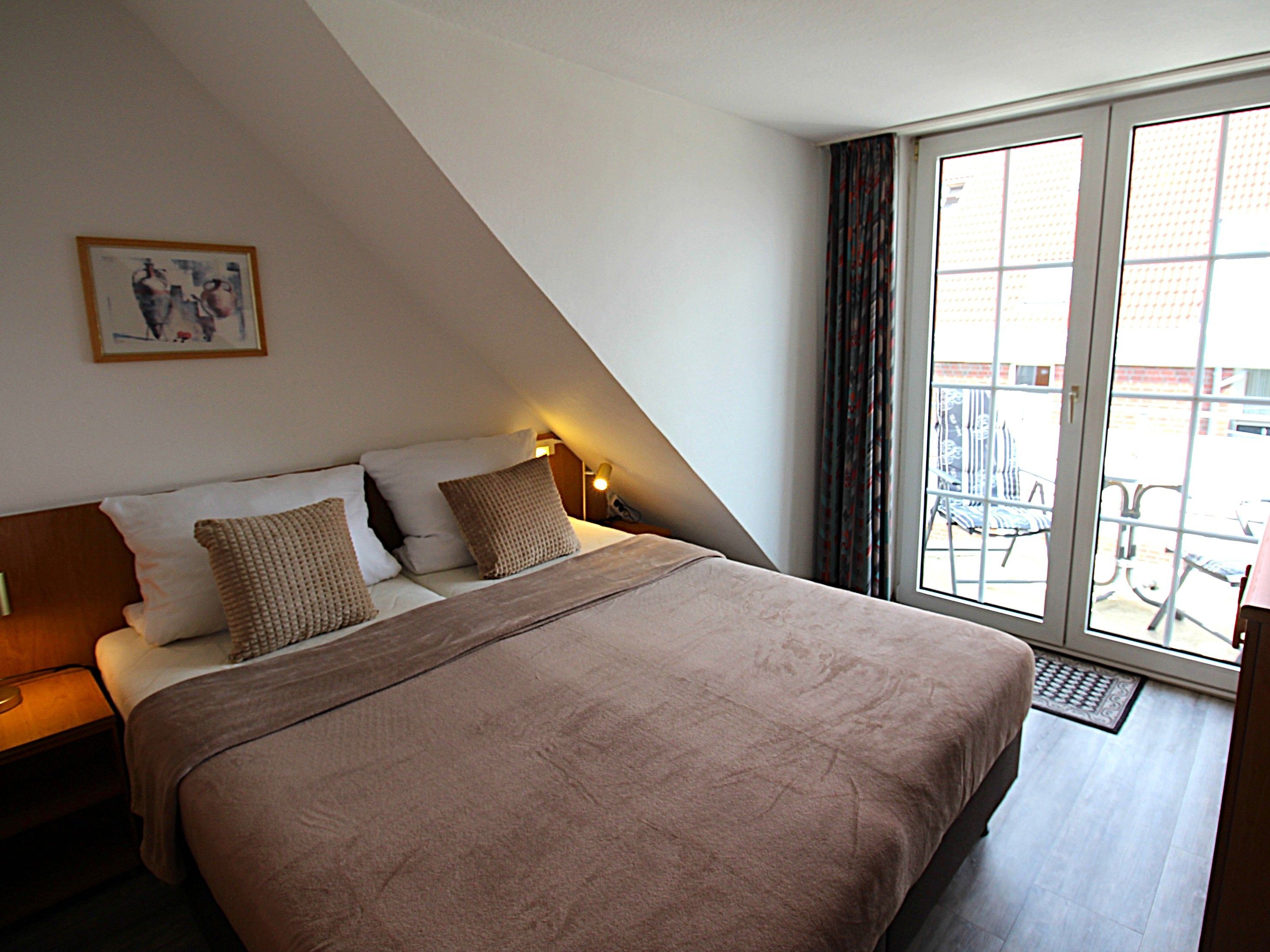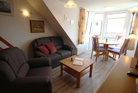 3-Zimmer-Appartement für bis zu 5 Personen auf ca. 50-55 m². Ein Schlafzimmer mit Balkon und Doppelbett, zweites Schlafzimmer mit Doppel- und Einzelbett. Wohnraum mit Couch, TV, separatem Essplatz im Erker und voll ausgestattetem Küchenbereich. Bad mit Dusche/WC. WLAN und PKW-Stellplatz vorhanden.