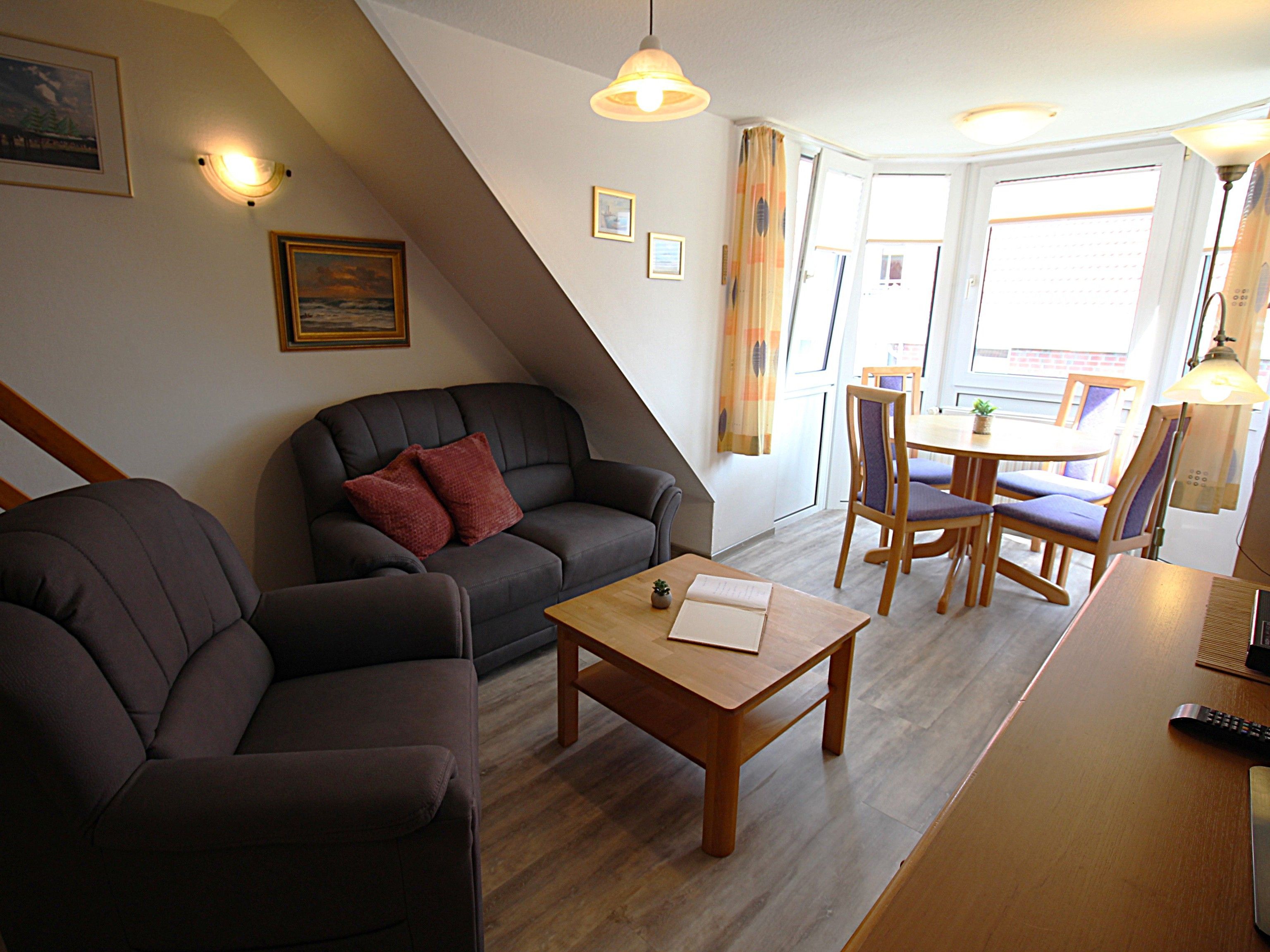 Sie wohnen direkt gegenüber des Strandzugangs in einem 3-Zimmer-Appartement für bis zu 5 Personen auf ca. 56 m² in der 3. Etage. Die Wohnung ist im Haus mit dem Aufzug erreichbar und teilt sich in eine charmante Maisonette Wohnung mit zwei Etagen auf.