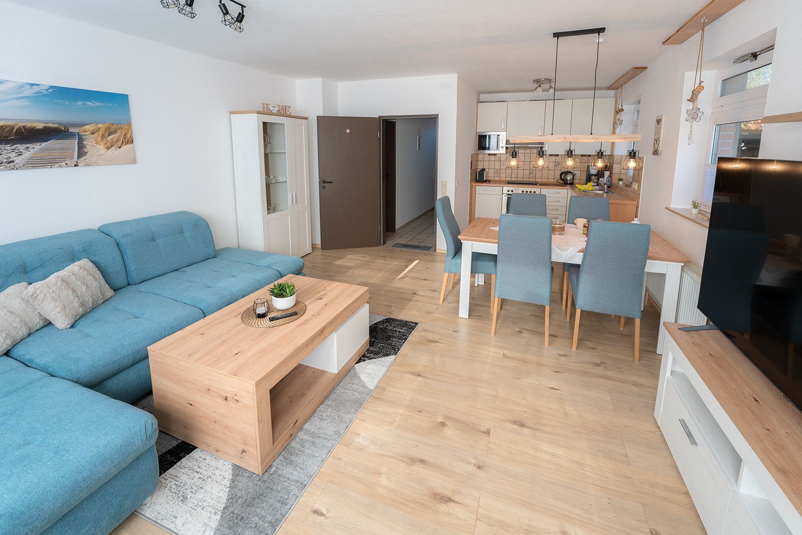 Vom Eingangsbereich mit Gäste-WC und Garderobe erreichen Sie das gemütliche Wohnzimmer mit integrierter Küchenzeile und dem Essplatz für vier Personen. Hier ist der Ausgang zur Terrasse mit Zugang zum schön begrünten Gemeinschaftsgarten.