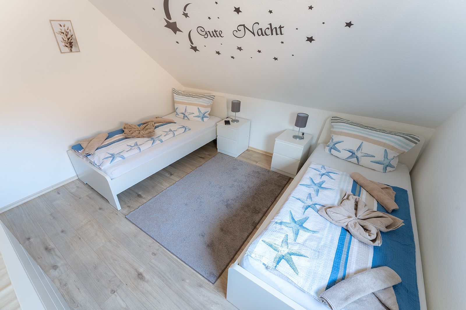 Im ersten OG befinden sich das Fenster-Duschbad und zwei Schlafräume. Einer ist ausgestattet mit einem Doppelbett, der andere mit zwei Einzelbetten sowie je einen großen Kleiderschrank.