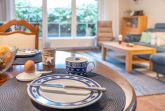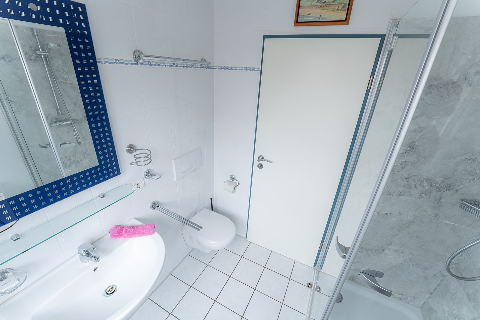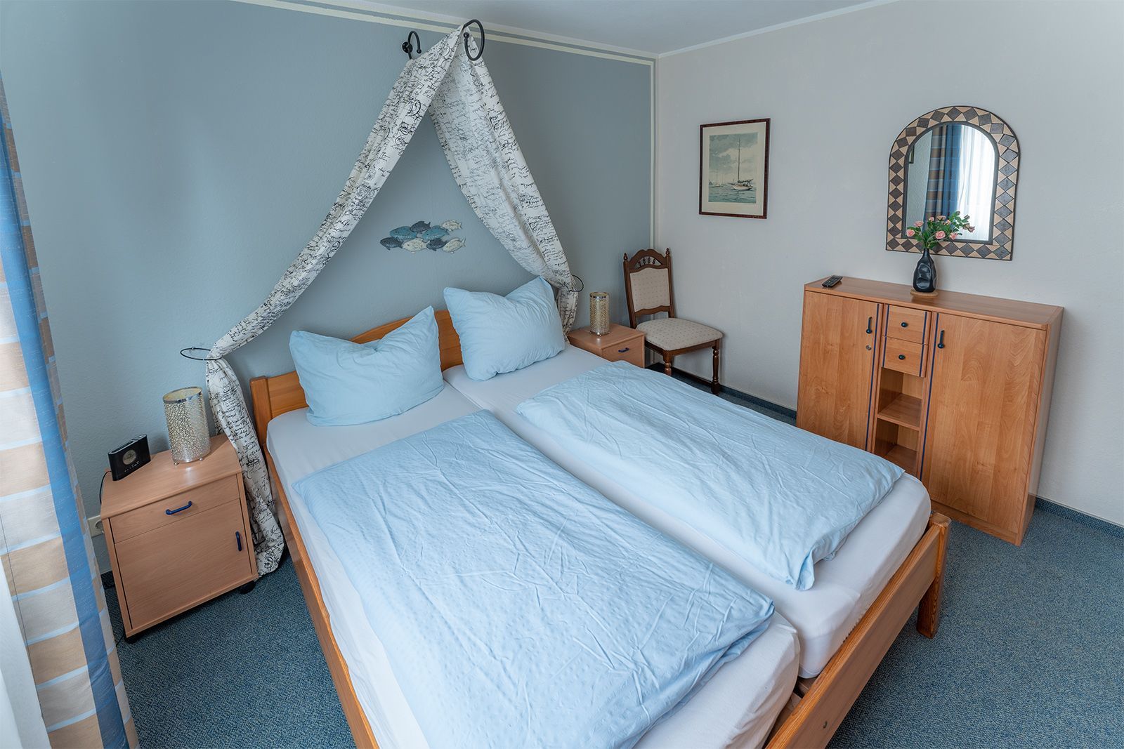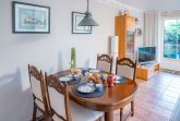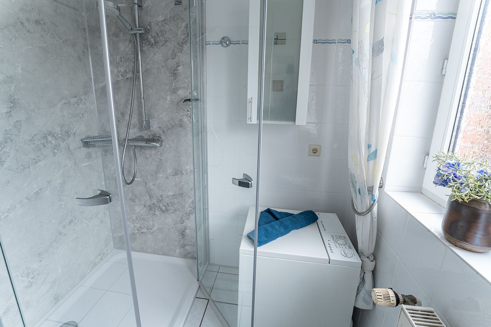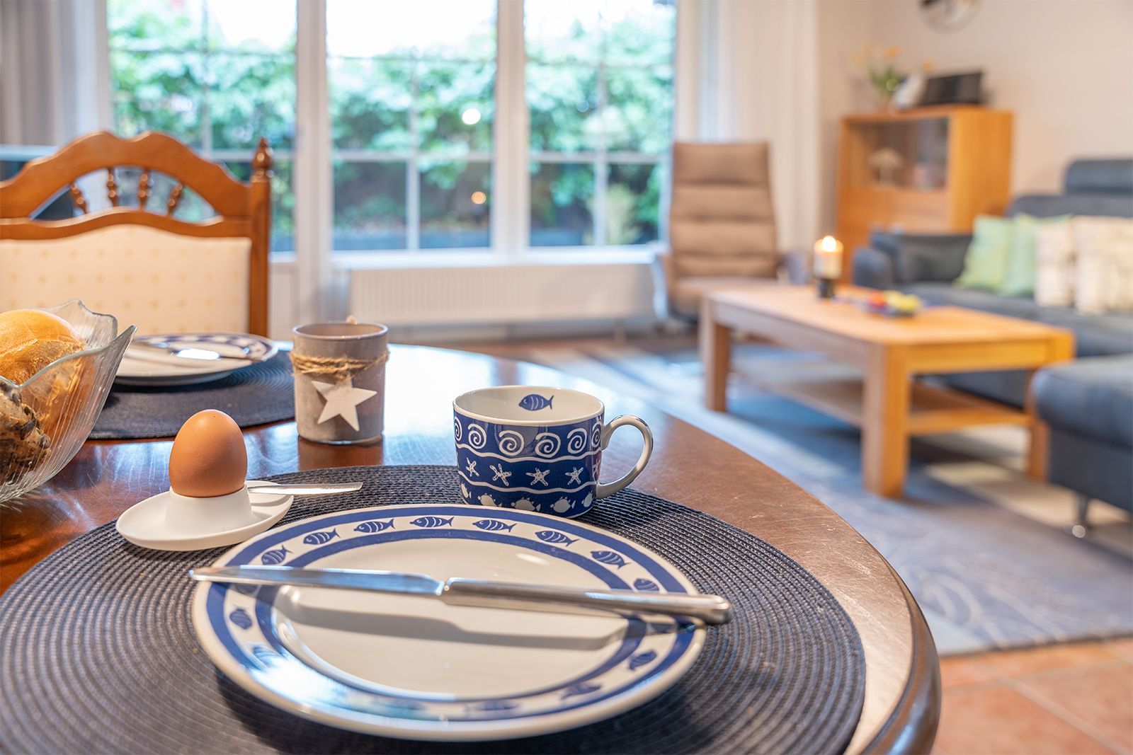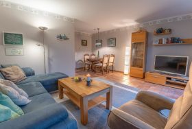Sie betreten diese freundliche Ferienwohnung im Erdgeschoss durch eine geräumige Diele. Rechts gelegen das helle Fenster-Duschbad mit Waschmaschine. Eine separate Küche bietet Ihnen eine komplette Grundausstattung. Geradeaus geht es in den mediterran sonnig gestalteten Wohn-/Essbereich mit Flachbild-TV, DVD-Recorder und einer Auswahl an DVDs, Büchern und Spielen. Der Schlafraum hat Teppichboden und bietet ein bequemes Doppelbett in den Maßen 160x200 mit Kleiderschrank zusätzlichem Fernseher. Eine weitere Schlafgelegenheit für zwei Personen haben Sie auf dem ausziehbaren Sofa im Wohnzimmer. Entspannen Sie in der Ferienwohnung auf der Südterrasse mit Grillmöglichkeit. Die Terrasse und das Grundstück sind eingegrünt und nicht einsehbar.