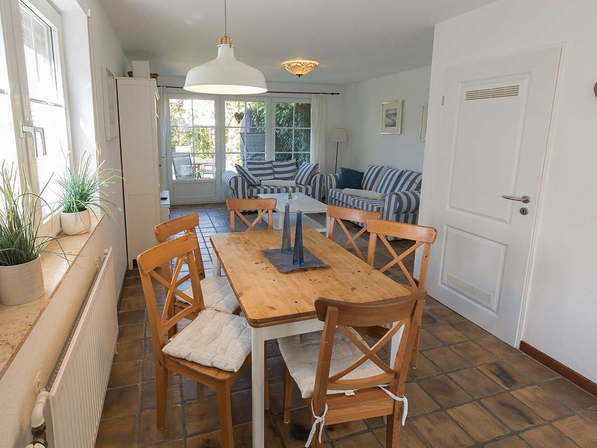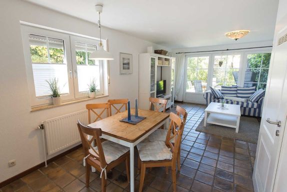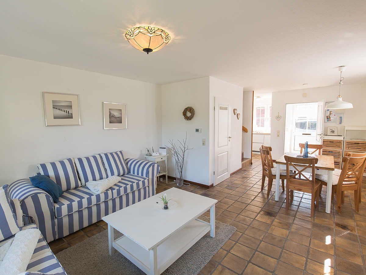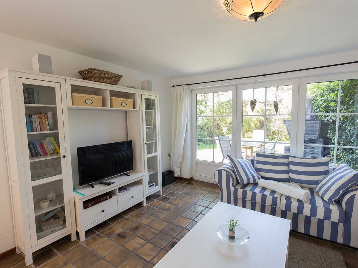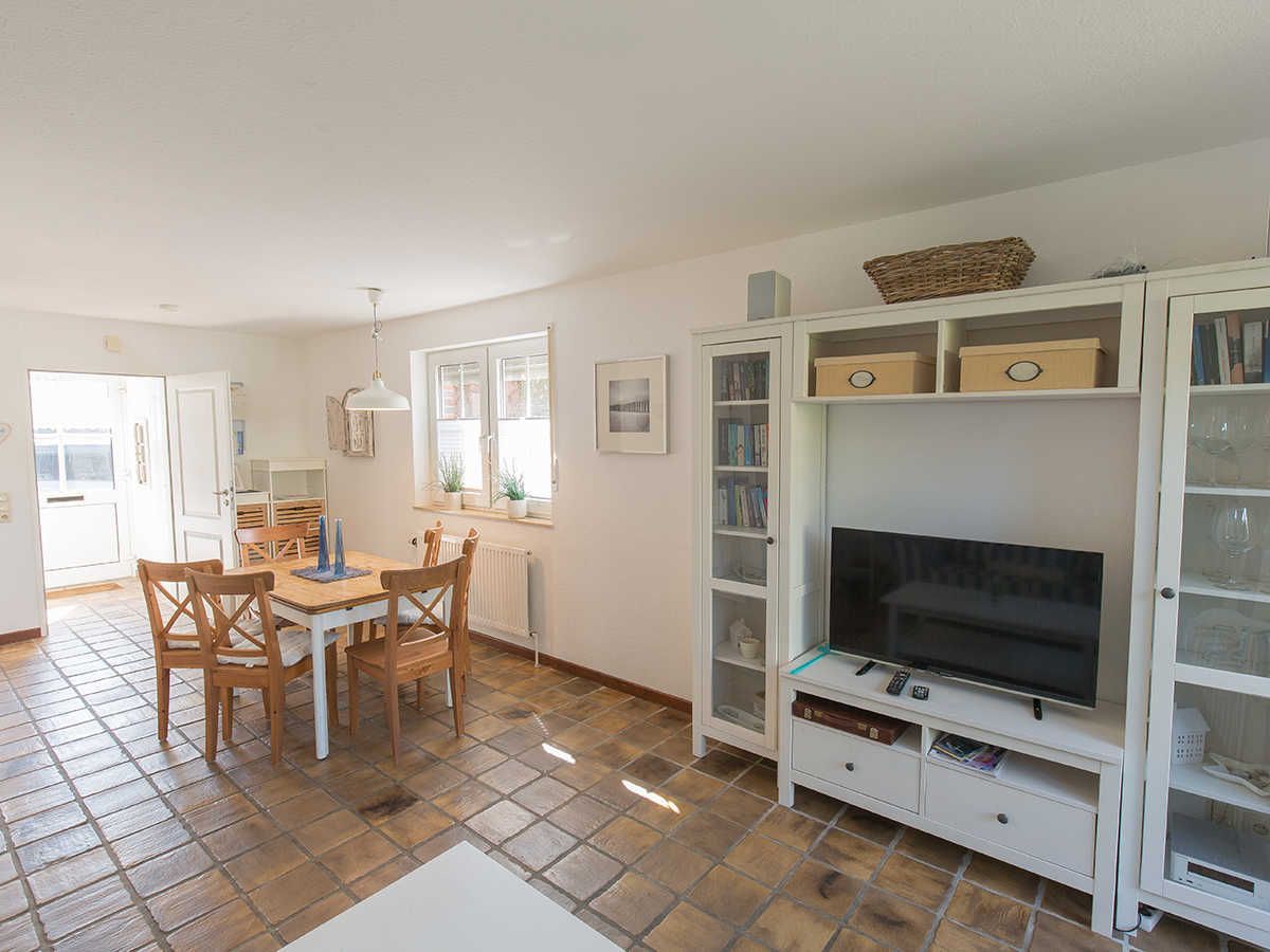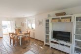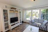 In zweiter Reihe ruhig gelegen betreten Sie das komfortable Ferienhaus. Vom hellen Eingangsbereich mit Garderobe und Gäste-WC gelangen Sie in den geräumigen, kombinierten Wohn-/Essbereich mit mediterraner Möblierung, Flachbild-TV und Radio. Ihr Blick fällt auf das rundherum eingezäunte Grundstück mit Terrasse, Gartenmobiliar, Sonnenschutz und einem Strandkorb.
