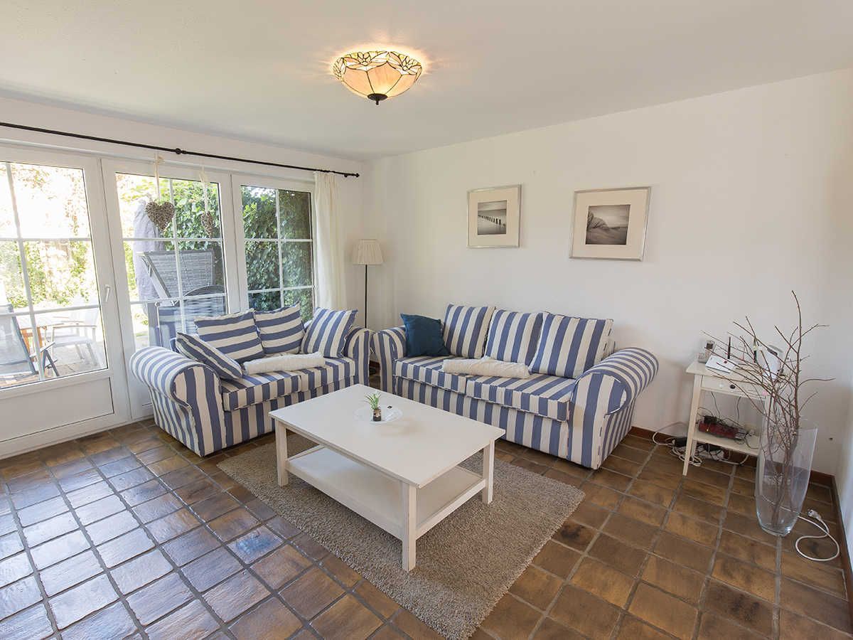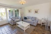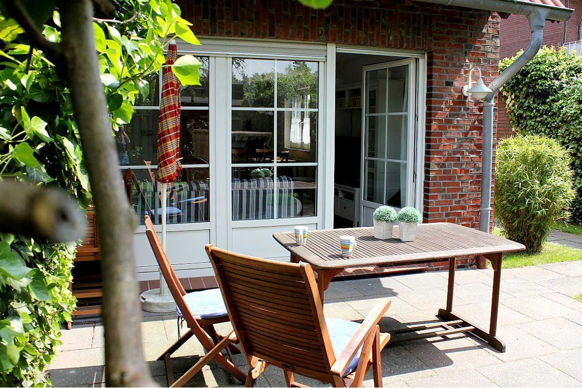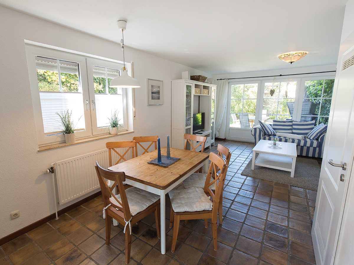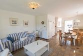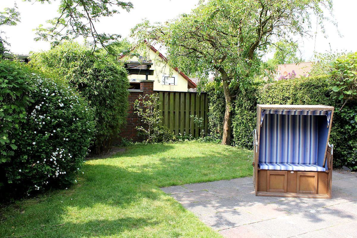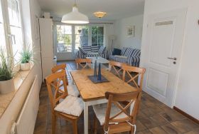 In zweiter Reihe ruhig gelegen betreten Sie das komfortable Ferienhaus. Vom hellen Eingangsbereich mit Garderobe und Gäste-WC gelangen Sie in den geräumigen, kombinierten Wohn-/Essbereich mit mediterraner Möblierung, Flachbild-TV und Radio. Ihr Blick fällt auf das rundherum eingezäunte Grundstück mit Terrasse, Gartenmobiliar, Sonnenschutz und einem Strandkorb.