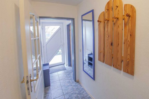 Die ebenerdig gelegene Ferienwohnung Fischer liegt orts- und strandnah mit eigenem Stellplatz direkt vor der Ferienhausanlage. Von einer großzügigen Diele mit Garderobe und Gäste-WC gelangen Sie zunächst in einen weiteren Flurbereich, der zu den anderen Räumen führt.
