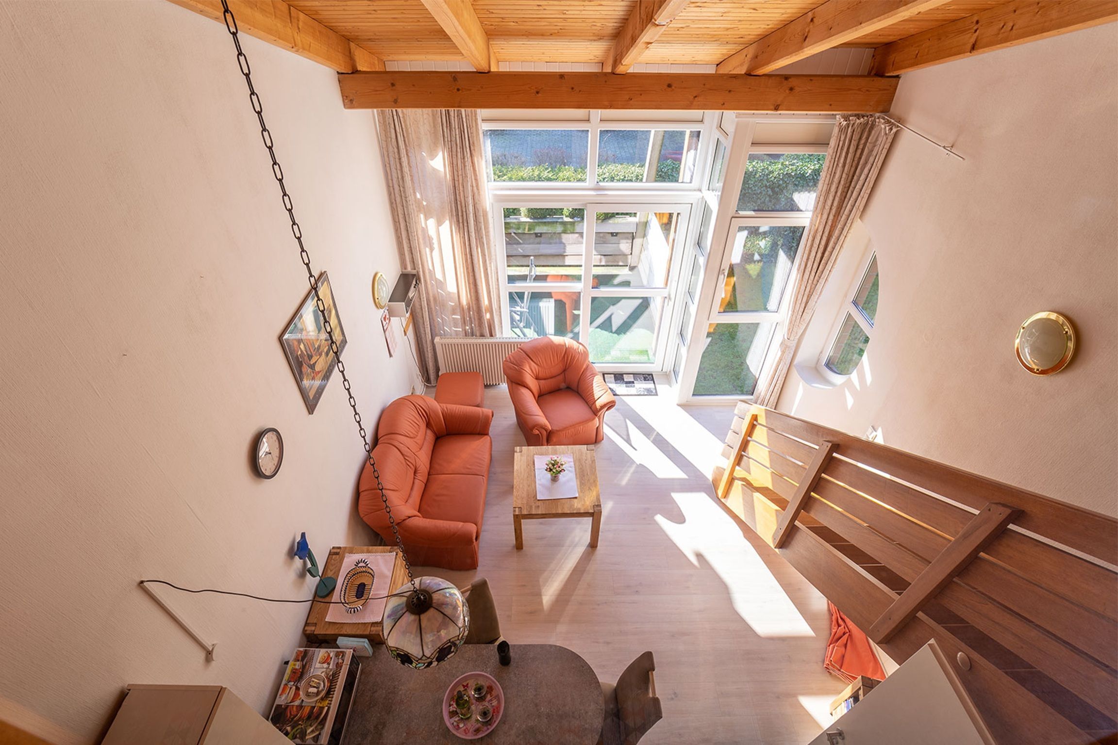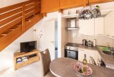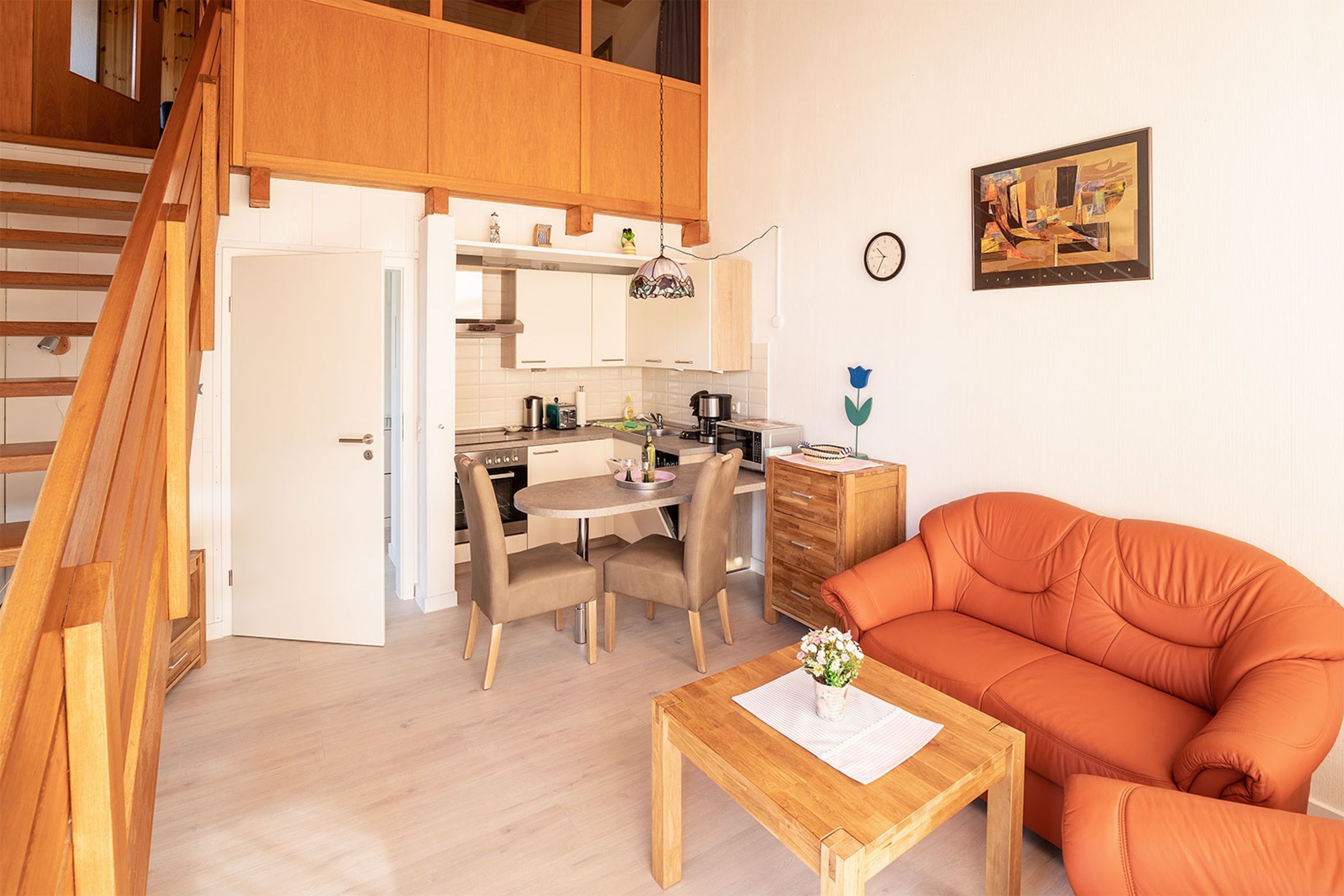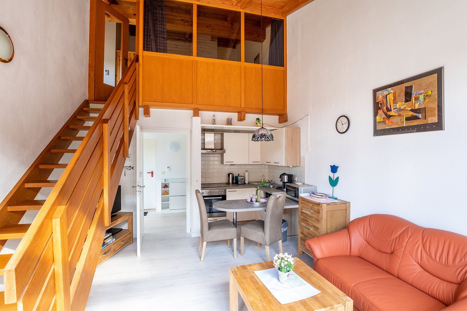 Willkommen in unserer Ferienwohnung Bullauge im Herzen von Dangast. Sie haben einen eigenen Fahrzeug-Stellplatz direkt vor der Ferienhausanlage und Ihr Vierbeiner ist ein gern gesehener Gast. Eine geräumige Diele mit Garderobe und Abstellraum und Zugang zum modern sanierten Badezimmer führt Sie in den Wohn- und Essbereich mit integrierter Küchenzeile und vorgelagertem Essplatz. Hier ist auch der Ausgang zum Balkon in Südlage mit Mobiliar und Sonnenschutz. Eine gerade, offene Holztreppe führt zur geschlossenen Schlafempore.