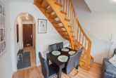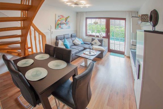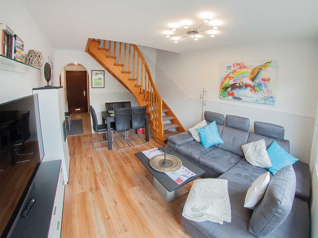 Das Ferienhaus Jadetraum sorgt für eine erholsame Urlaubszeit. In ruhiger Wohnlage auf der Danksteder Straße in Dangast finden Sie unsere familien- und hundefreundliche Unterkunft. Das Haus verfügt über drei Ebenen. Durch den Eingangsbereich mit Garderobe gelangen Sie in das schicke Wohn-/Esszimmer, an welches sich eine Terrasse anschließt. Hier gibt es UHD Smart-TV - Netflix also möglich - Außerdem finden Sie im Erdgeschoss eine separate, gut ausgestattete moderne Küche - mit Espressomaschine - sowie ein Gäste-WC mit Abstellraum und einem Waschtrockner. Über eine offene Holztreppe gelangen Sie zum modernisierten Duschbad und dem Durchgangszimmer mit einem 140x200-Schlafsofa. Die beiden Schlafzimmer liegen auf der ersten Etage und im Dachgeschoß und haben je ein Doppelbett in der Größe 160x200.
