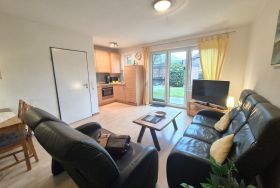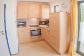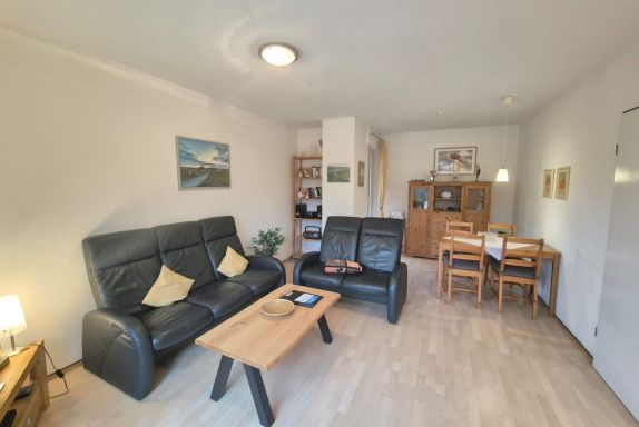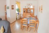 Im Eingangsbereich finden Sie den Flur mit Garderobe und Gäste-WC. Weiter geht's zum kombinierten Küchen-Essbereich mit Kinderhochstuhl und dem gemütlichen Wohnzimmer mit Ausgang zur möblierten Terrasse. Hier genießen Sie die Sonne sichtgeschützt auf der Südseite. Die Wohnung hat Laminatfußboden und Fliesen.