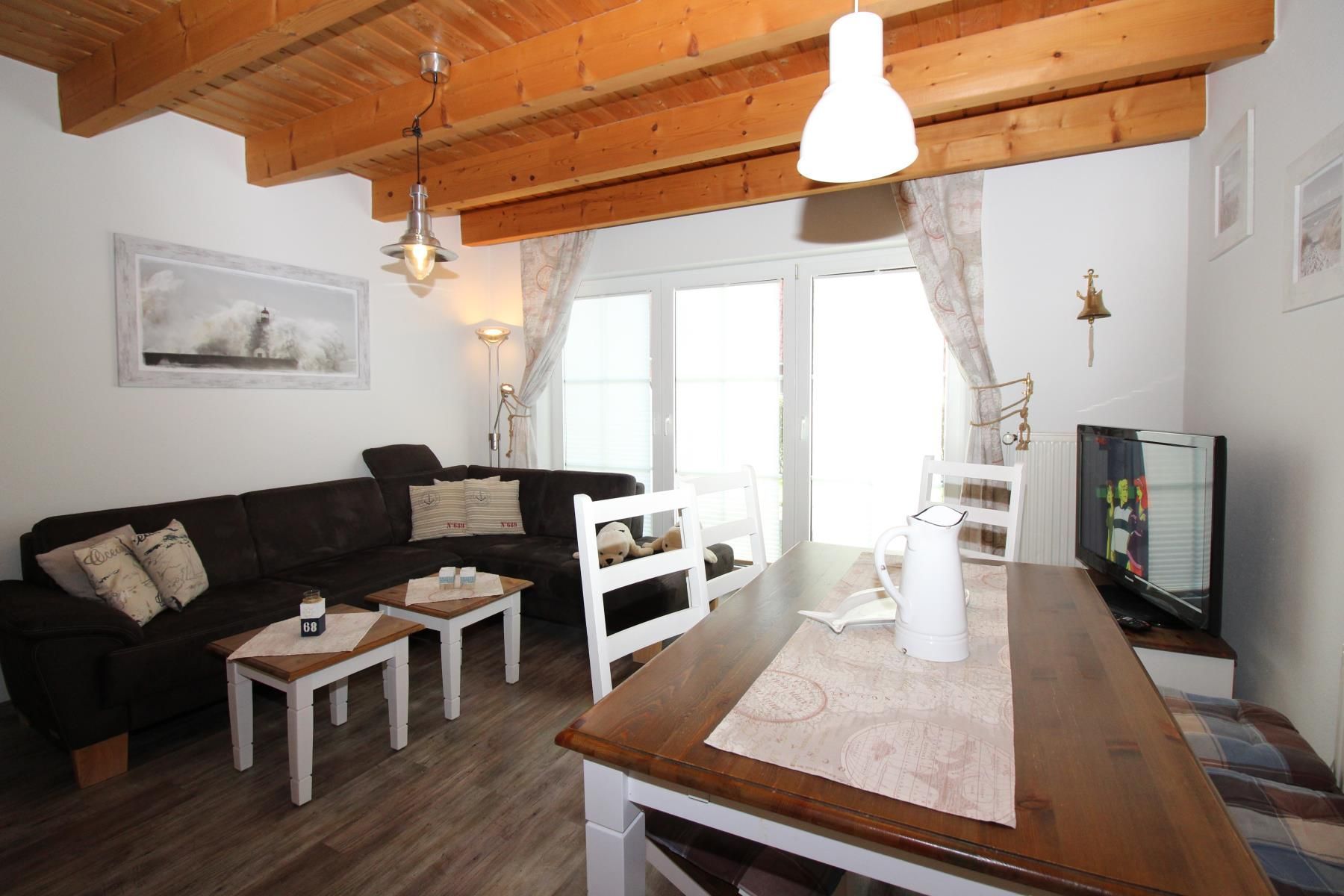 Ein kleiner Flur führt zum behaglichen Wohnraum mit Zugang zur Terrasse. Die voll ausgestattete