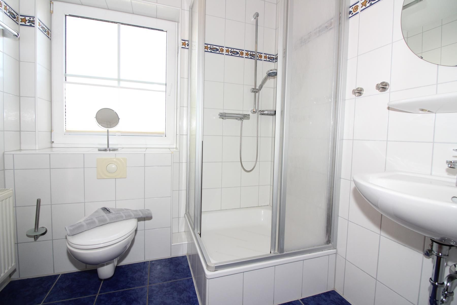 Im Obergeschoss befindet sich das Duschbad mit WC, ein Schlafzimmer mit Doppelbett inkl. LCD TV mit DVD