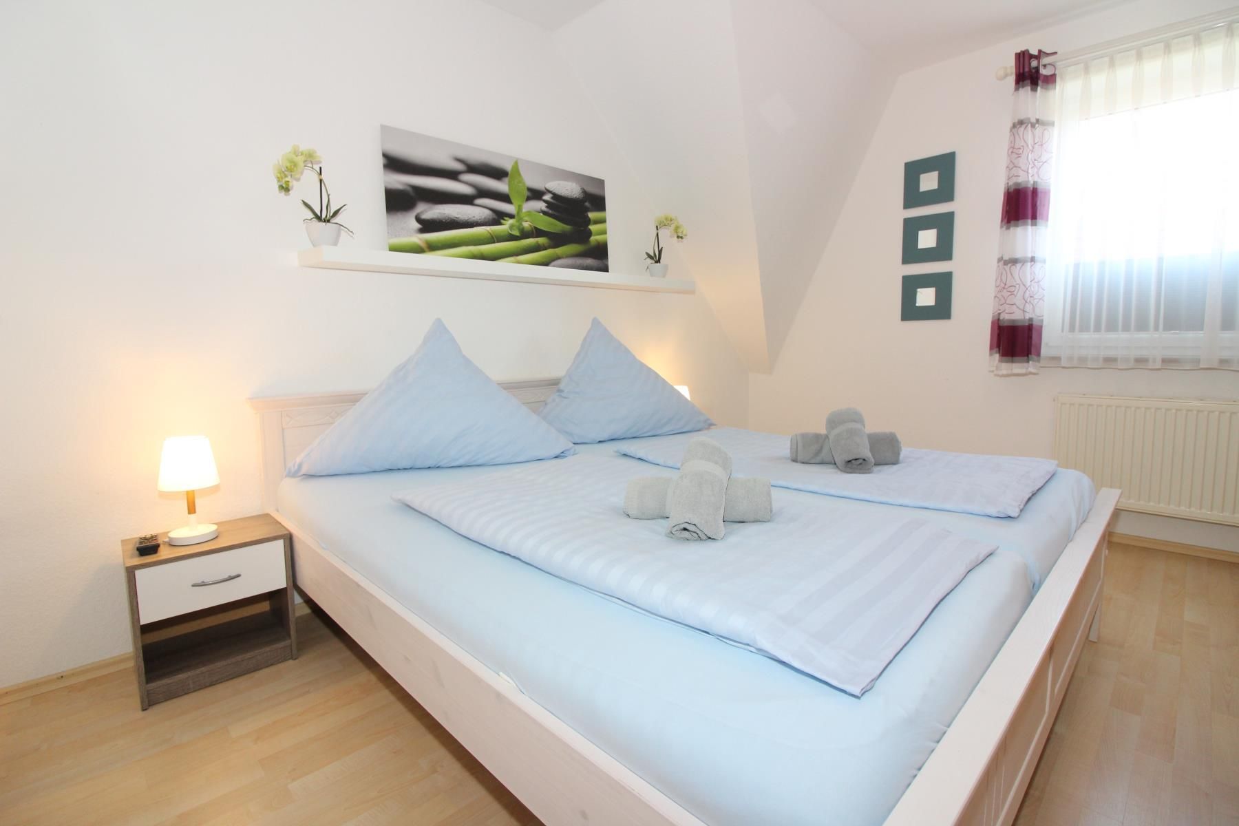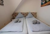 Im Obergeschoss befinden sich, neben dem Duschbad, zwei Schlafzimmer mit jeweils zwei Einzelbetten, die sich bei Bedarf zusammenschieben lassen. Eines der Schlafzimmer verfügt über einen 32-Flachbildschirm.